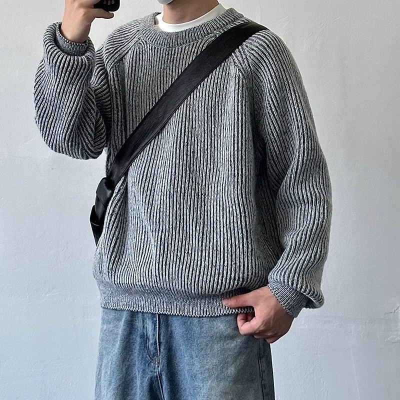 솔리드 컬러 베이스 라운드 넥 수직 패턴 스웨터 남자의 2024 봄과 가을 새로운 느슨한 유행 캐주얼 풀오버 니트 탑스토어 가기