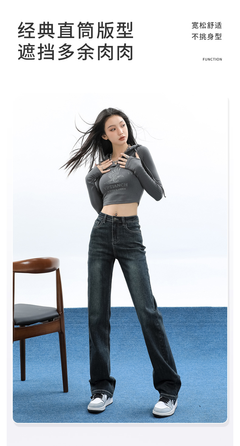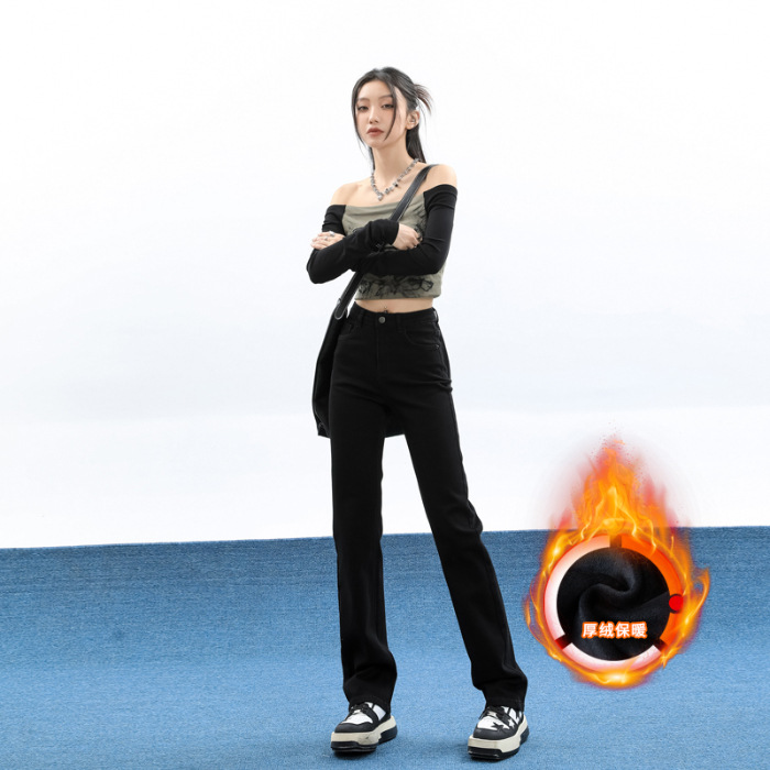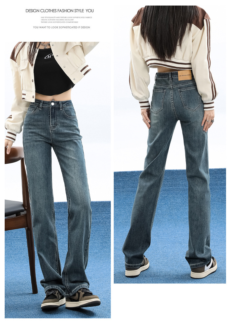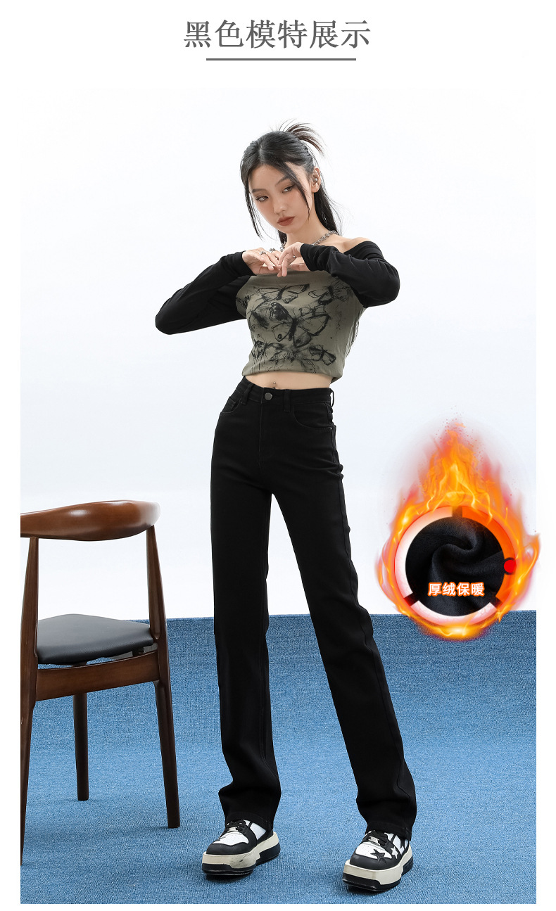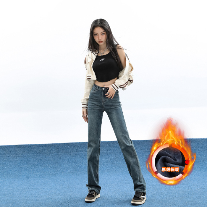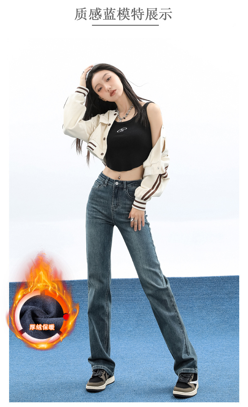 슬림핏 하이웨이스트 탄력성 있는 슬림핏 스트레이트 데님 팬츠 여성용 가을 2025 신상 겨울 기모 스모크 파이프 팬츠스토어 가기