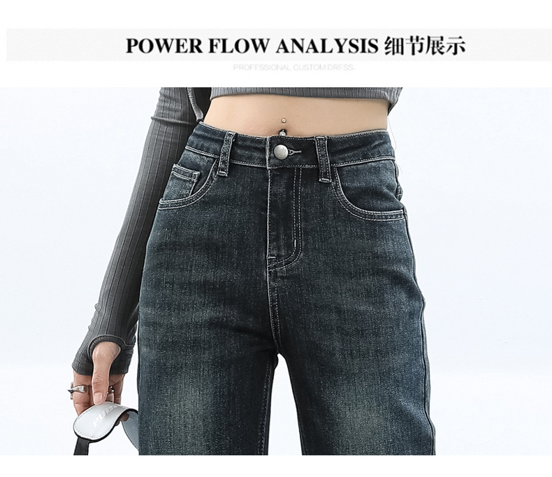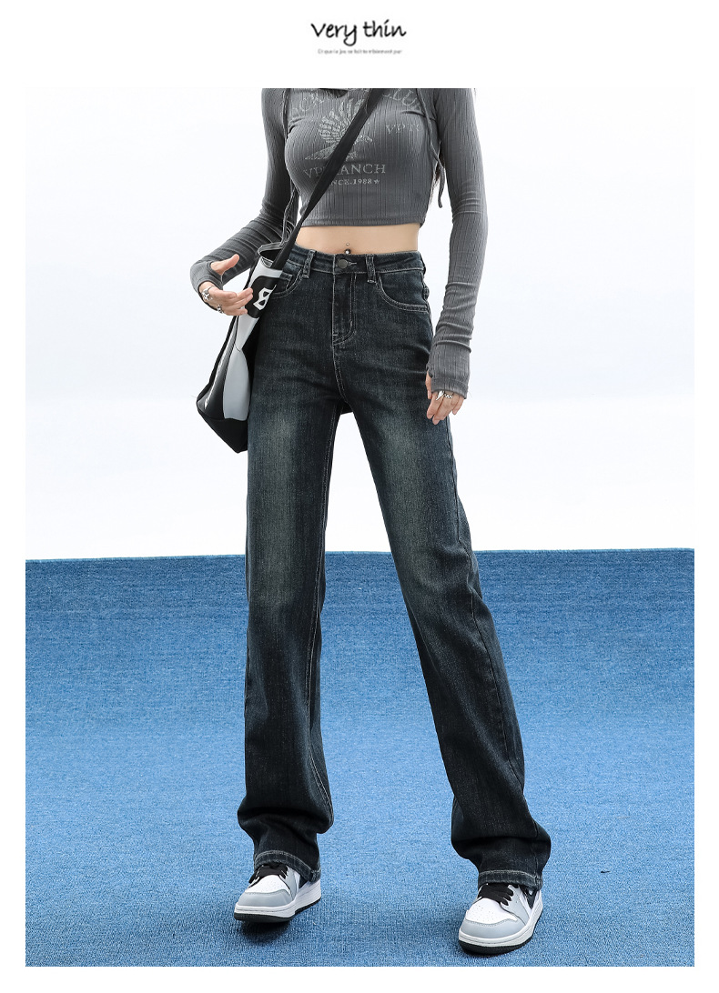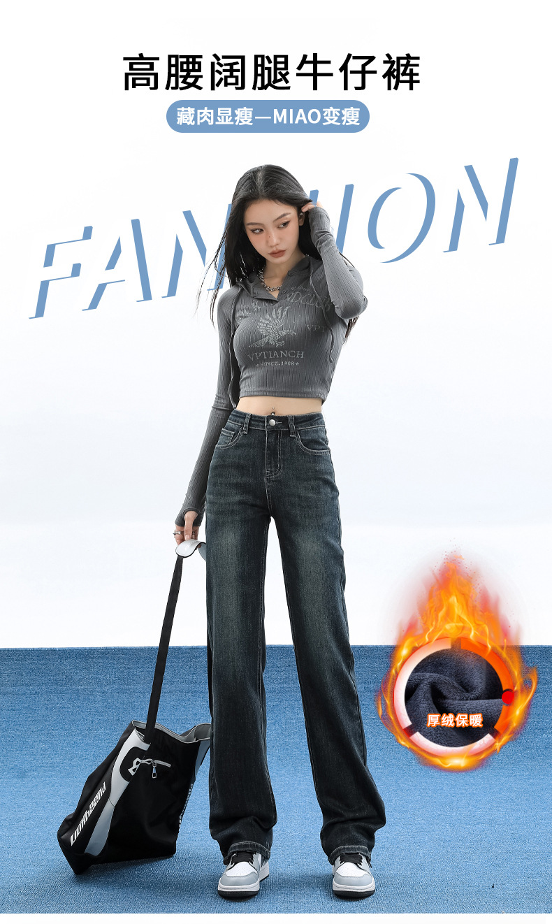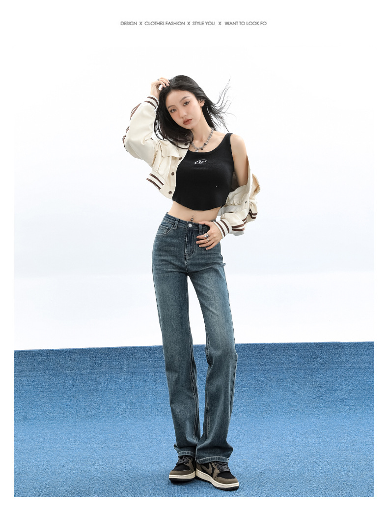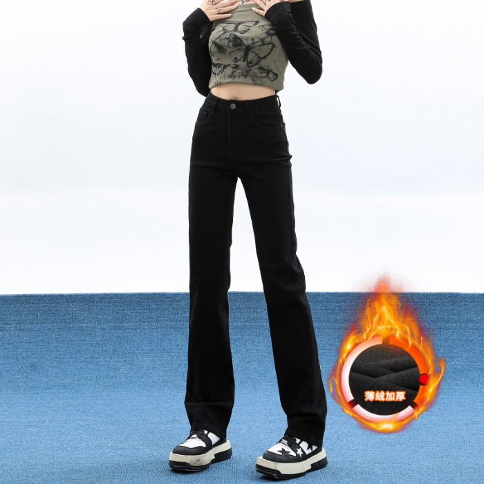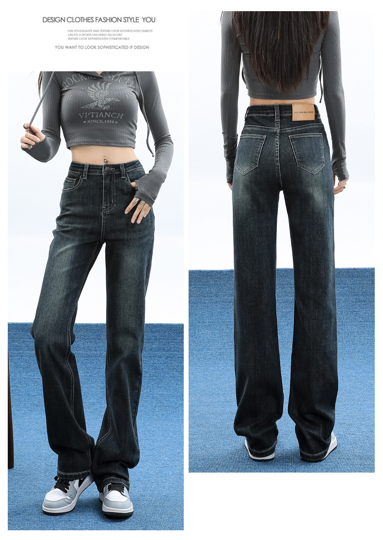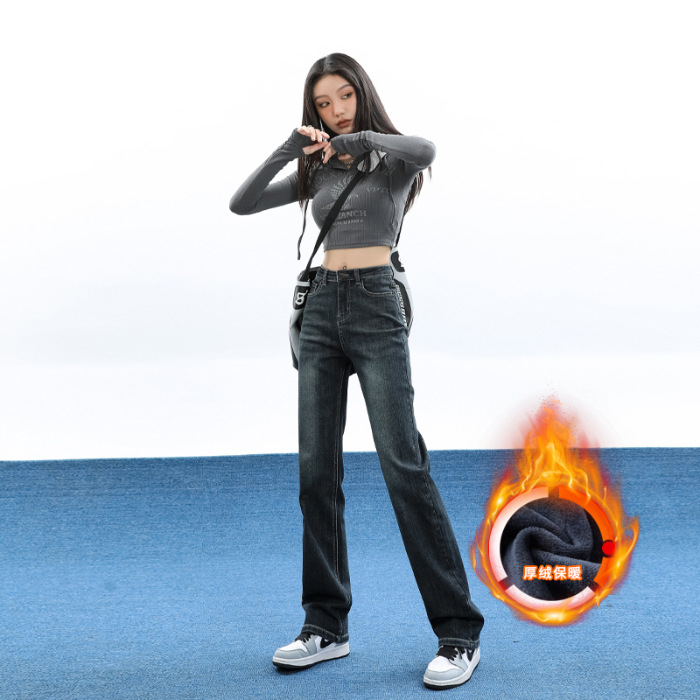 슬림핏 하이웨이스트 탄력성 있는 슬림핏 스트레이트 데님 팬츠 여성용 가을 2025 신상 겨울 기모 스모크 파이프 팬츠스토어 가기