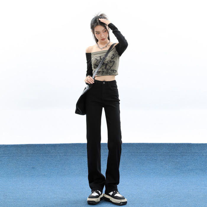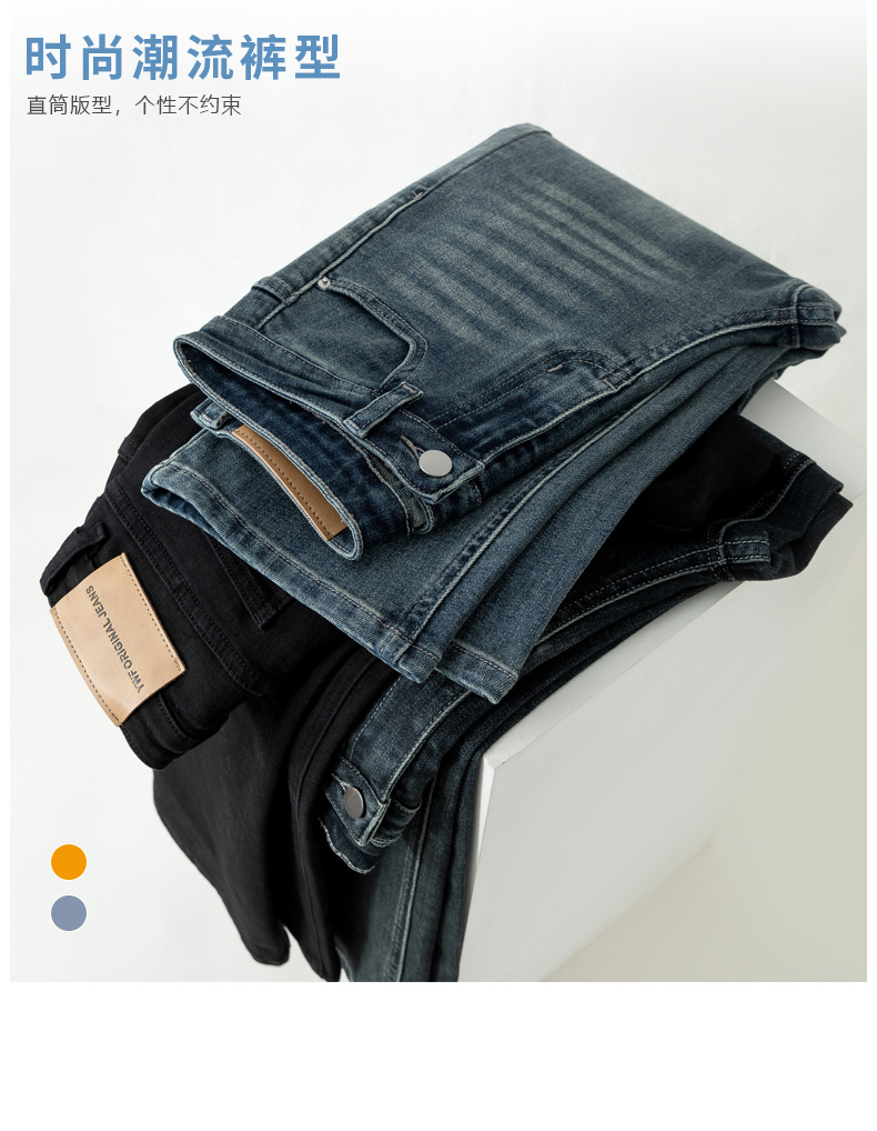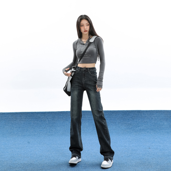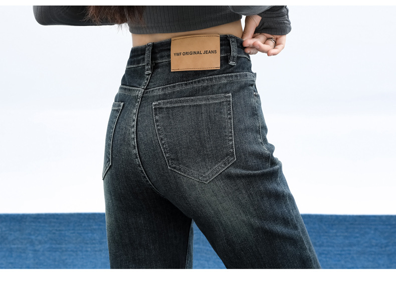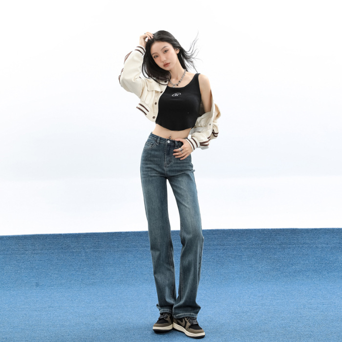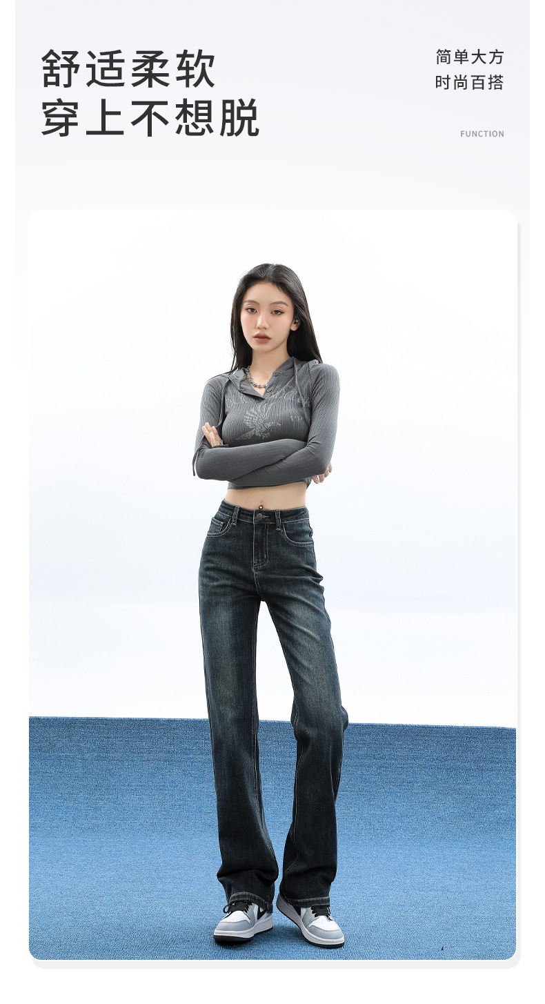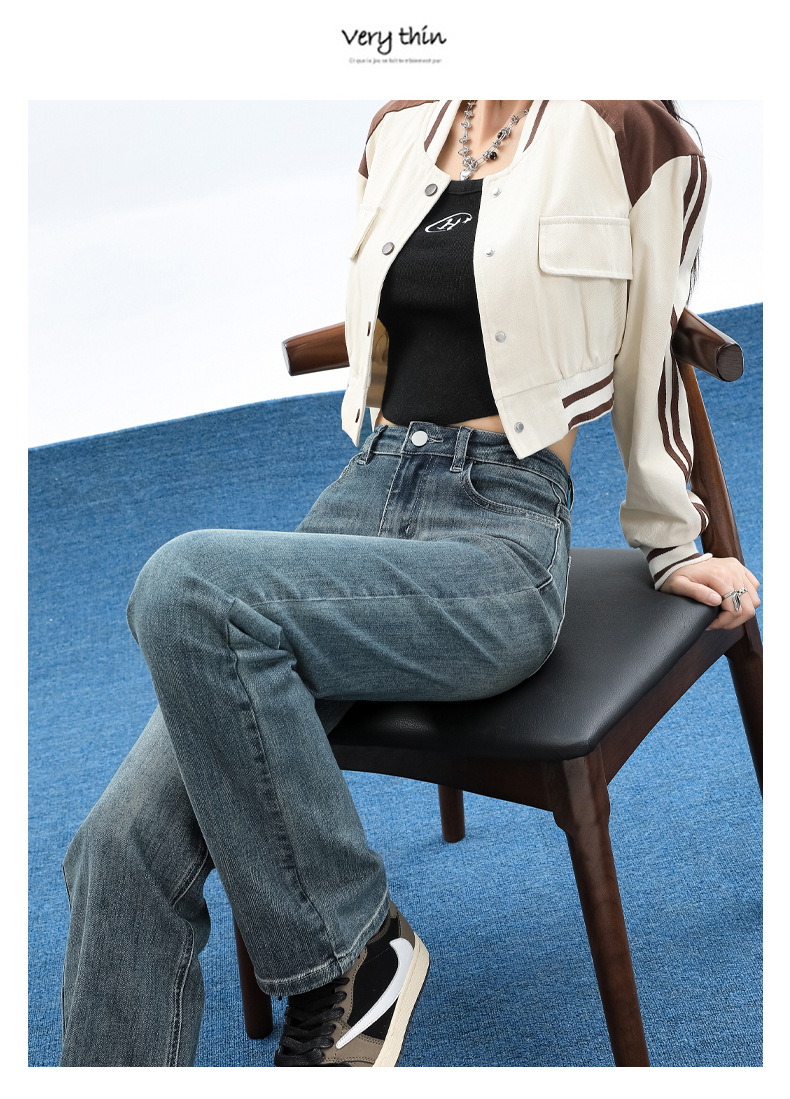 슬림핏 하이웨이스트 탄력성 있는 슬림핏 스트레이트 데님 팬츠 여성용 가을 2025 신상 겨울 기모 스모크 파이프 팬츠스토어 가기