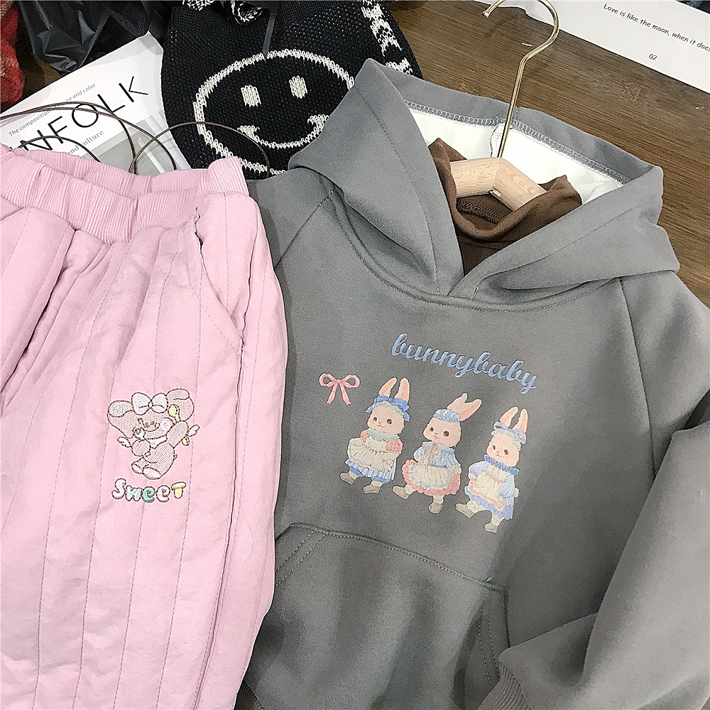 여자 후드 토끼 스웨터 한국 스타일 겨울 기모 탑 핑크 기모 면화 바지 대외 무역을위한 올매치 코 캐주얼 바지