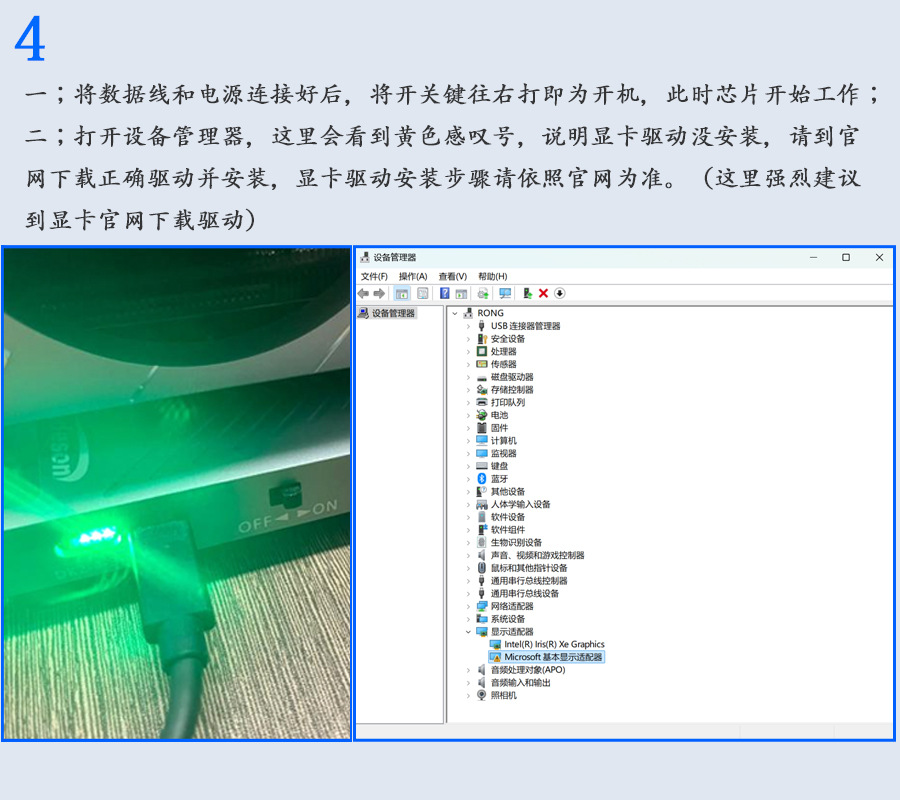 本产品雷电数据线支持热插拔(不要在程序或显卡工作运行中插拔数据线,容易导致崩溃),建议在笔记本电脑开机进入系统后,再连接开机显卡扩展坞或者开机进入系统后再打开显卡扩展坞的开关,即可识别到相应的显卡;