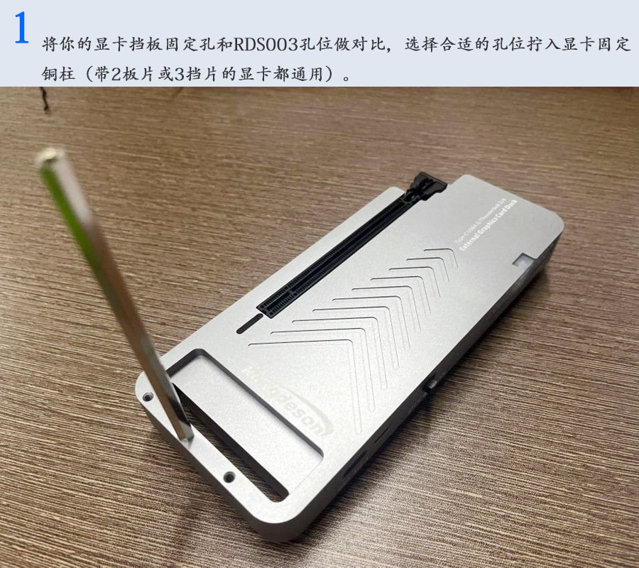 (1)此款产品主要以接显卡为主,外壳采用铝合金CNC工艺,即起到保护PCB板的同时也起到散热作用。由于采用开发式设计,所以对于任何尺寸的显卡都可兼容。如有用户需要使用带有保护显卡的外箱,请选用本品牌的RDS001型号的显卡扩展坞。