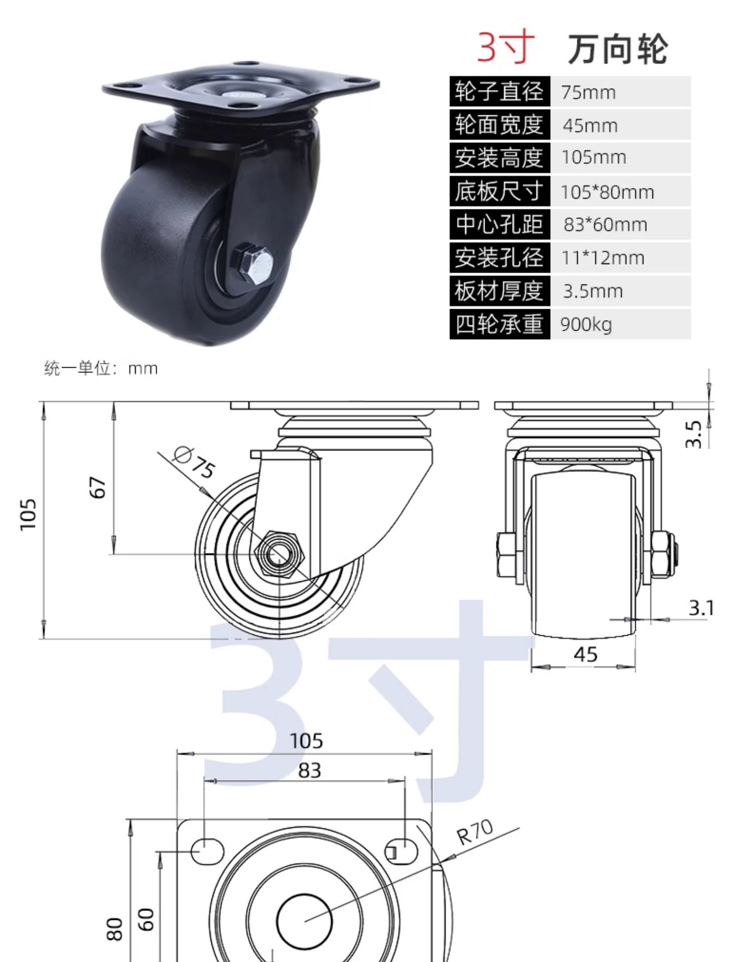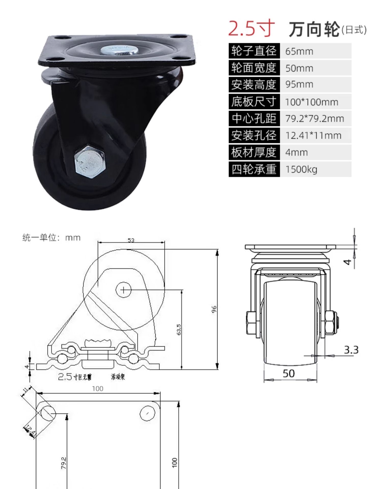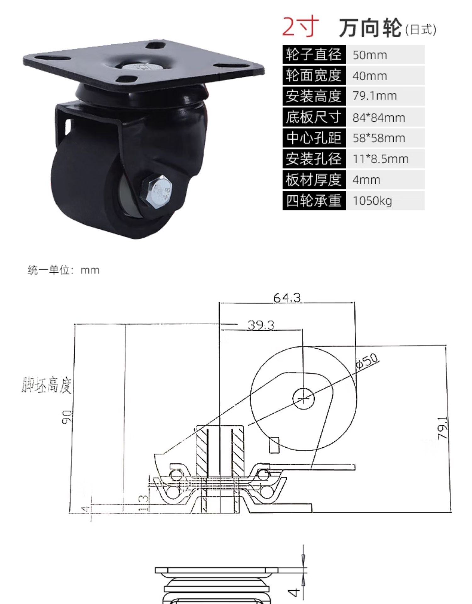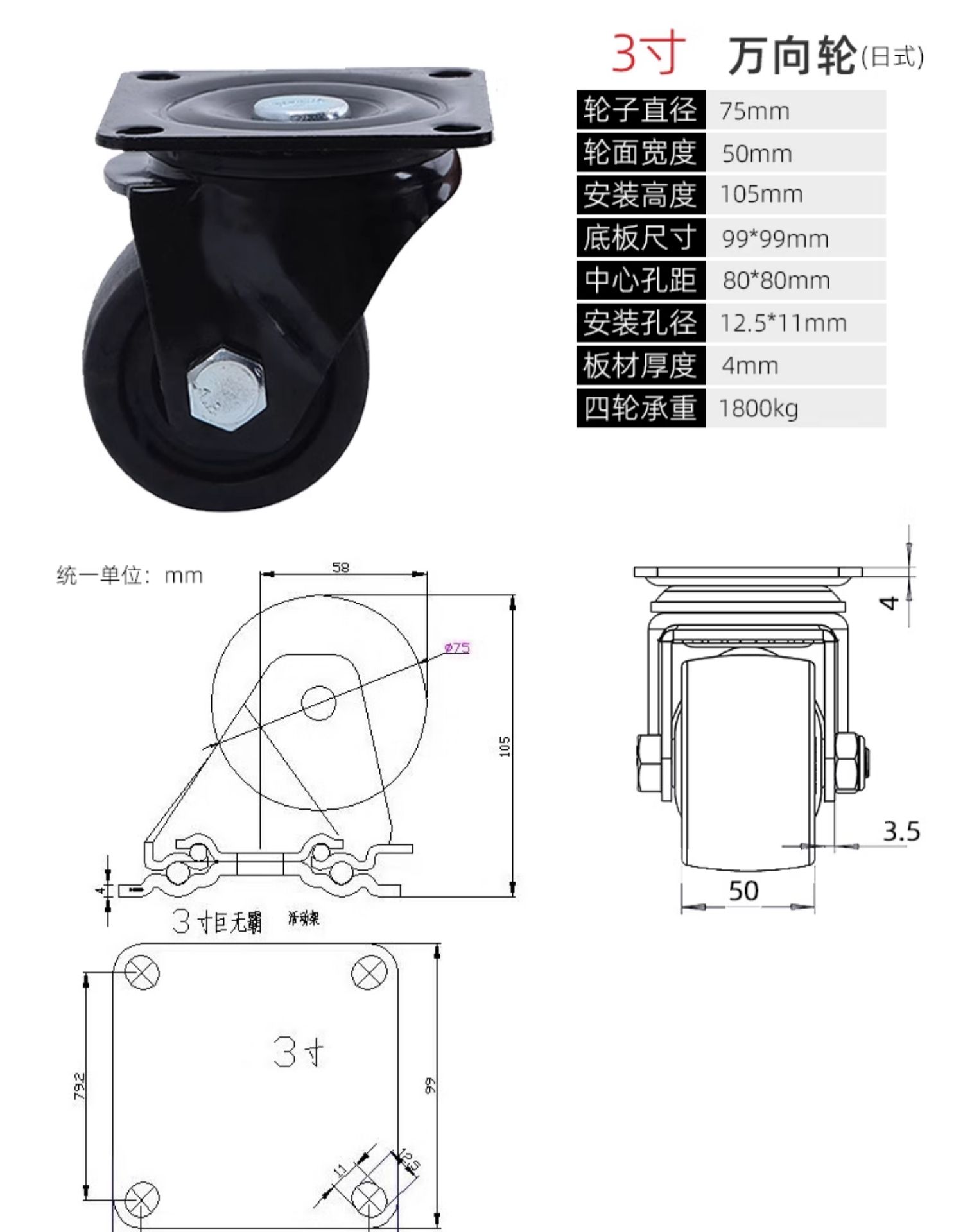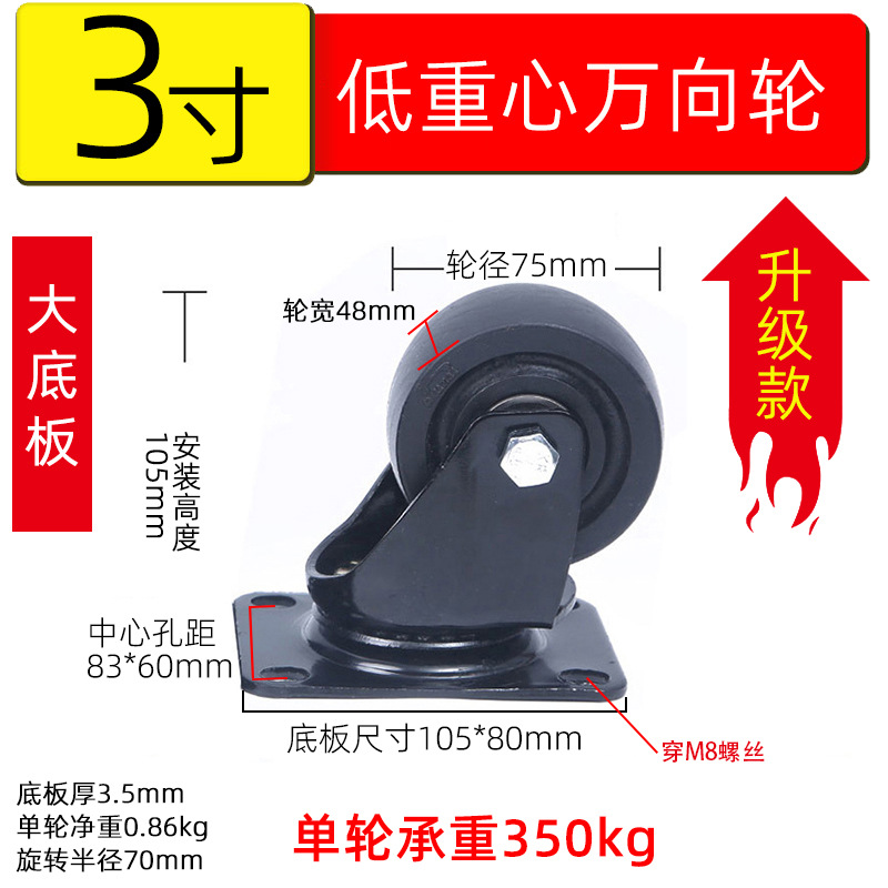 • 3inch 소형 베이스 플레이트 범용 단일 휠 베어링 350kg