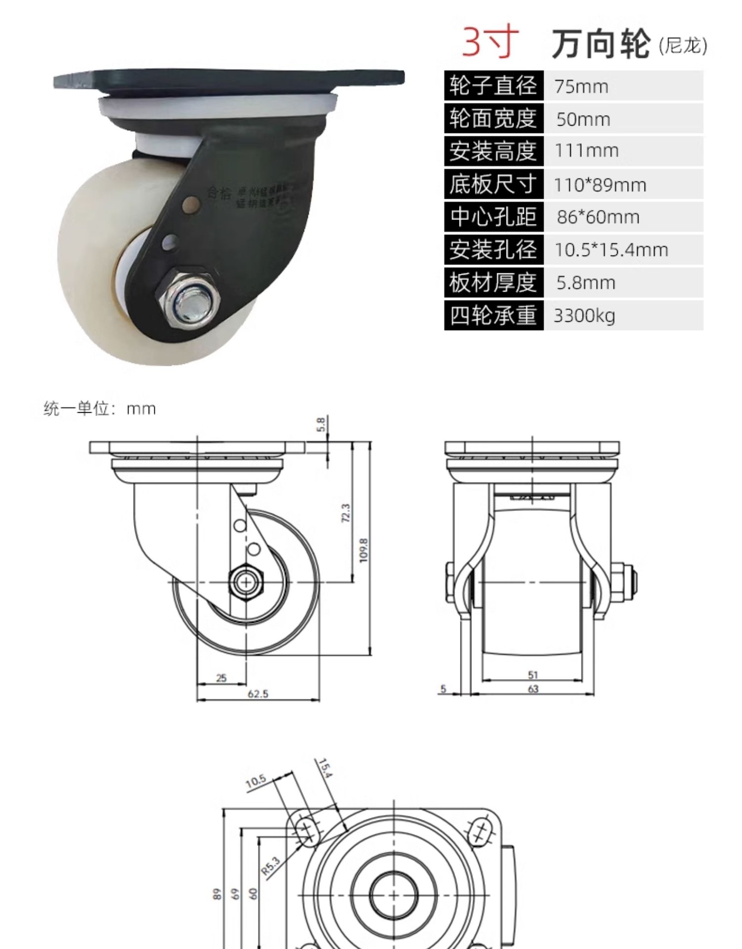 • 3inch 흰색 범용 단일 휠 베어링 350kg