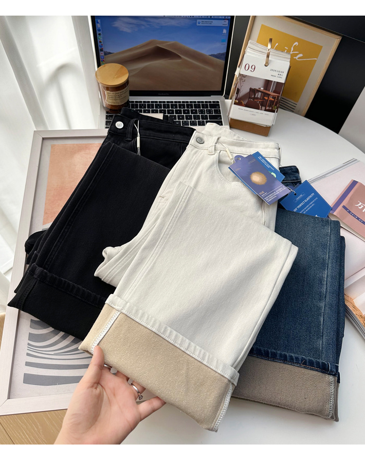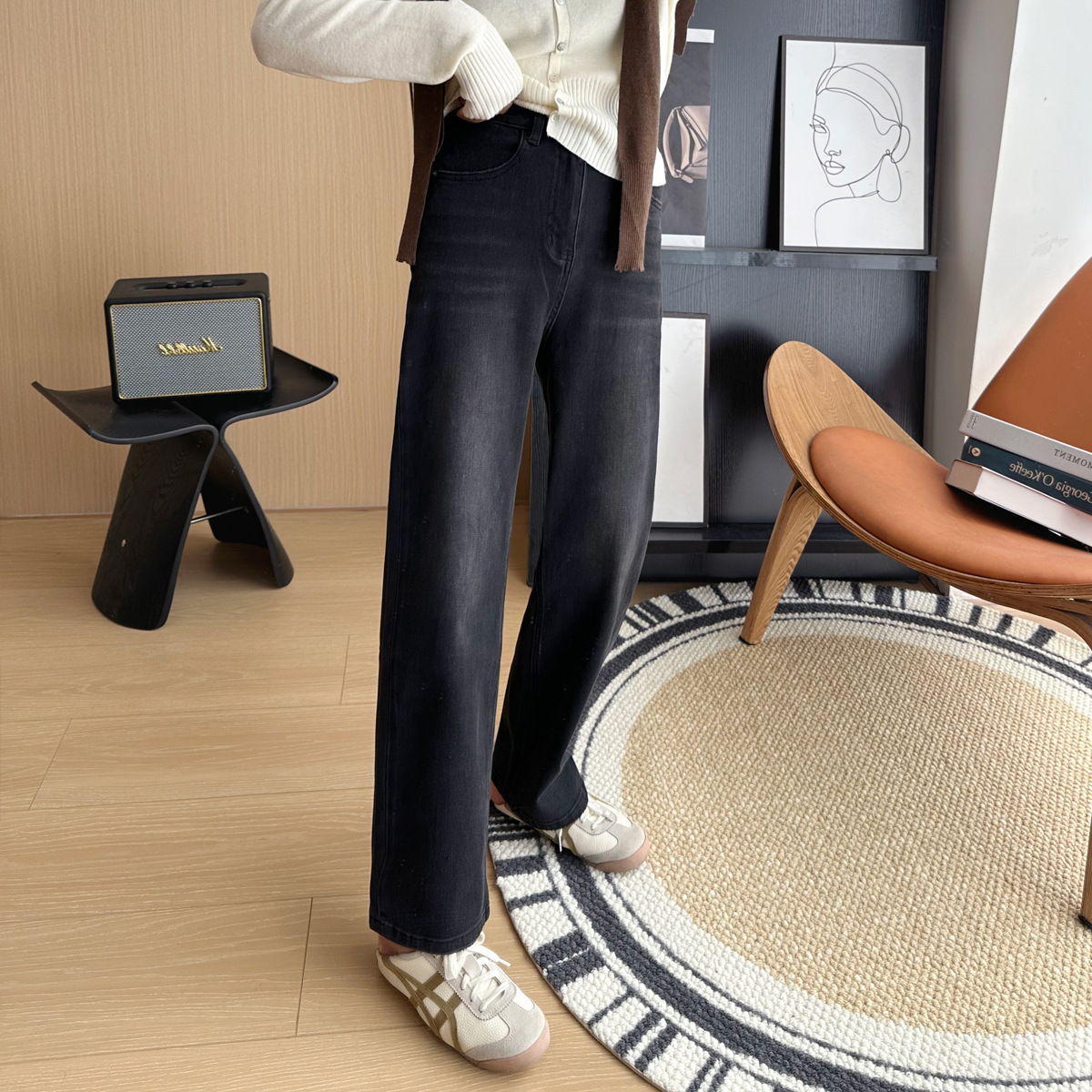 왕 튀김 좋은 상품! 가을과 겨울 4 면 탄성 좁은 기모 청바지 여성 휴식 좁은 연약한 와이드 레그 바지