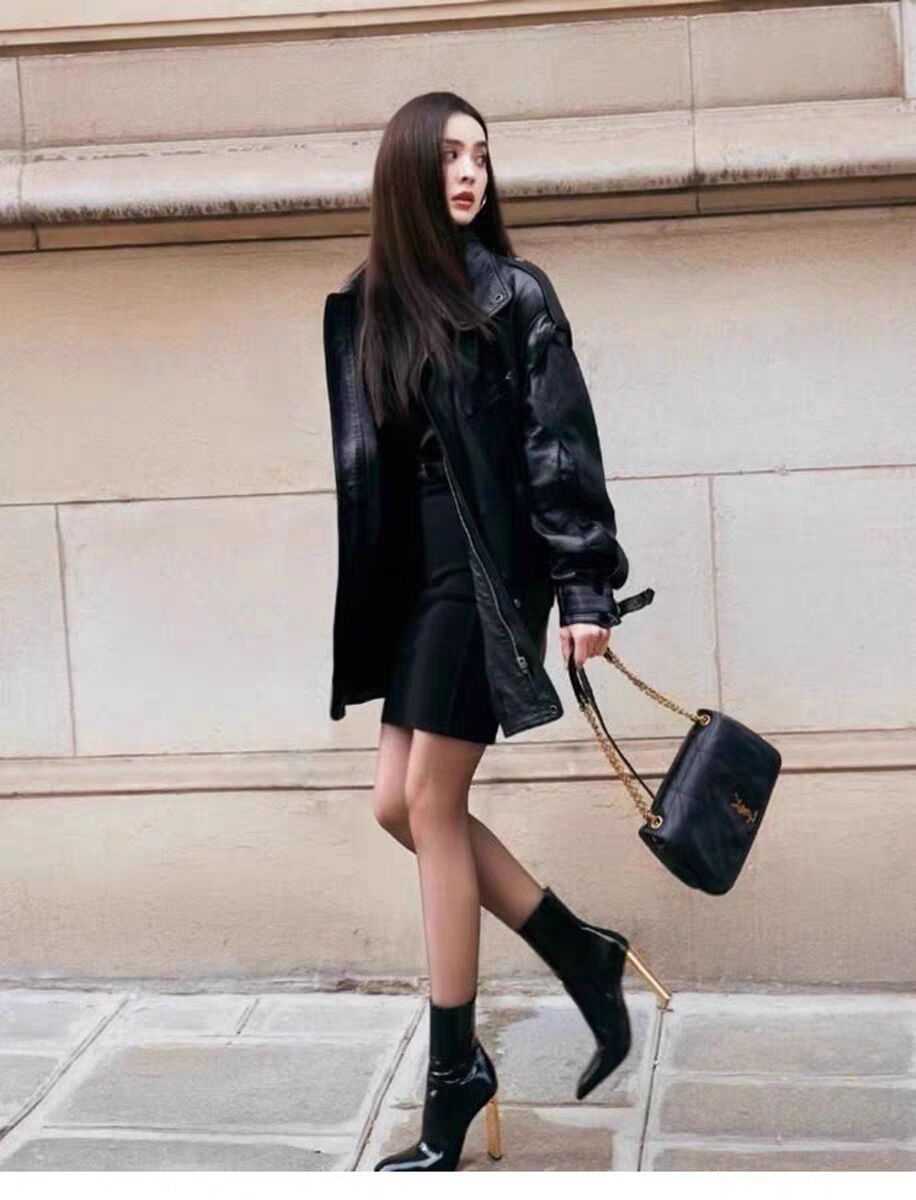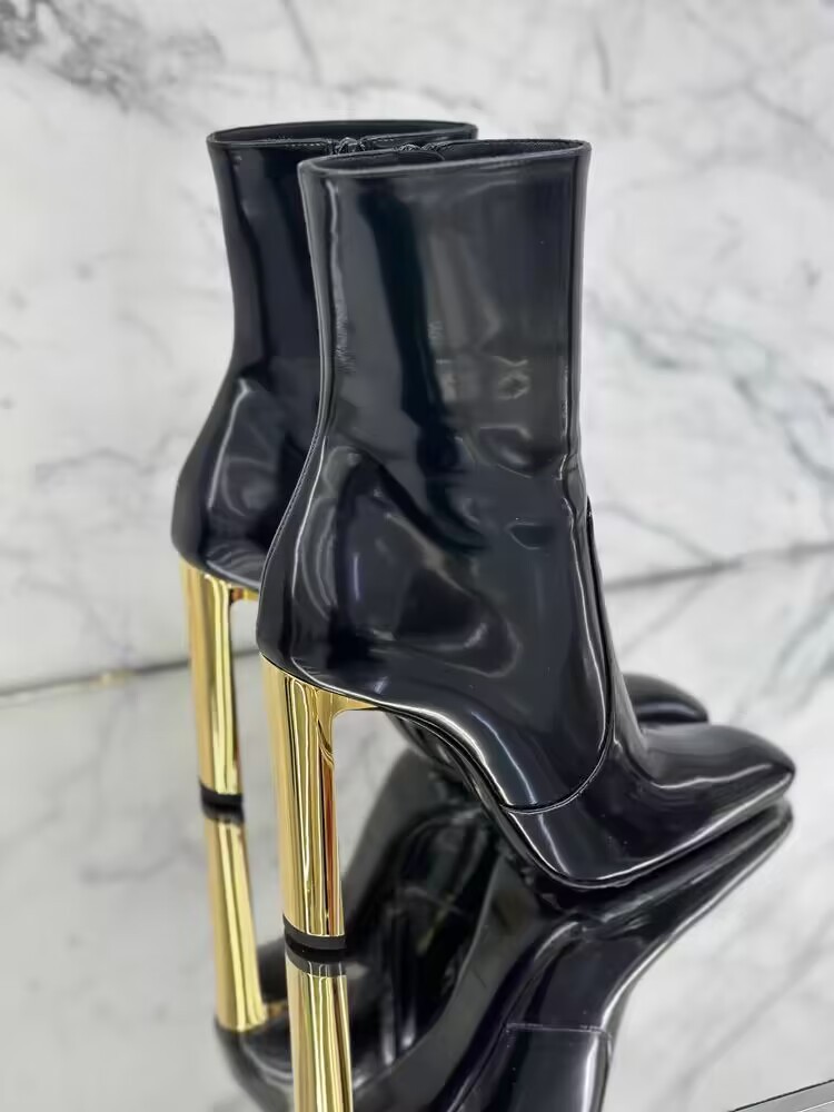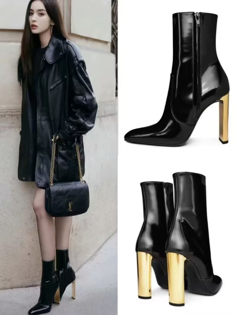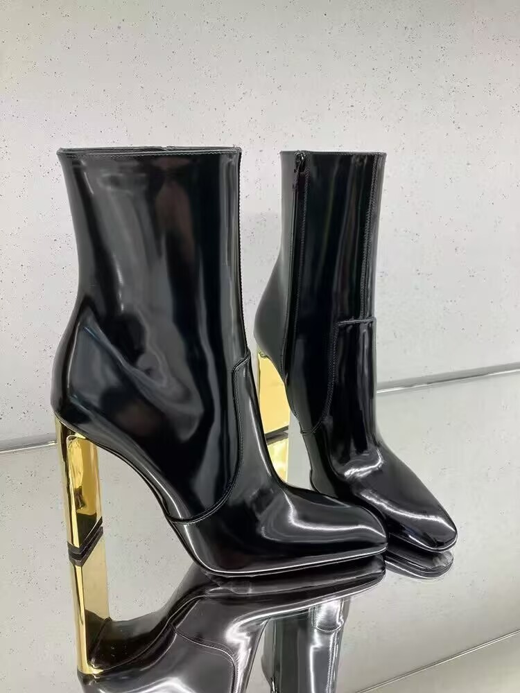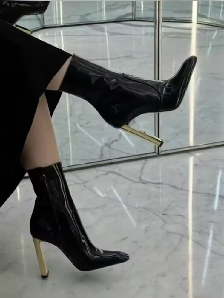 유럽 및 미국 스타일의 금속 도금과 미러 가죽으로 제작된 뾰족코 숏부츠, 사이드 지퍼가 있는 소가죽 초하이힐 패션 부츠, 패셔너블하고 다재다능함스토어 가기