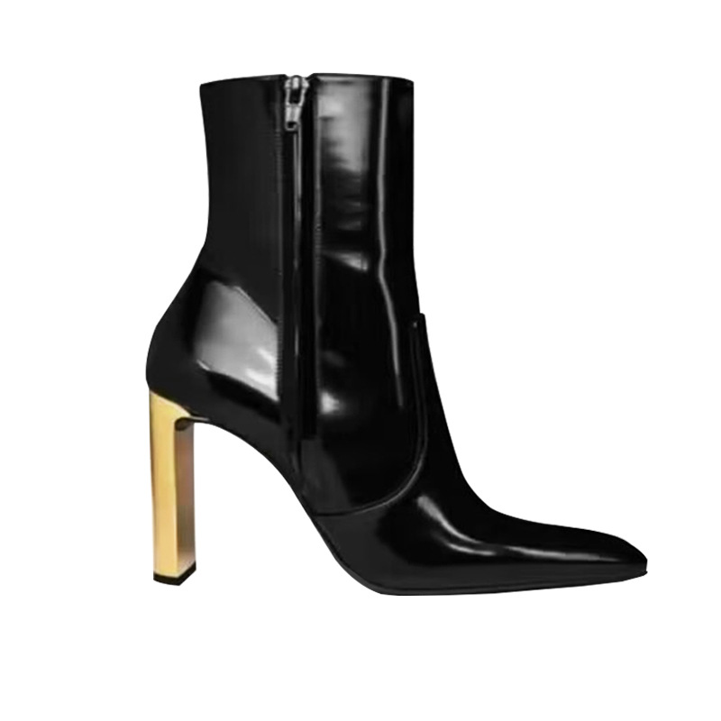 유럽 및 미국 스타일의 금속 도금과 미러 가죽으로 제작된 뾰족코 숏부츠, 사이드 지퍼가 있는 소가죽 초하이힐 패션 부츠, 패셔너블하고 다재다능함