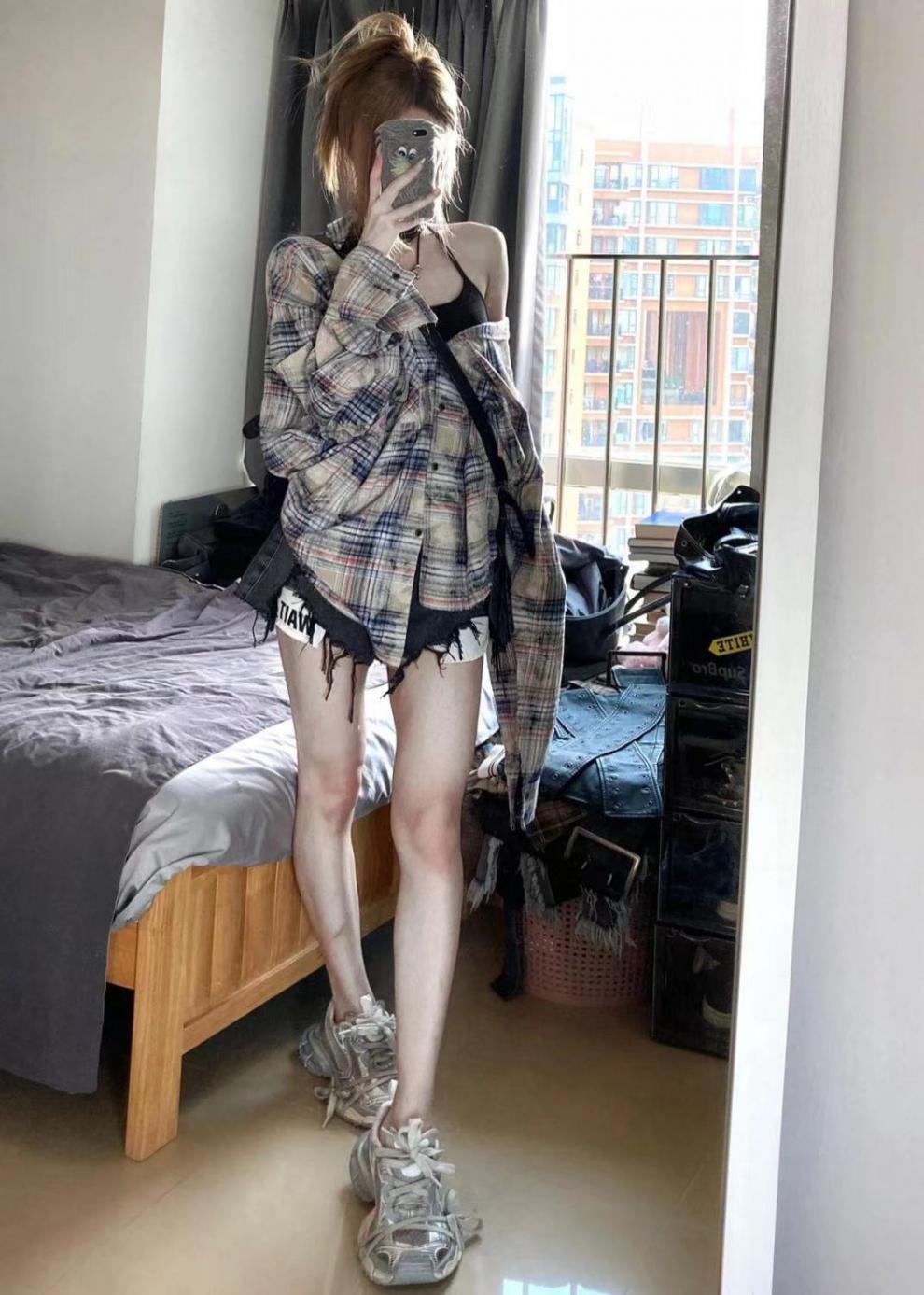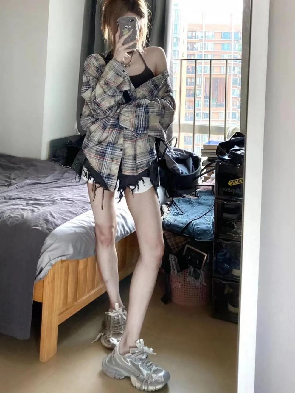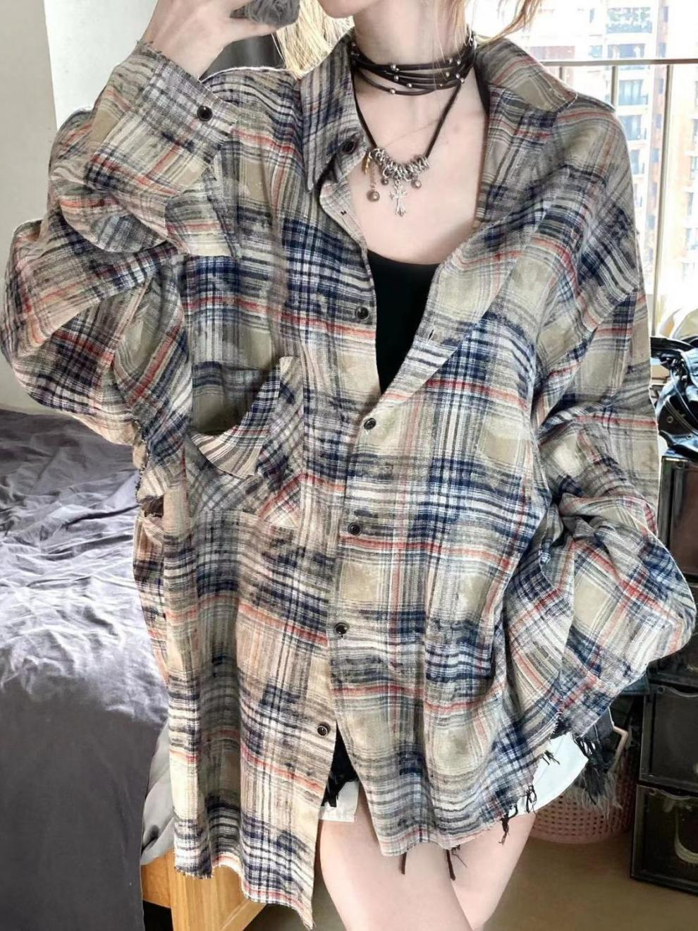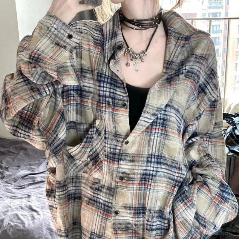 홍콩 스타일 빈티지 세련된 스티칭 대비 컬러 격자 무늬 셔츠 여성의 느슨한 캐주얼 슬리밍 중간 길이 커플 셔츠스토어 가기