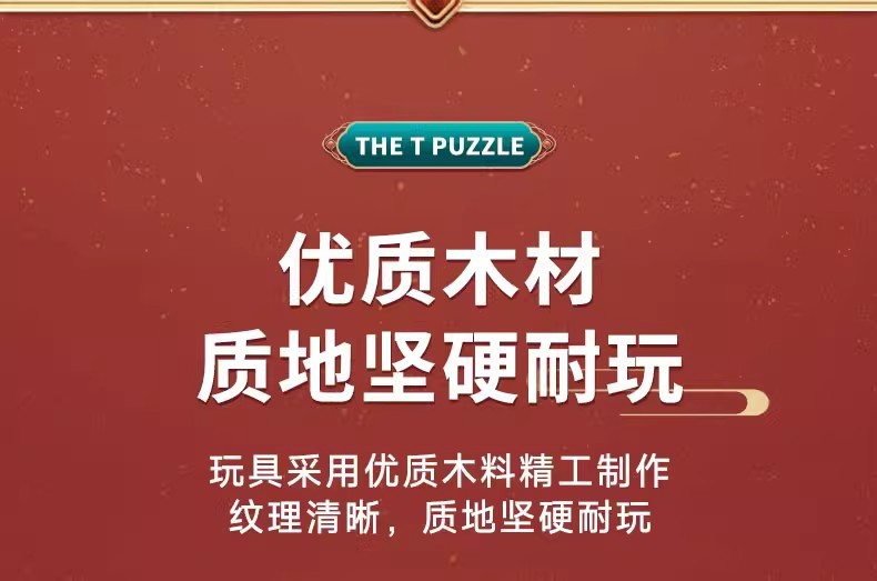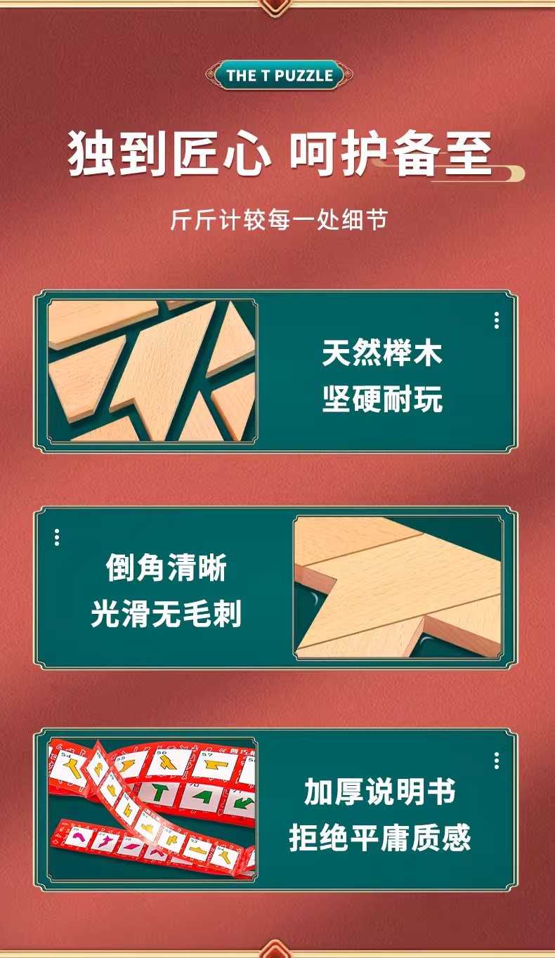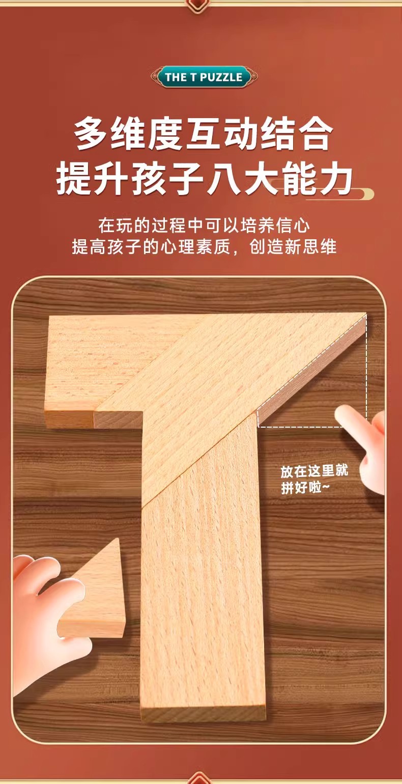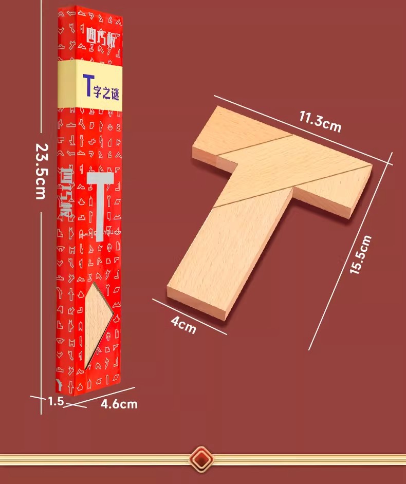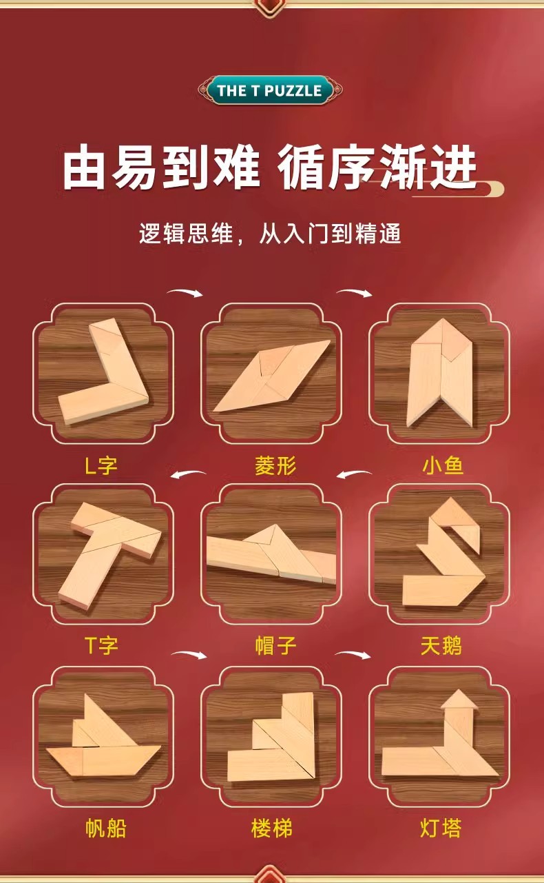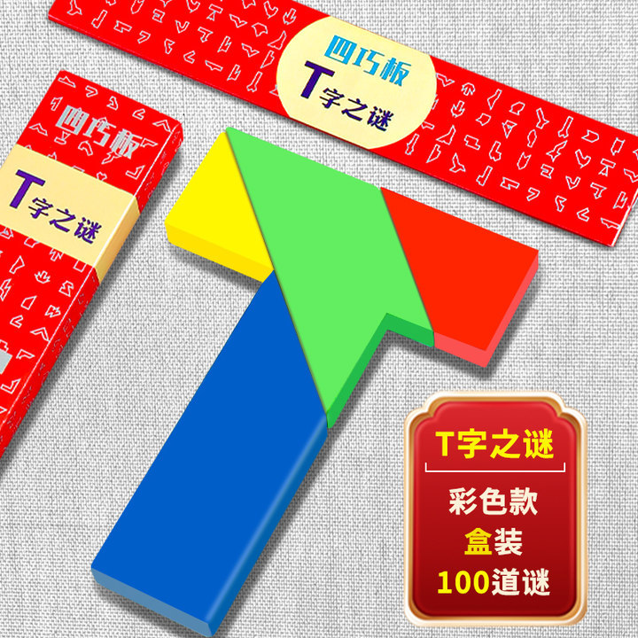 T字之谜也叫四巧板 是由4块不同形状的木块组成,用这四块木板拼出内附的小册子上的100个图形,从易到难 不断挑战自我,这款玩具看似简单,其实奥妙颇深,每一角度,转一个方向 换一个平面...它又有不同的花样哦。