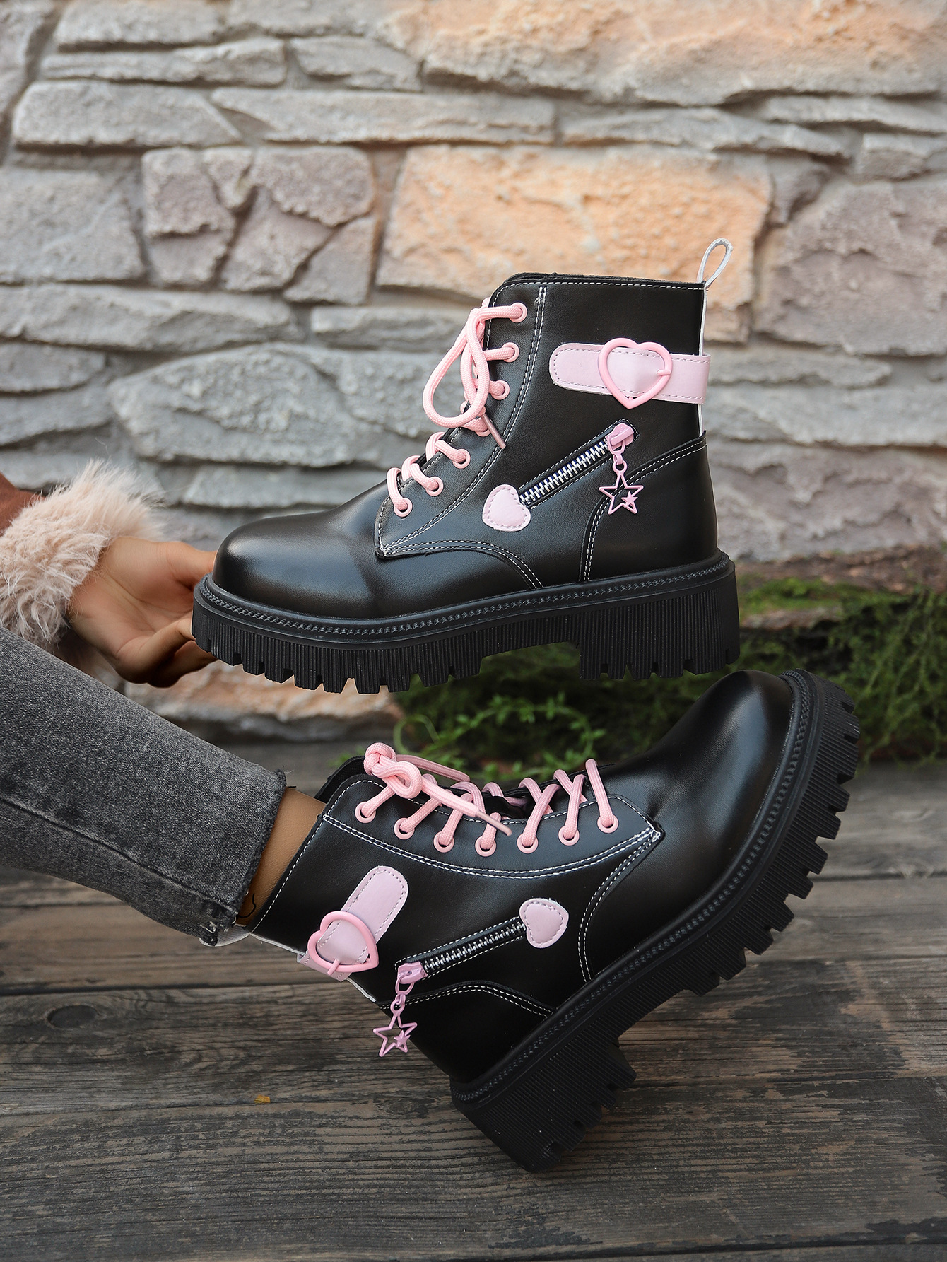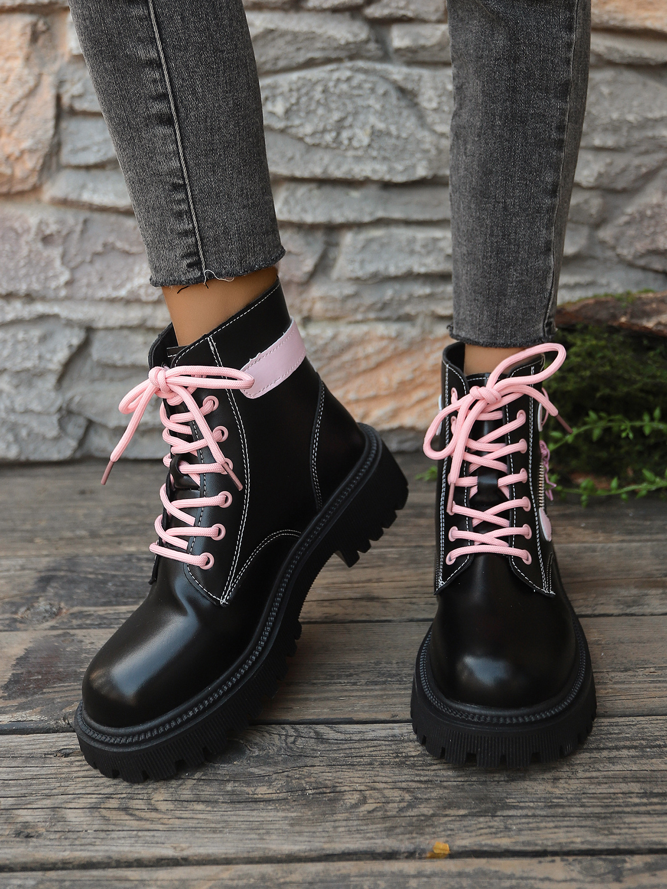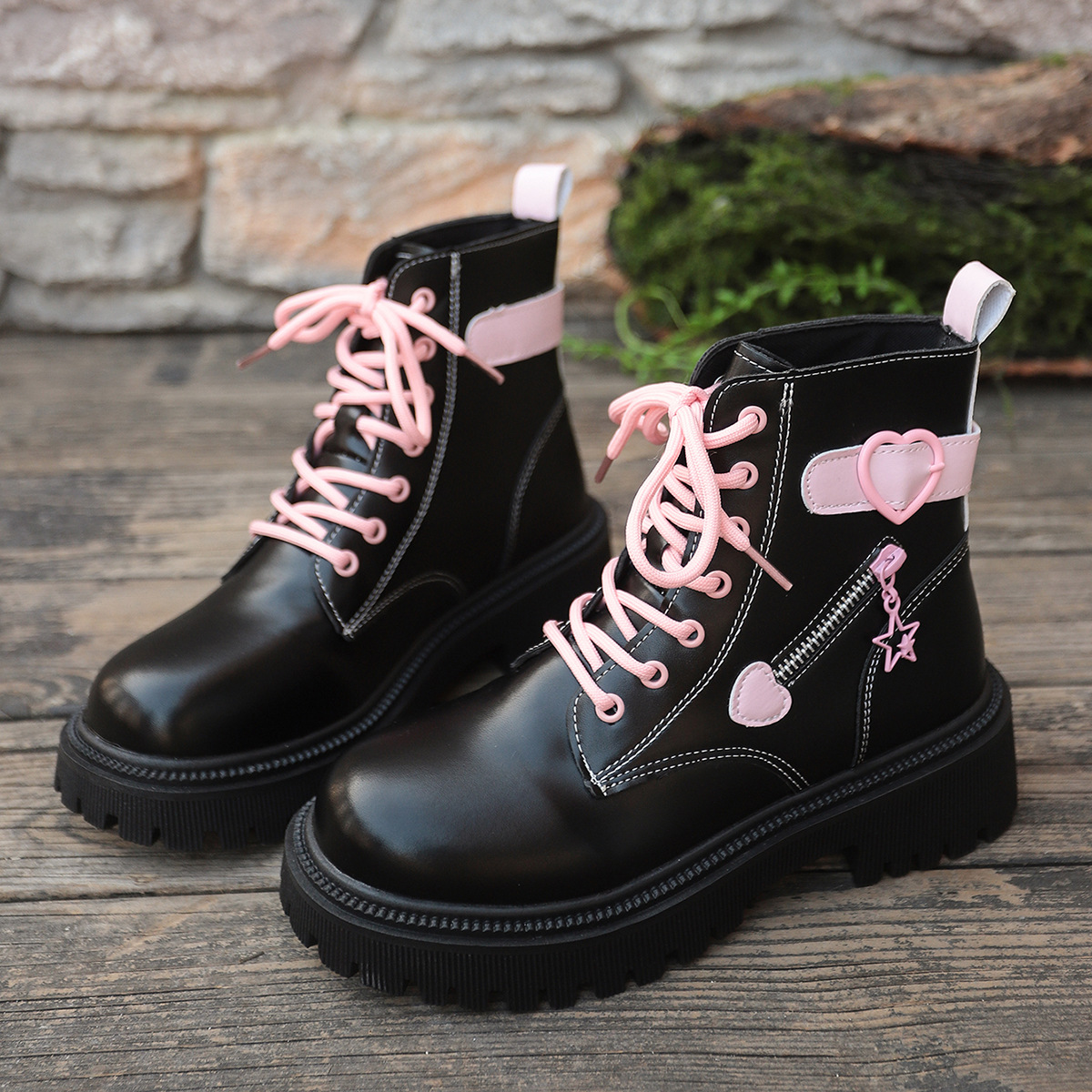 여성용 가리 핑크 러브 마틴 부츠 2025 가을 두꺼운 밑창 영국 스타일 학생 숏부츠, 발을 더욱 작아 보이게 해주는 트렌디한 레이스업 싱글 부츠