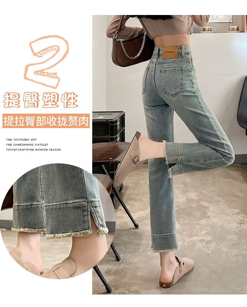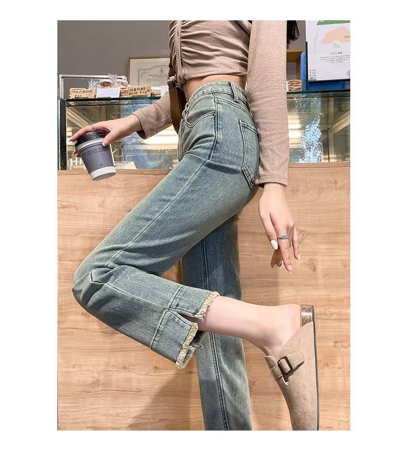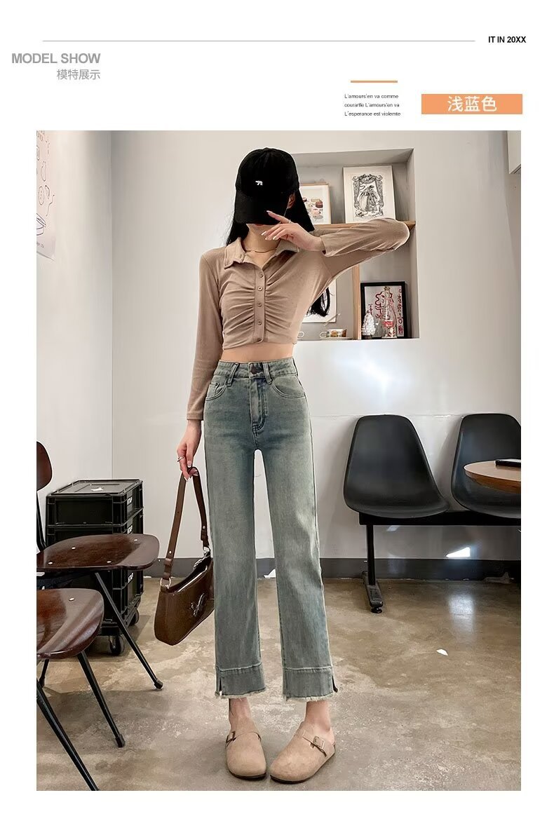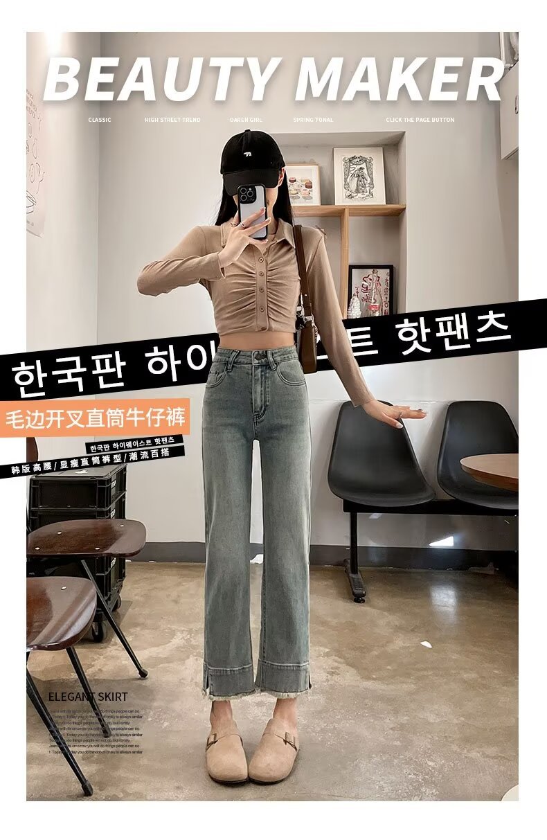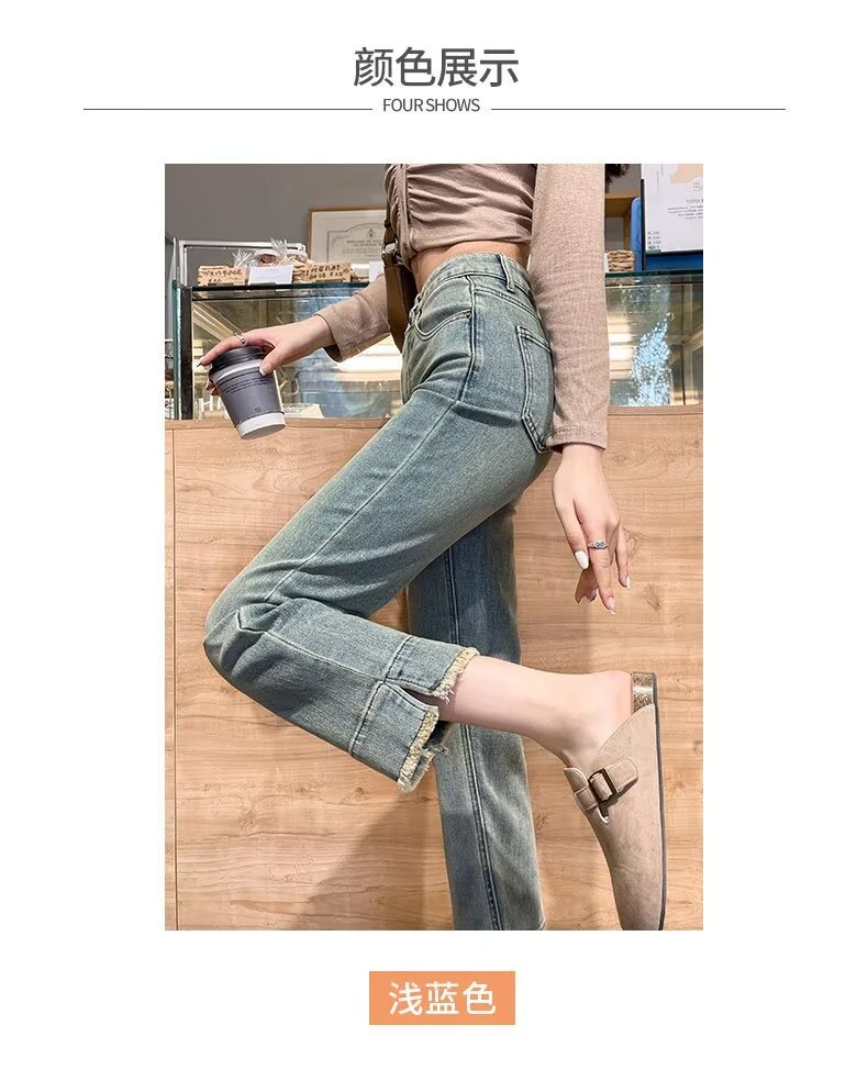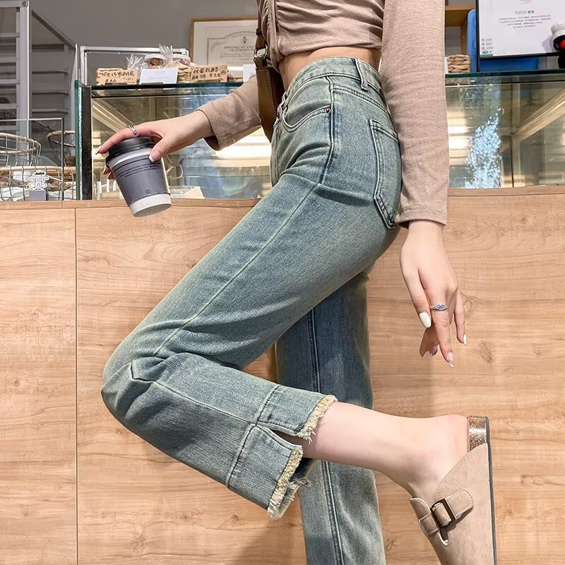 라이트 블루 분할 연기 튜브 청바지 여성의 봄 새로운 도착 작은 남자 헝겊 레트로 좁은 판 직선 바지스토어 가기