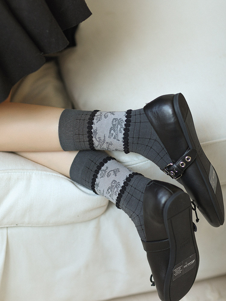 2025년 신상 그레이 시리즈 여성용 가을 겨울 모리 스타일 복고풍 신중국풍 꽃무늬 엠보싱 민족풍 종아리 중간 양말
