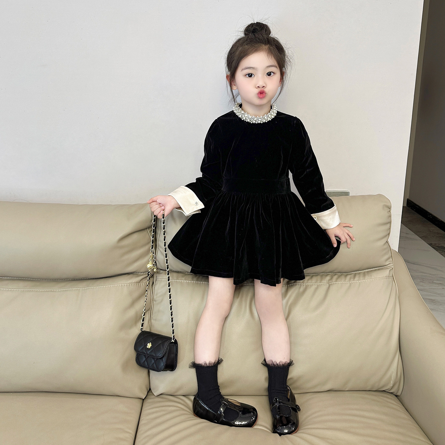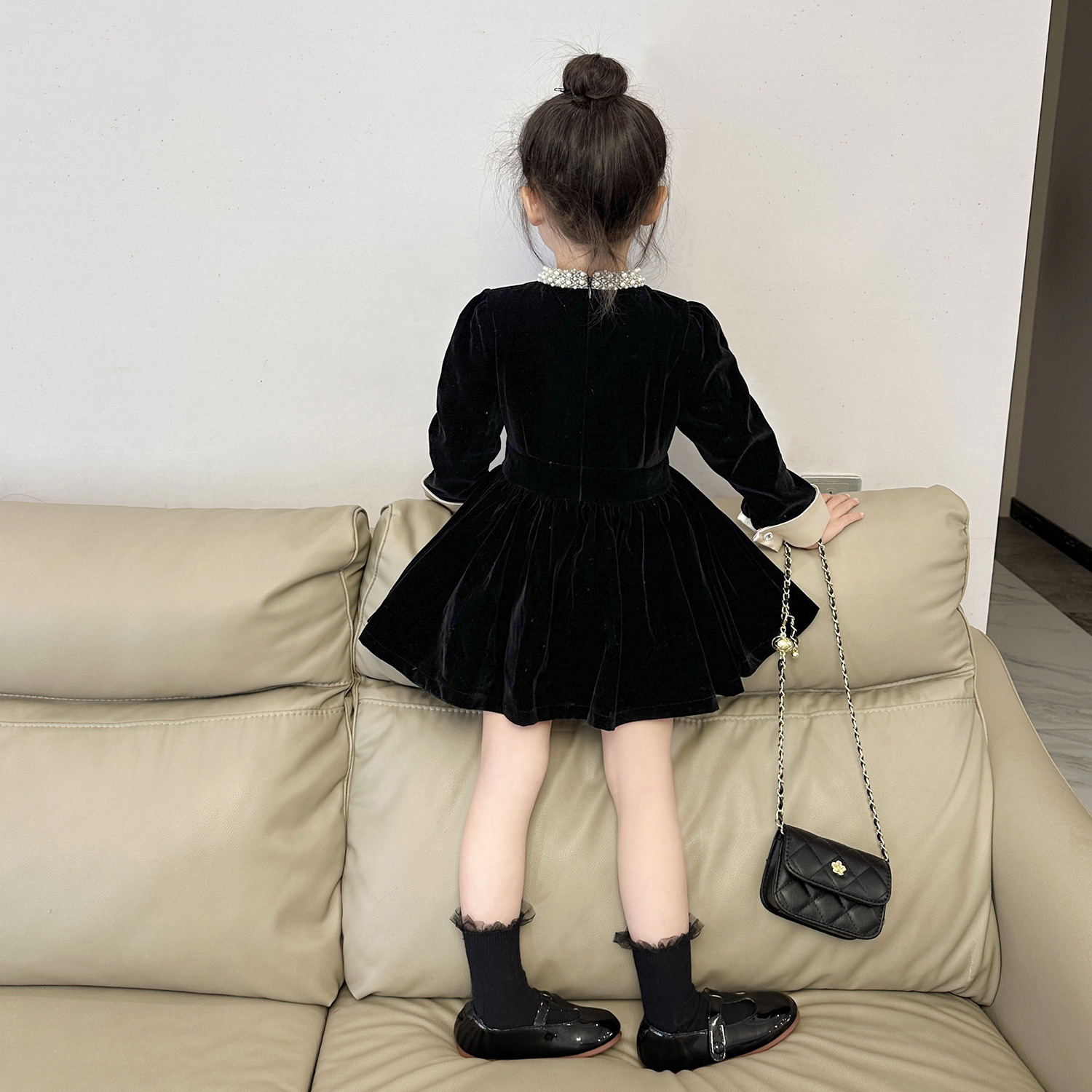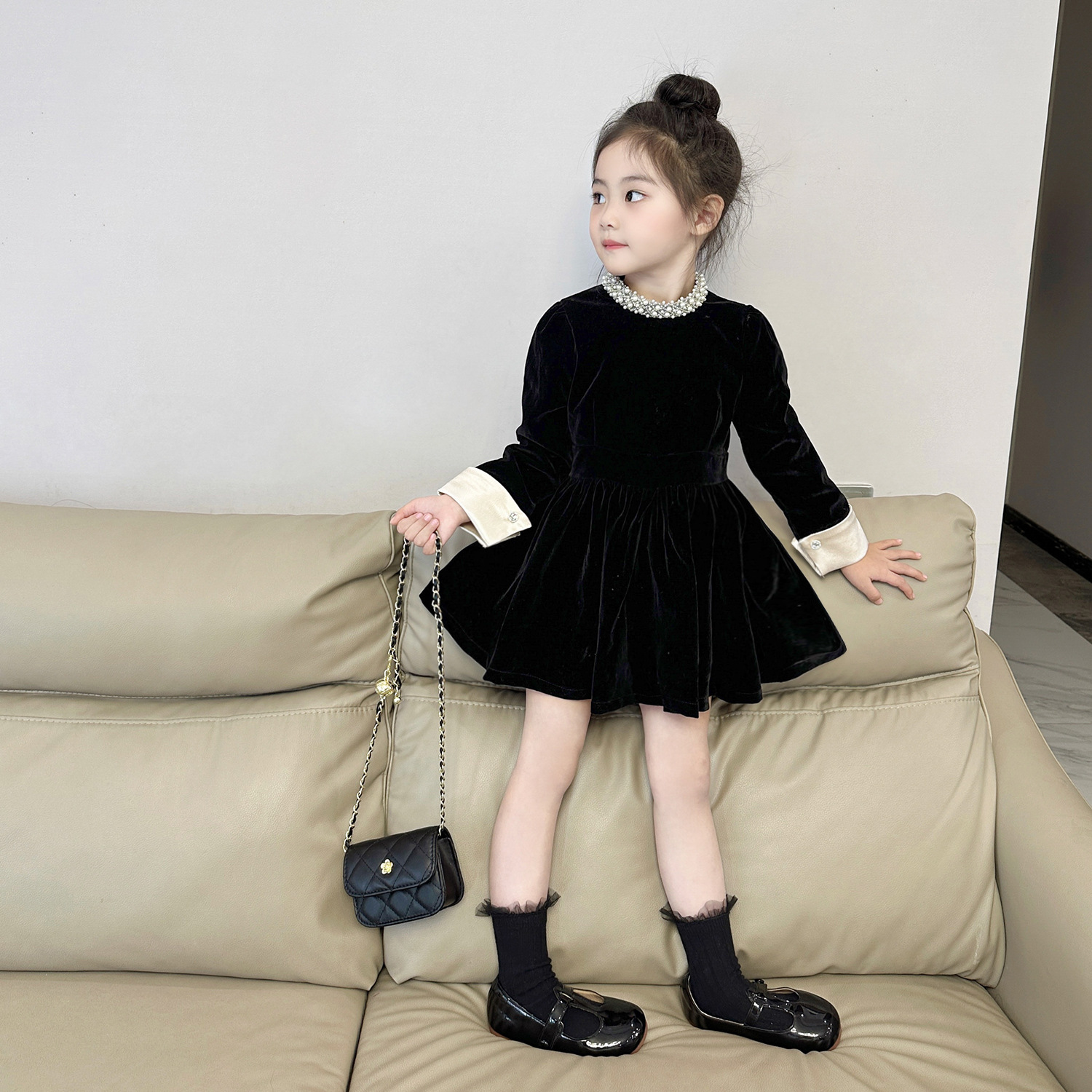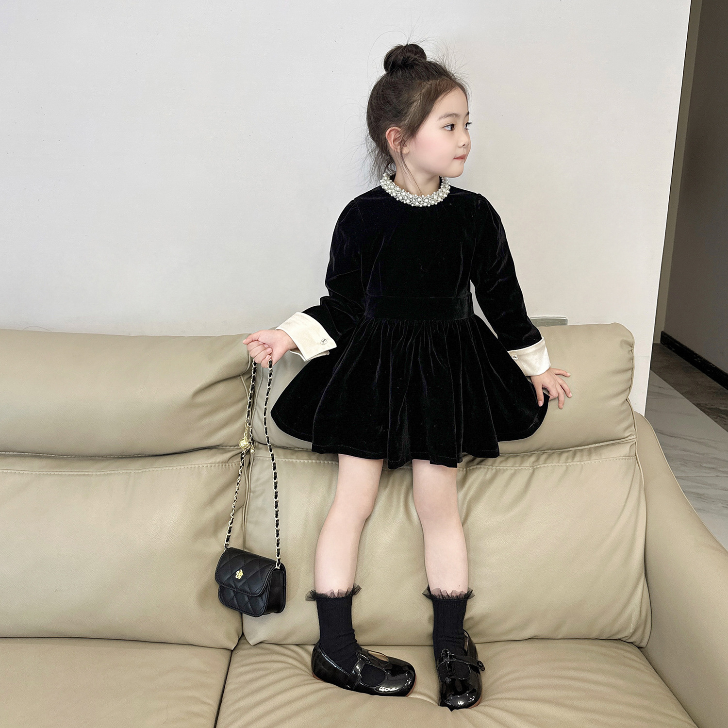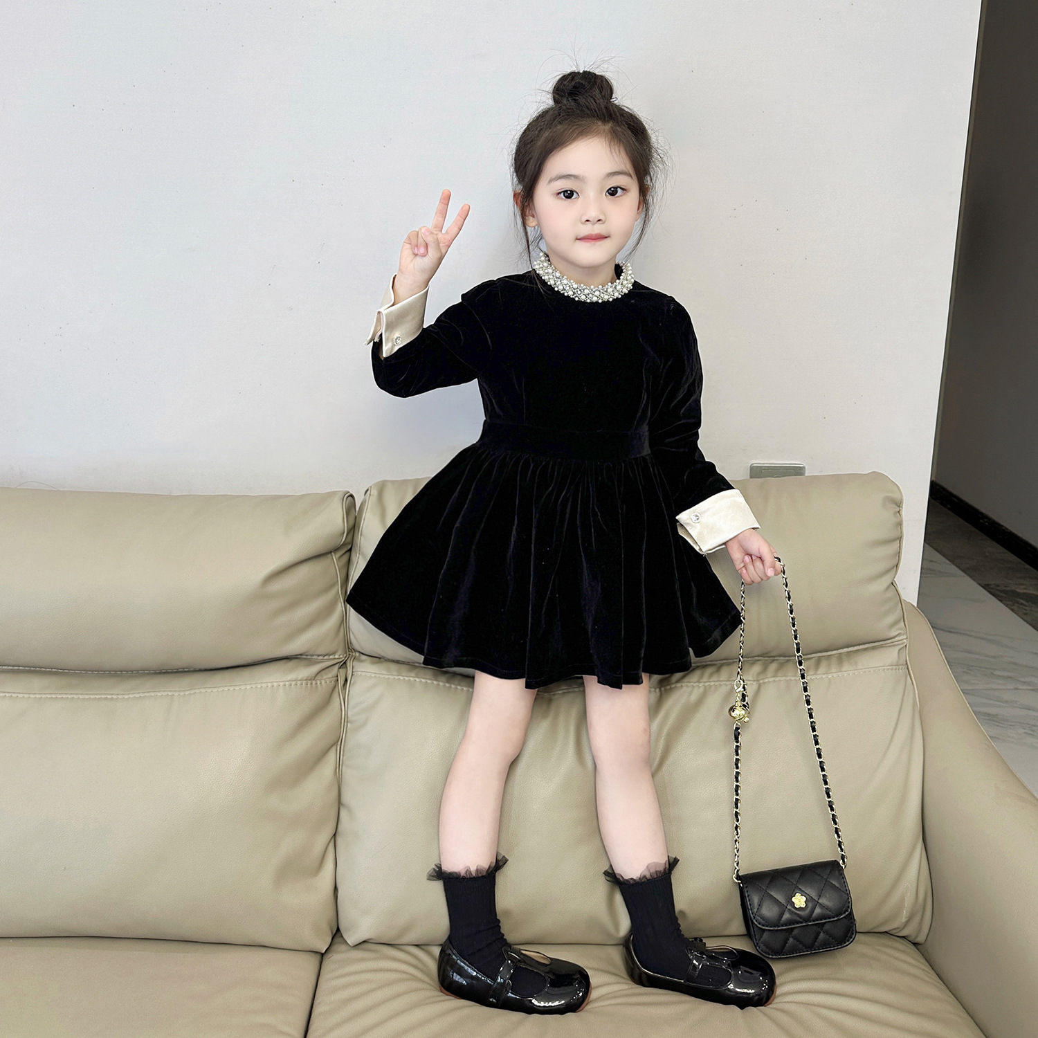 여아 진주 칼라 벨벳 드레스 2025 가을 겨울 신상 어린 소녀 우아한 벨벳 블랙 드레스