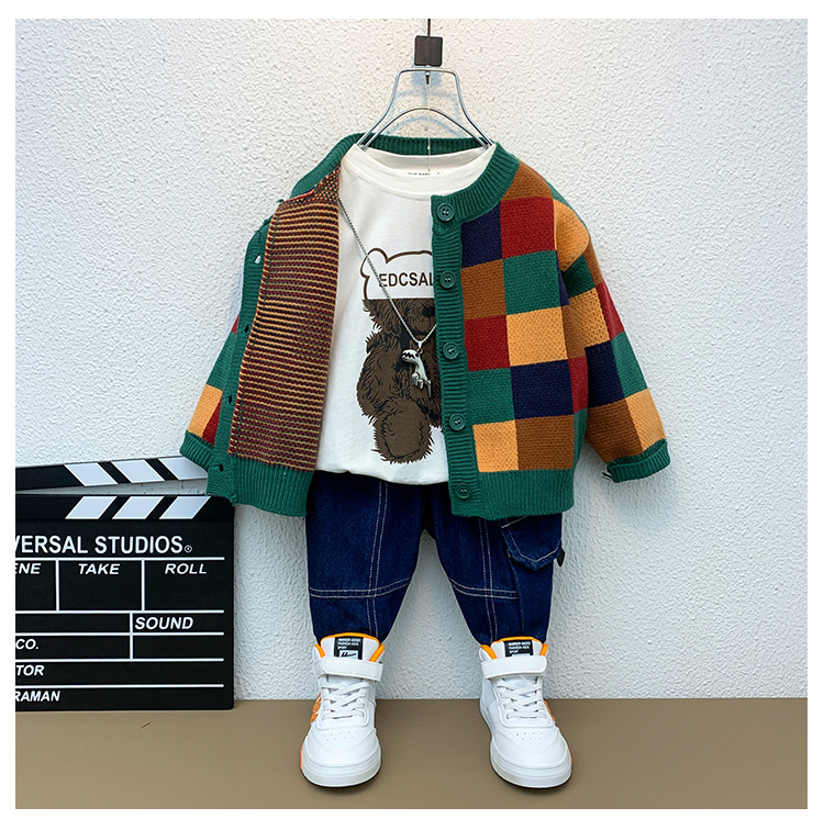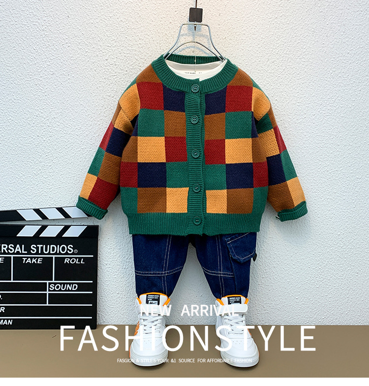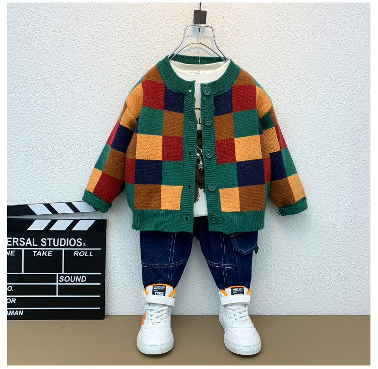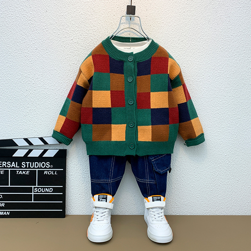 6666 소년 스웨터 재킷 가을, 겨울 2025 새로운 어린이 격자 무늬 카디건 소년 가을 니트 스웨터