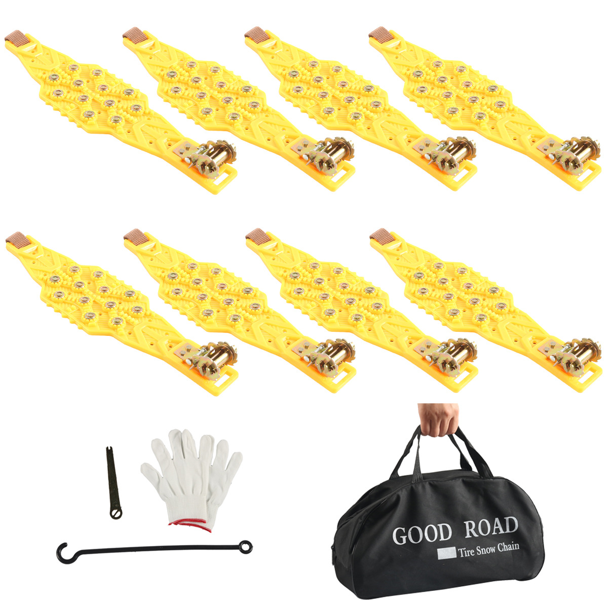A10178:黄色防滑轮胎履带*8PCS,扳手*1PCS,勾条*1PCS,手套*1PCS,收纳袋*1PCS
