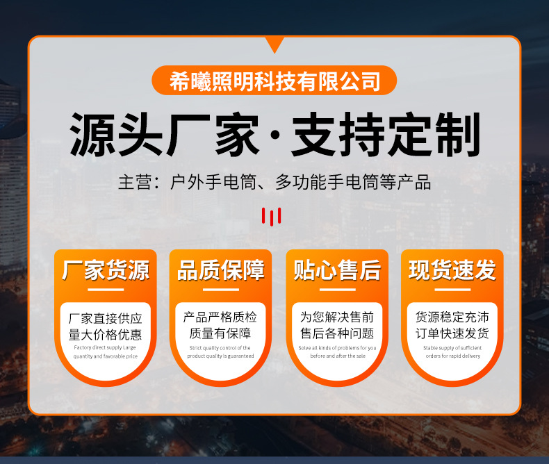 宁波奉化区希曦照明科技有限公司位于浙江省宁波市奉化区莼湖街道滨海工业区万洋众创城,是户外手电筒、多功能手电筒等产品专业生产加工的公司,占地面积5000平方米左右,工厂除了自己研发的产品外,还支持加工定制,一件代发。宁波奉化区希曦照明科技有限公司拥有完整、科学的质量管理体系,现代化的管理体系,专业的技术团队,成熟稳定的供应链体系,与多个厂家长期合作享有材料采购和生产优势,品质严控,交期保证。宁波奉化区希曦照明科技有限公司的诚信、实力和产品质量获得业界的认可。