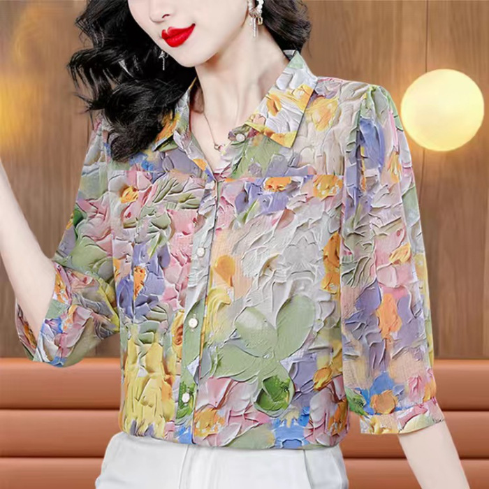 카운터 항저우 쉬폰 셔츠 일곱 소매 최고 여성 여름 새로운 느슨한 패션 인쇄 우아한 작은 셔츠