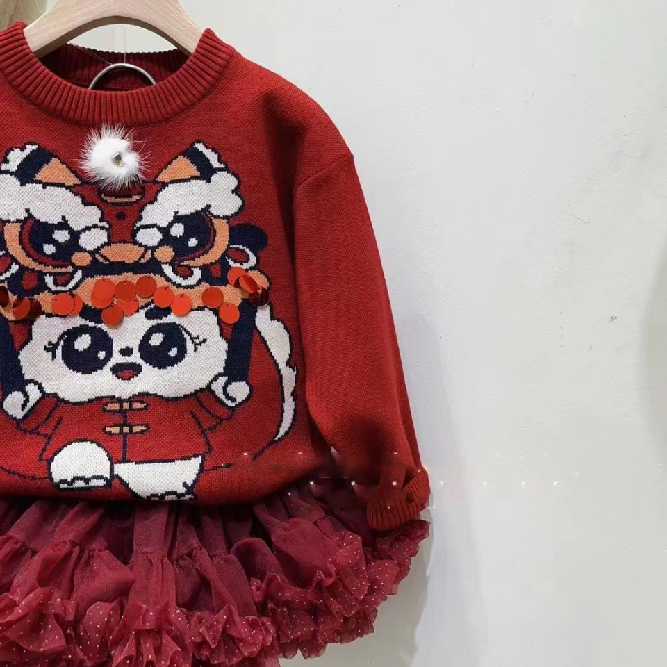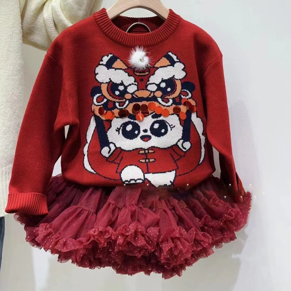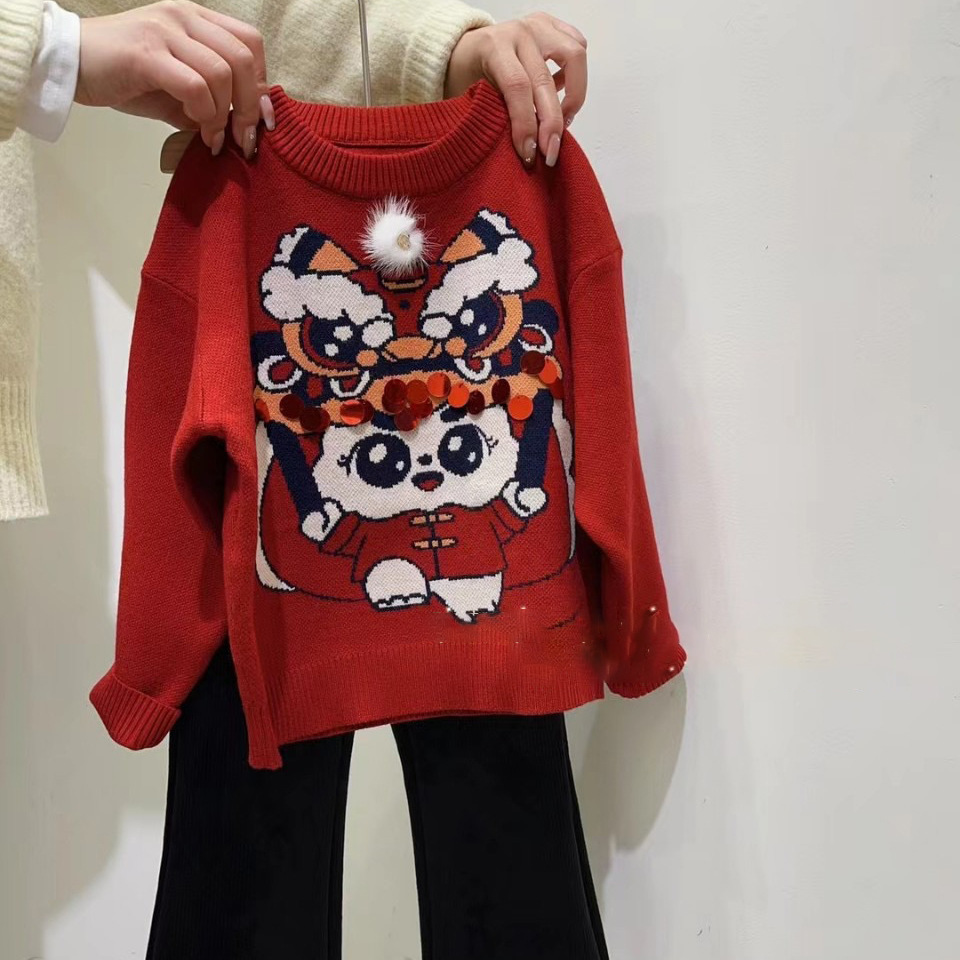 가을/겨울 24 새로운 사자 댄스 스웨터 새해 축제 버건디 중공업 새로운 중국 소녀의 새해