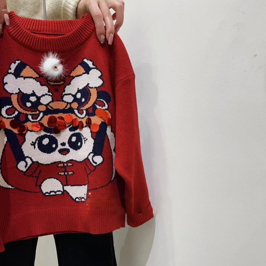 가을/겨울 24 새로운 사자 댄스 스웨터 새해 축제 버건디 중공업 새로운 중국 소녀의 새해스토어 가기