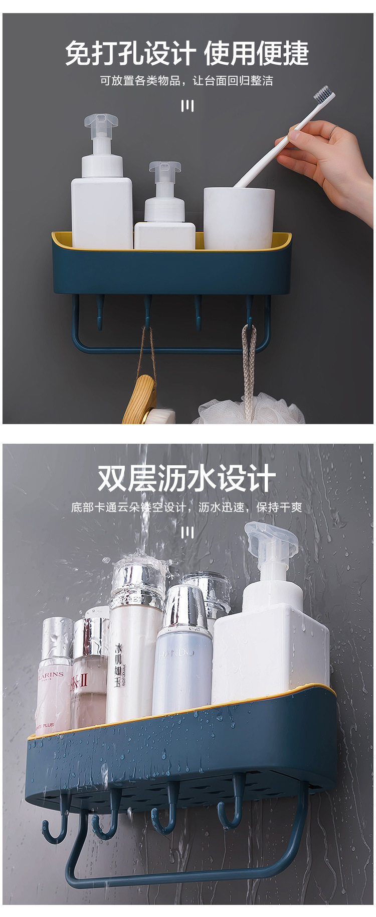 새로운 2 색 가정용 4 후크 화장실 보관 랙 욕실 다기능 벽 흡입 비 펀칭 벽 매달린 보관 랙