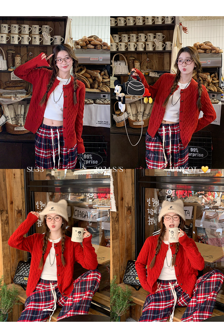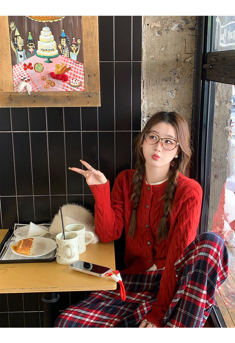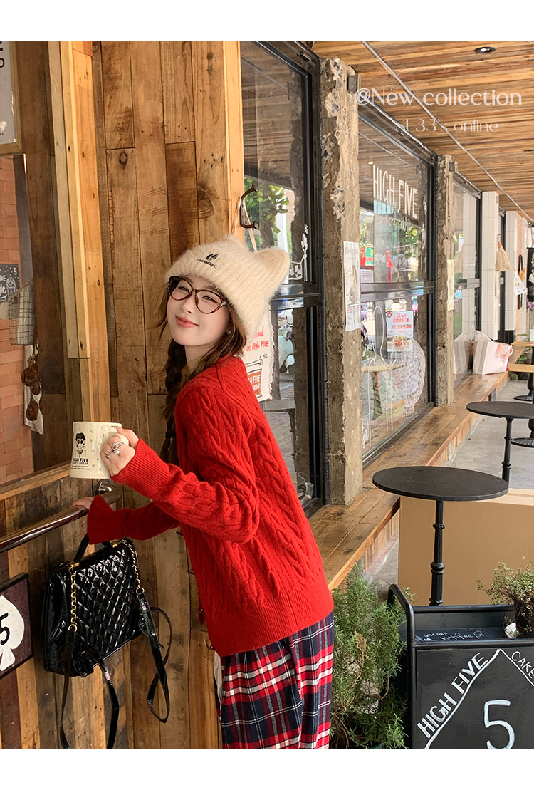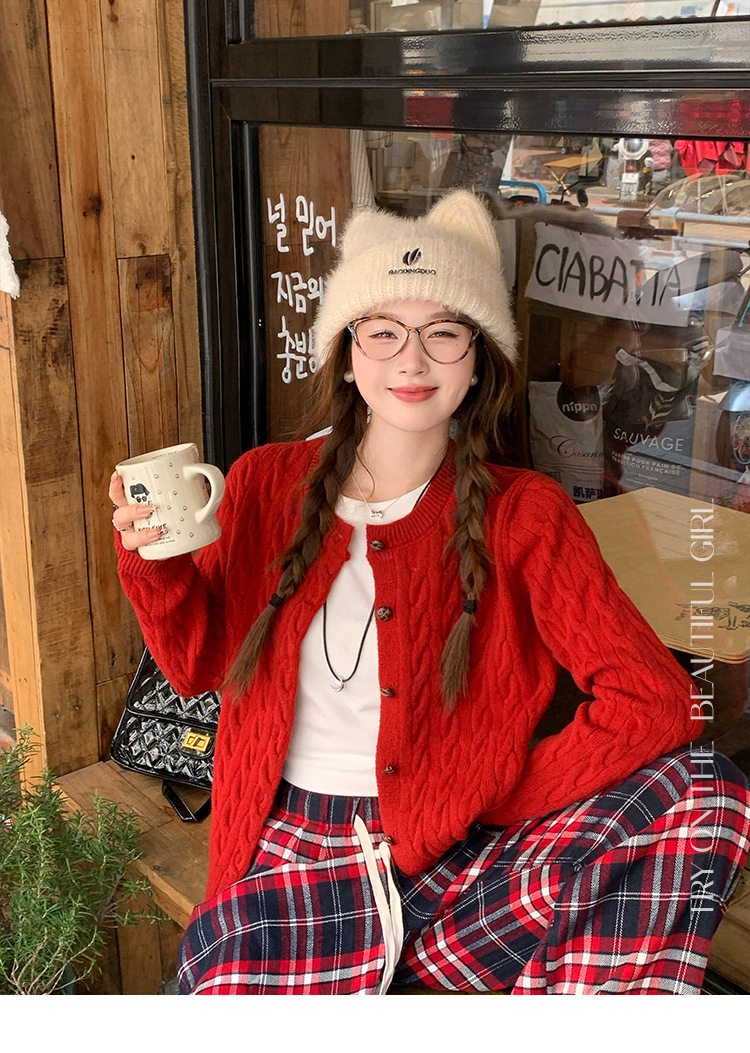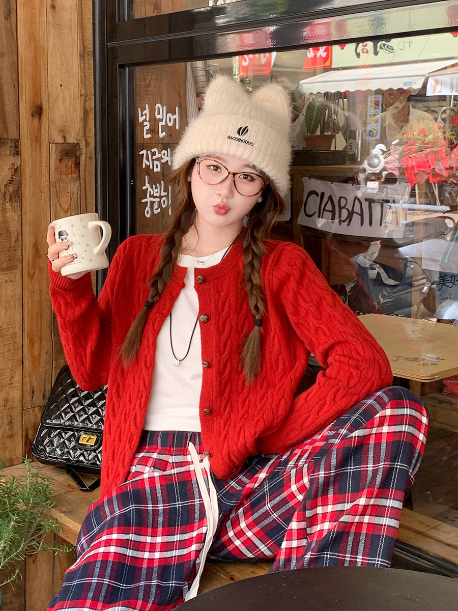 안코라 레드 스웨터 가디건 여성용 2025 신상 봄 가을 루즈핏 레이지 스타일 레드 코트 상의스토어 가기