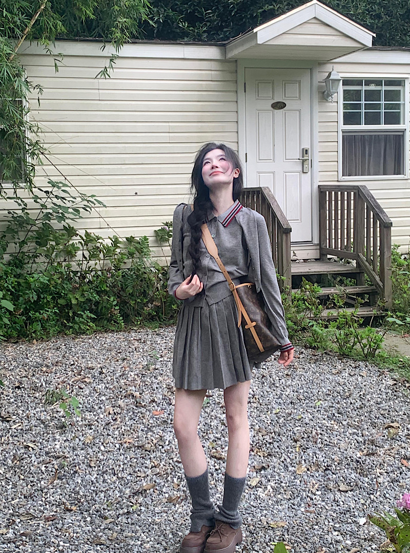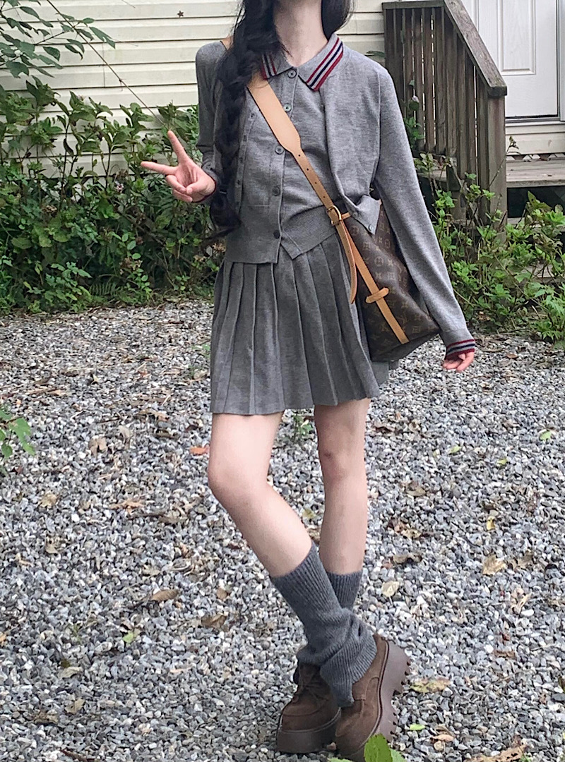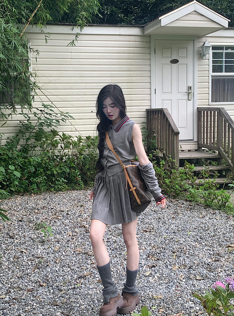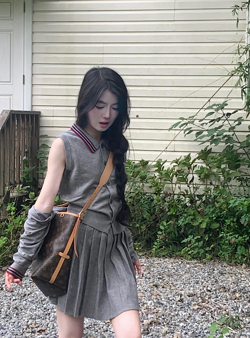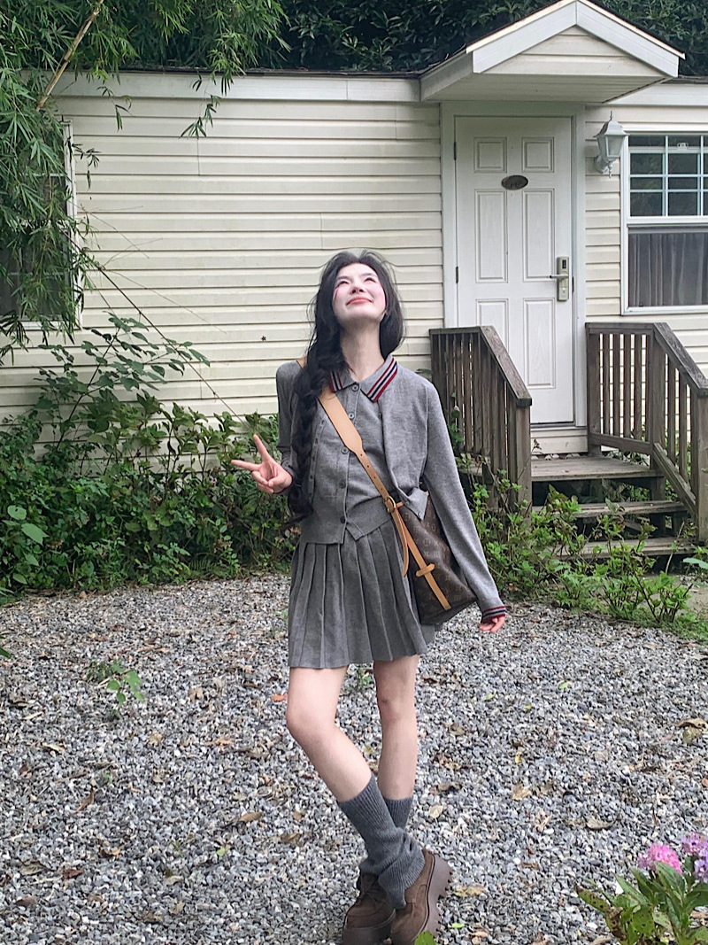 대학 스타일 대비 색상 세트 여성의 새로운 우아한 긴팔 스웨터 슬림 핏 조끼 주름 치마 3 종 세트스토어 가기
