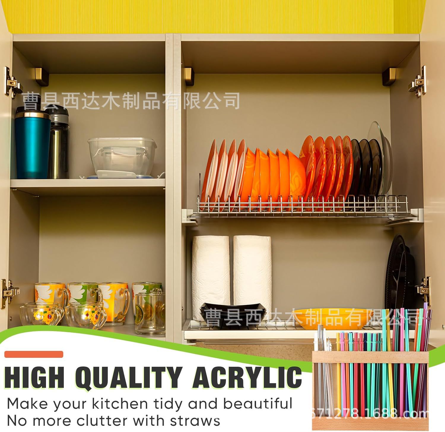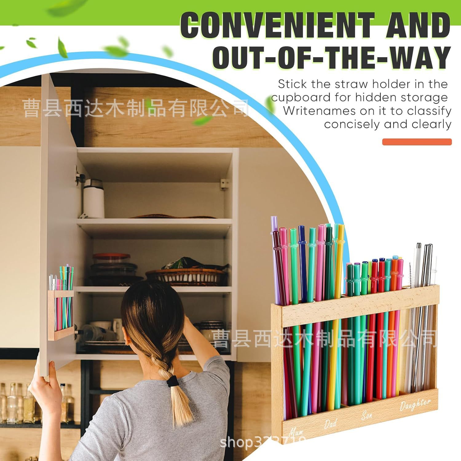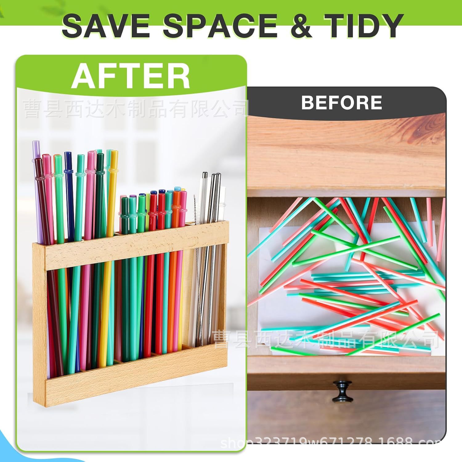 양면 접착 테이프가 있는 목재 빨대 보관함, 텀블러 빨대 정리함, 다칸형 목재 주방 카운터 선반
