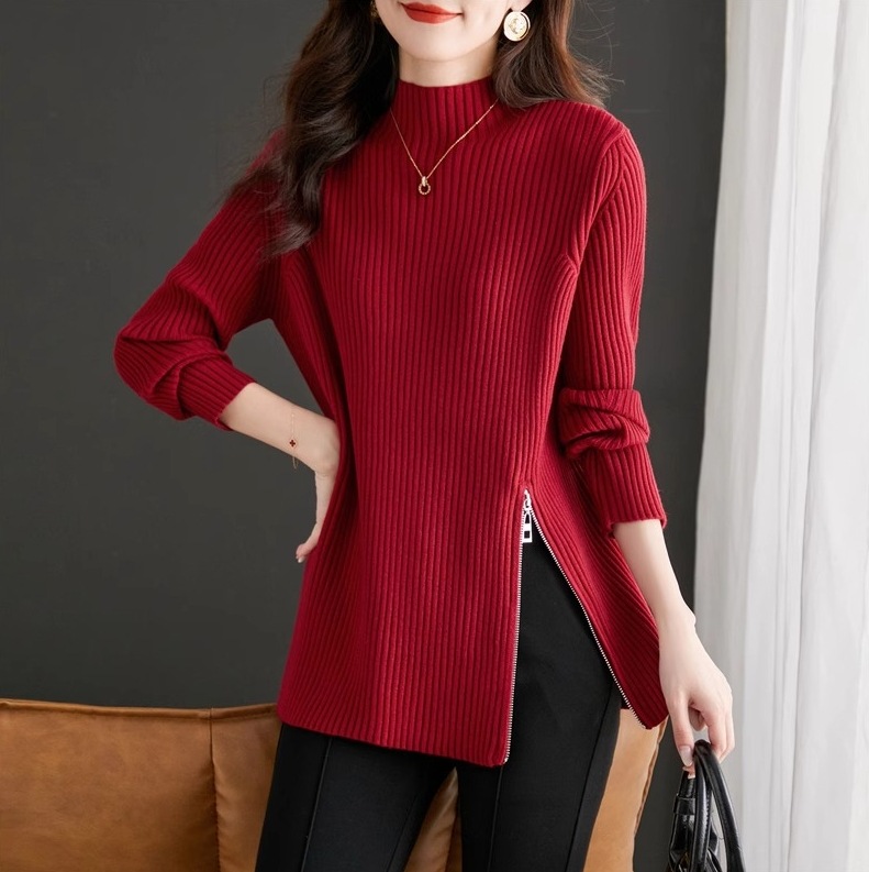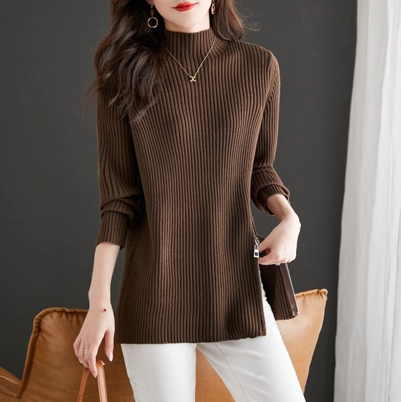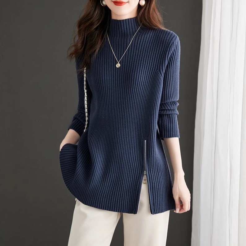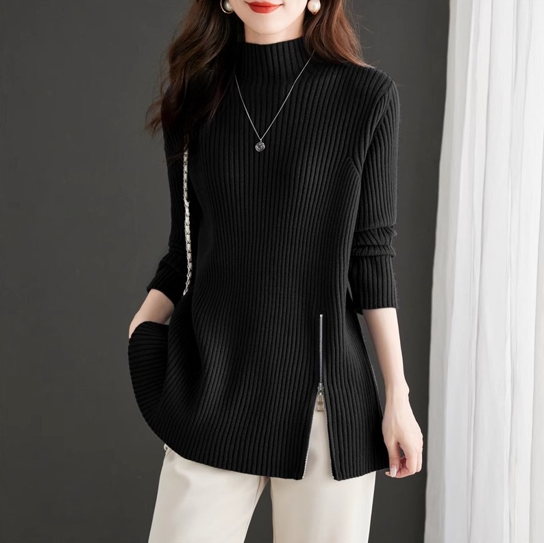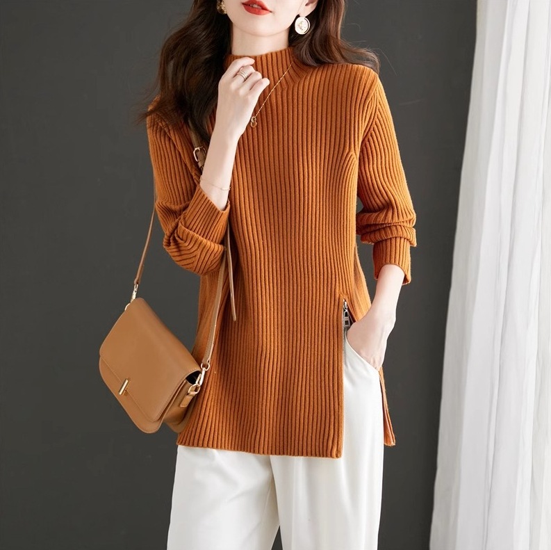 슈퍼 잘 생긴 반 터틀넥 스웨터 여성 중간 길이의 가을 및 겨울 외부 탑 우아한 엉덩이 커버 니트베이스 셔츠 트렌디