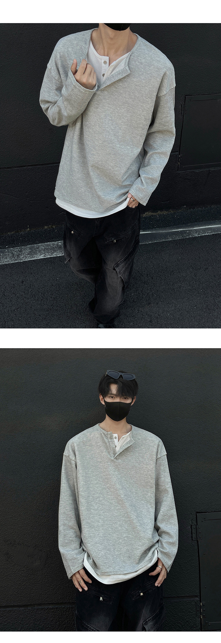 가짜 투피스 헨리 칼라 긴팔 티셔츠 남성용 봄과 가을 2024 뉴 헤비 내베이스 셔츠 루즈 탑