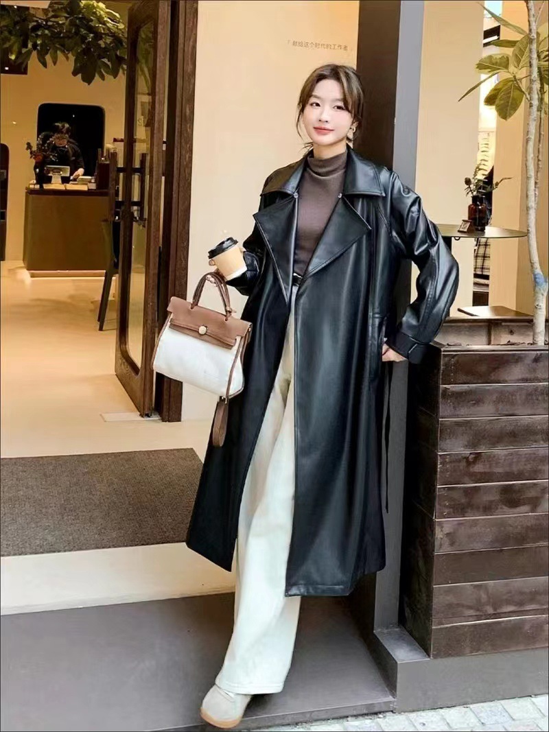 패션 우아한 긴 무릎 가죽 자켓 여성의 2023 가을 새로운 느슨한 부드러운 가죽 오토바이 재킷 하이 엔드 감각스토어 가기