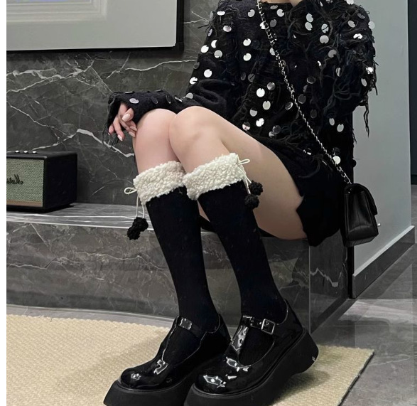 양고기 벨벳 무릎 길이 스타킹 여성 가을과 겨울 기모 두꺼운 흰색 JK 양말 귀여운 모피 공 종아리 양말