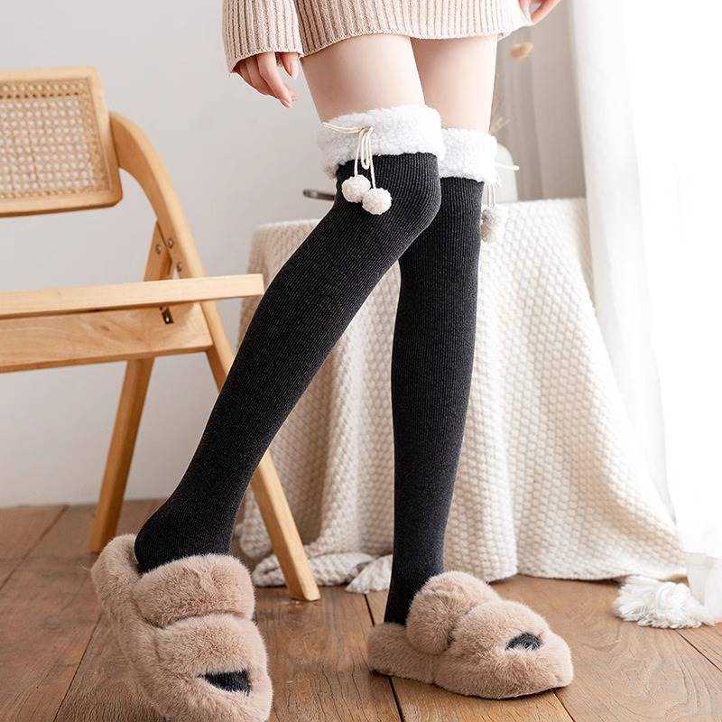 양고기 벨벳 무릎 길이 스타킹 여성 가을과 겨울 기모 두꺼운 흰색 JK 양말 귀여운 모피 공 종아리 양말스토어 가기