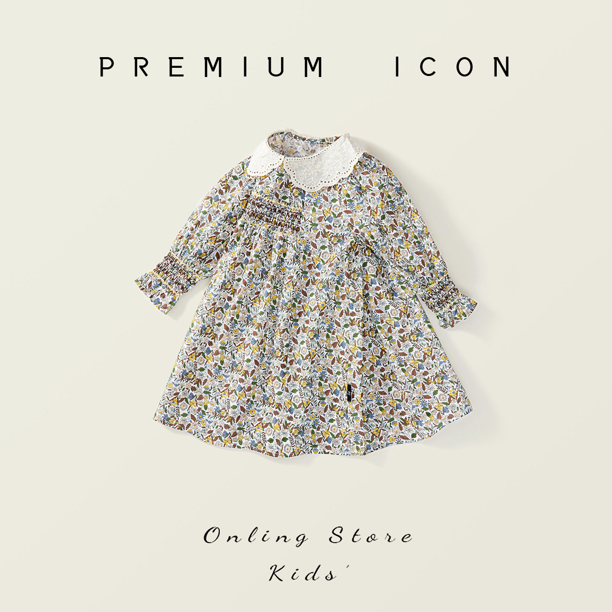 MDD 아동복 소녀 꽃 무늬 원피스 2024 가을 새로운 어린이 한국 복고풍 스타일 긴소매 치마