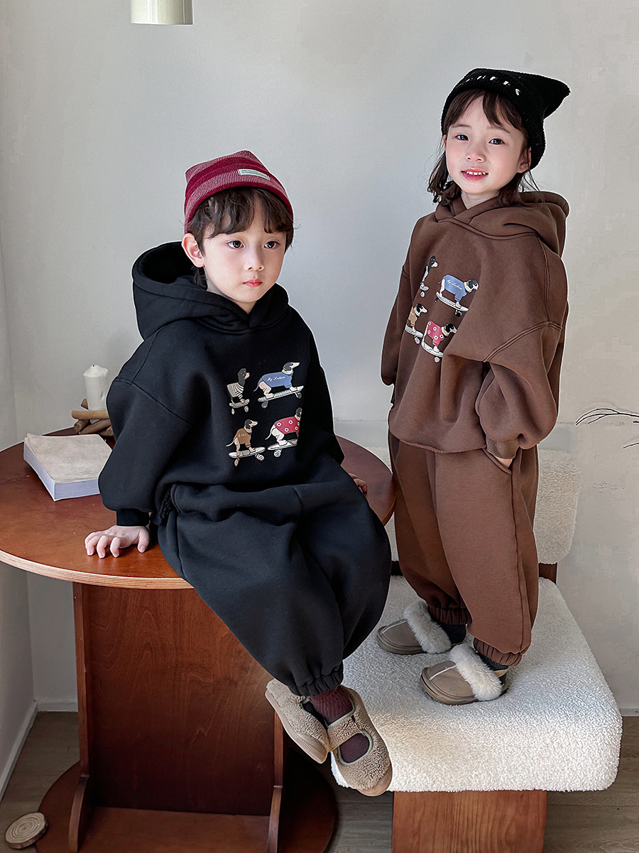 Jiaye 어린이 2024 년 겨울 원피스 벨벳 후드 스웨트 소년 소녀 아기의 두꺼운 다리 바지 투피스 세트스토어 가기