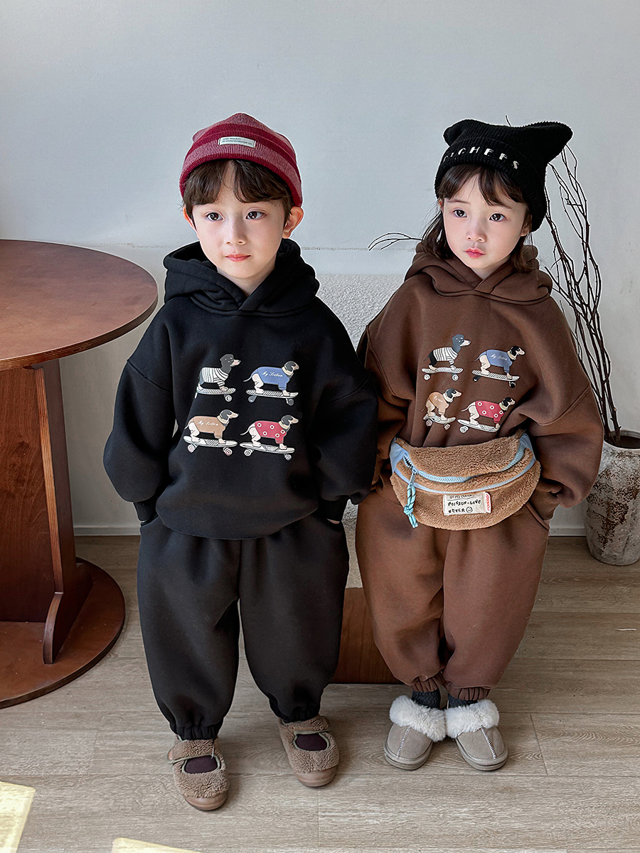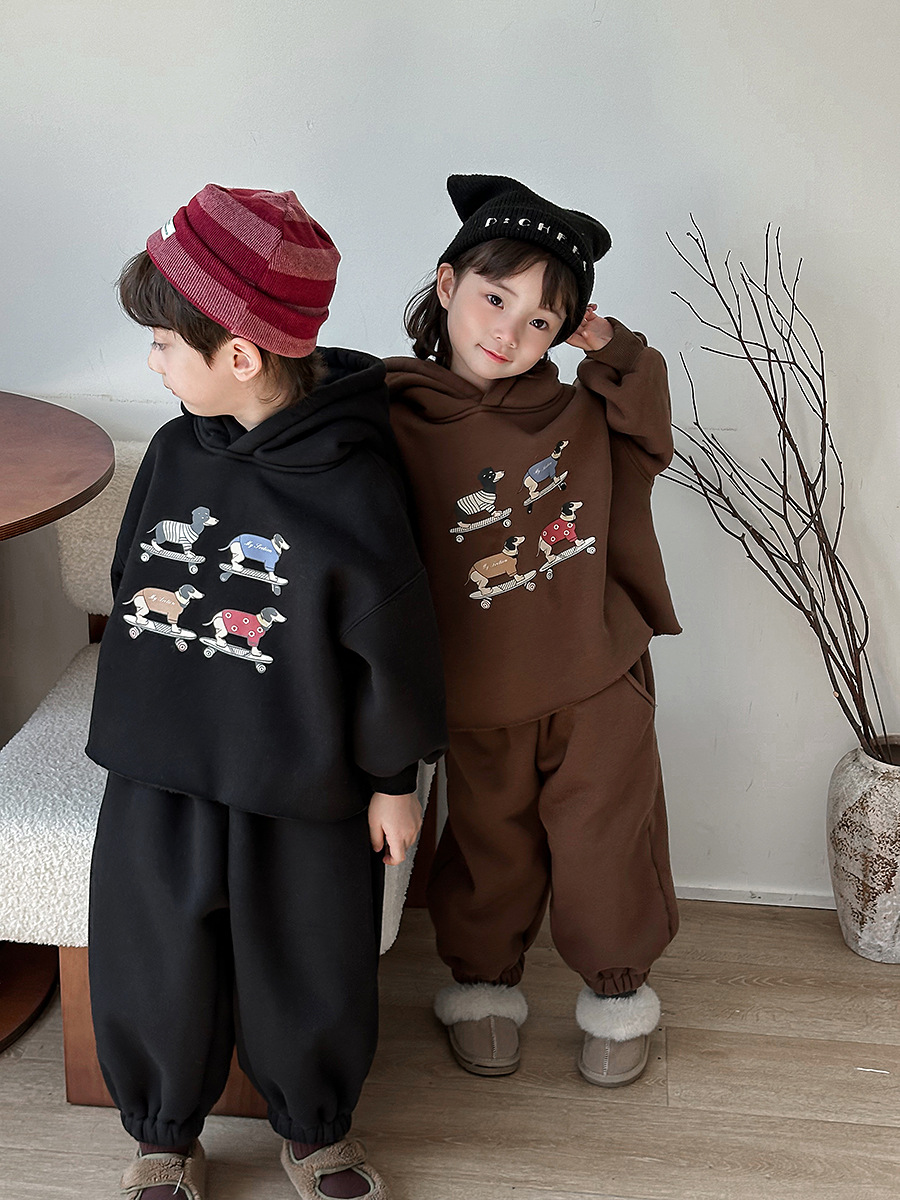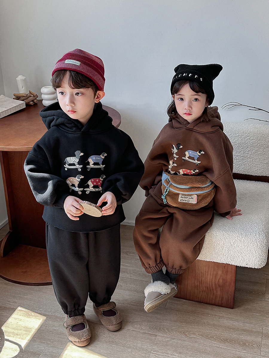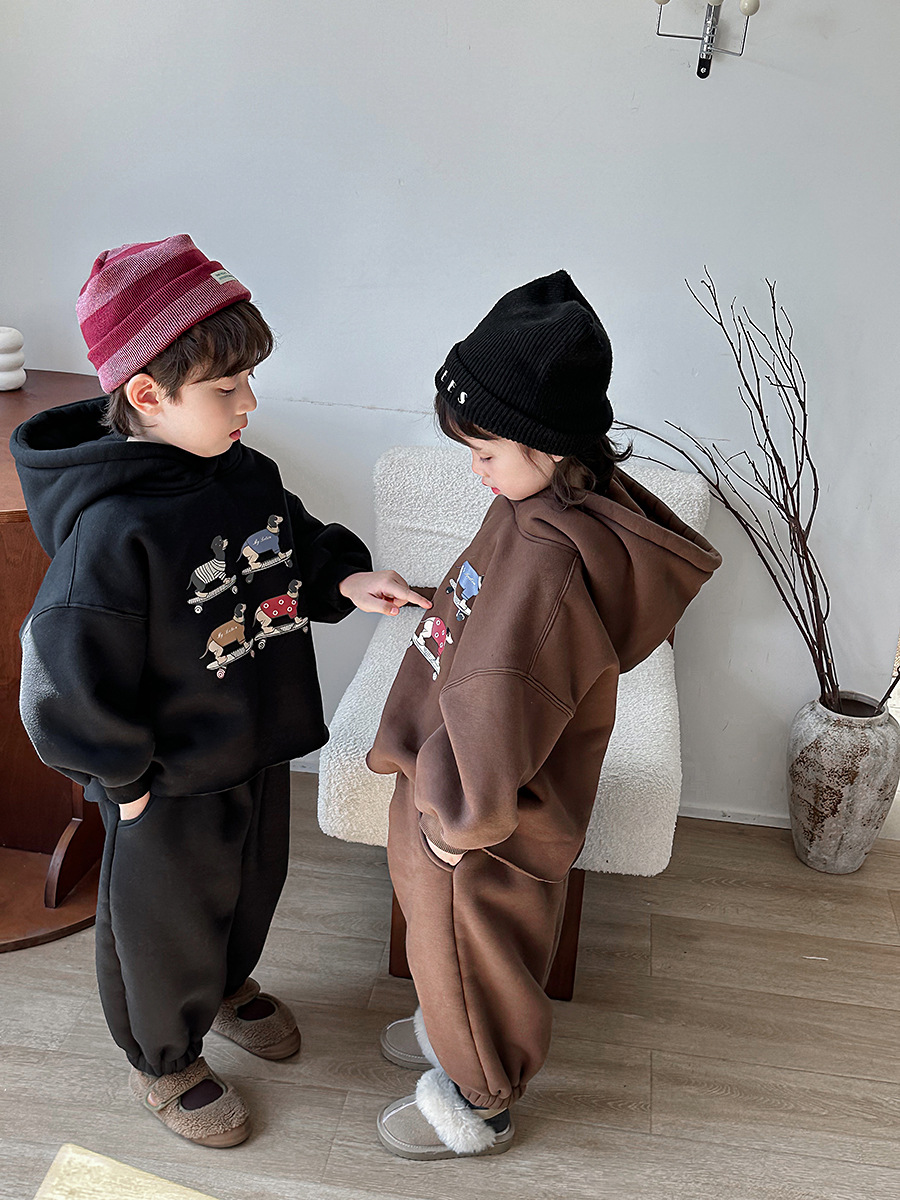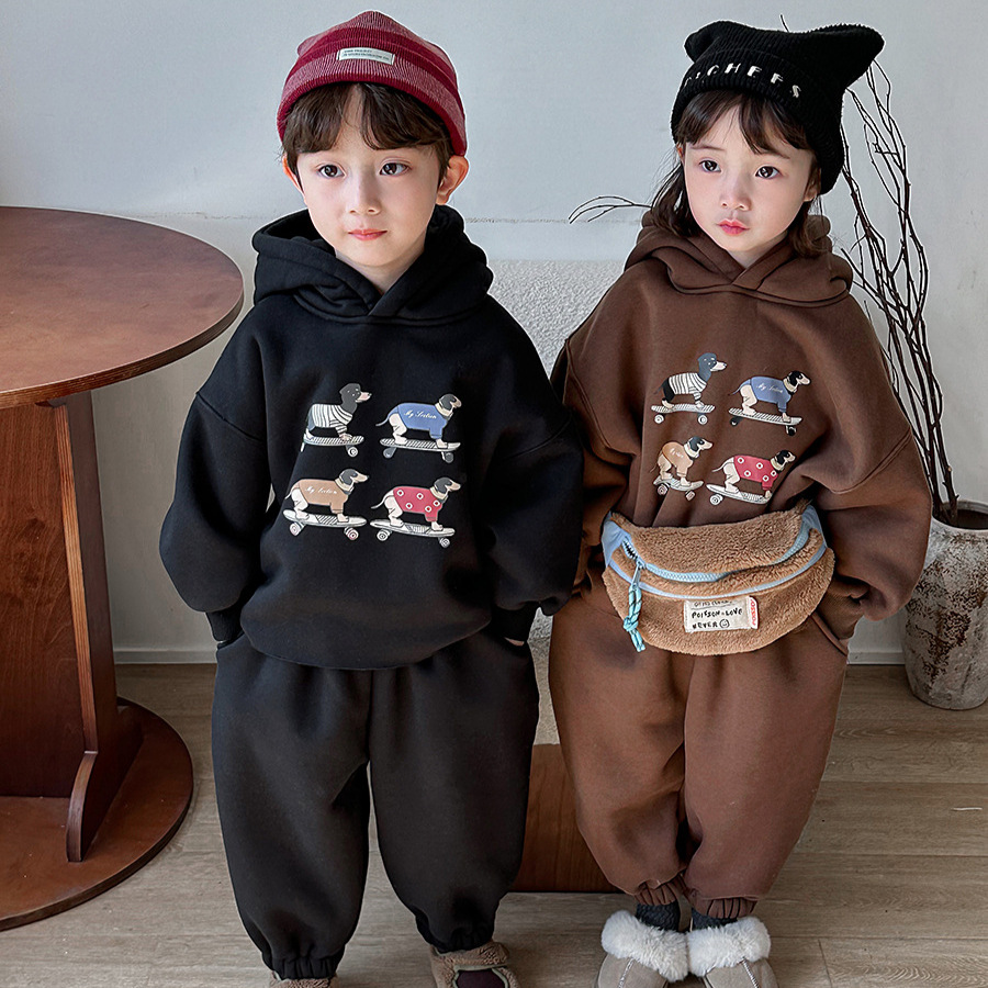 Jiaye 어린이 2024 년 겨울 원피스 벨벳 후드 스웨트 소년 소녀 아기의 두꺼운 다리 바지 투피스 세트