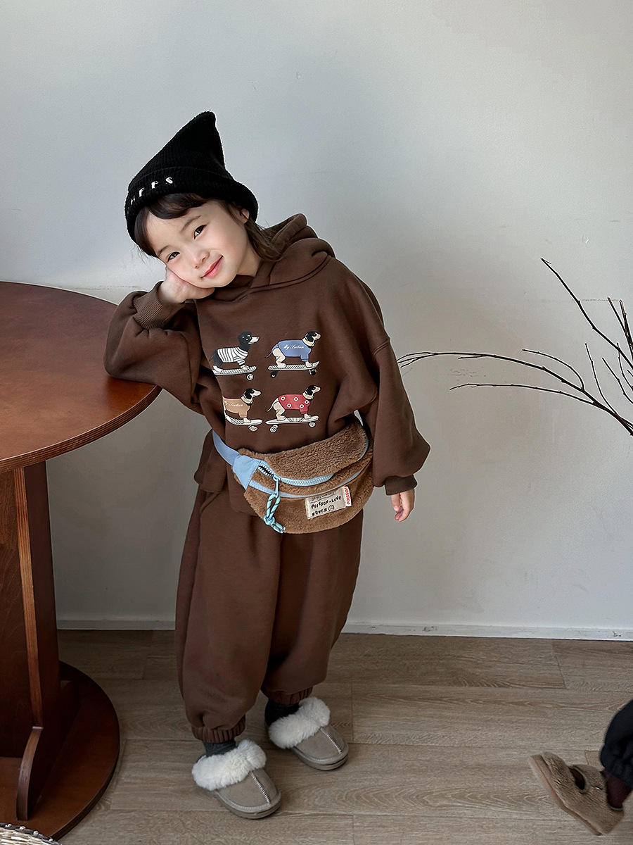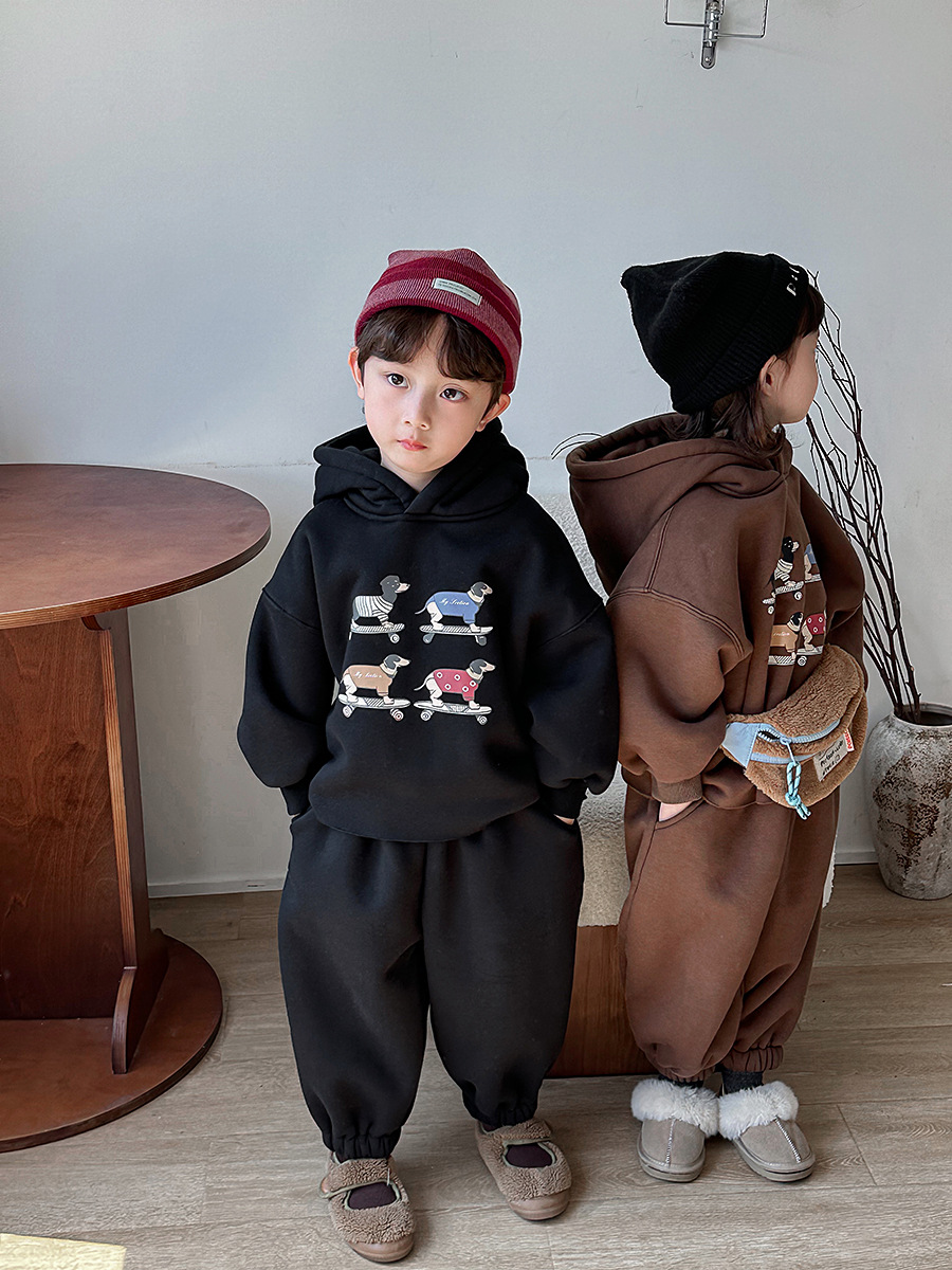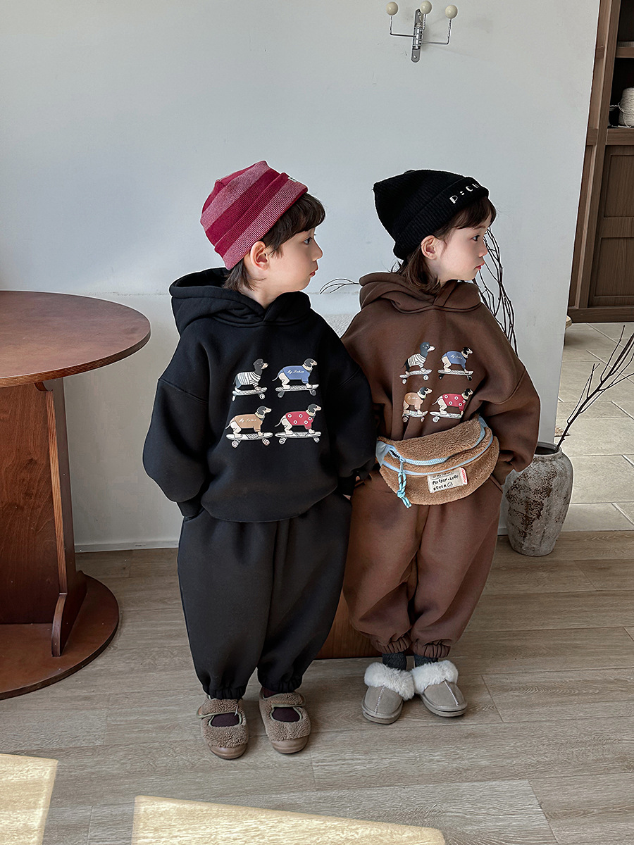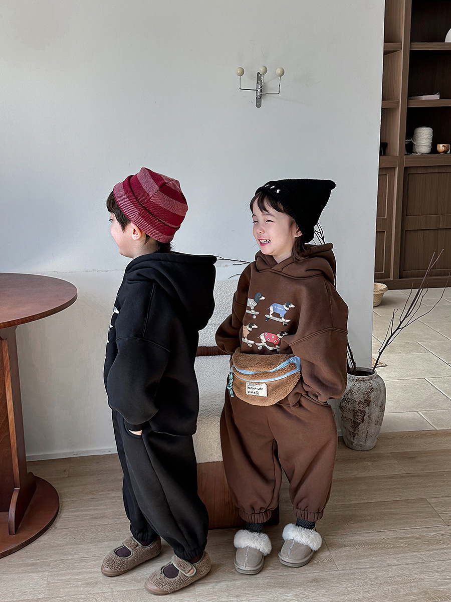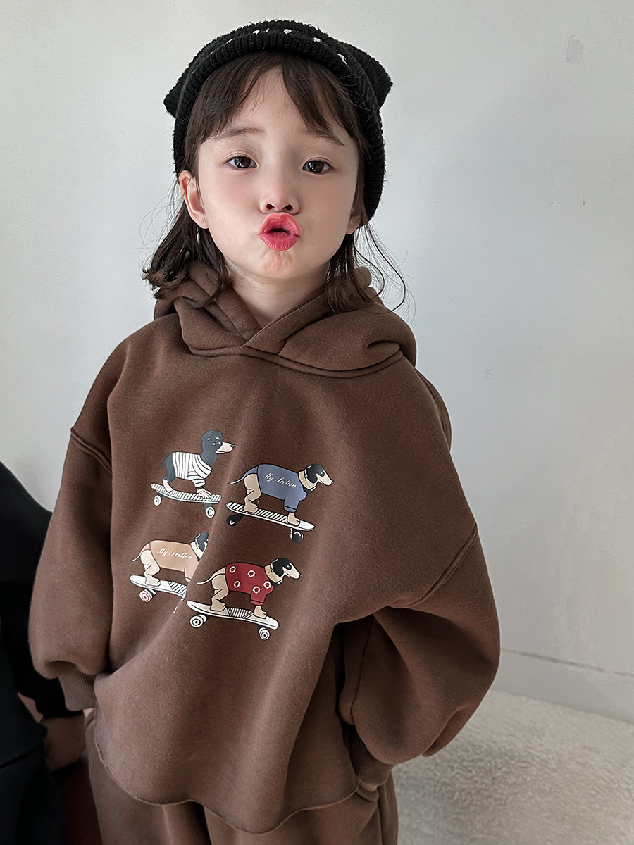 Jiaye 어린이 2024 년 겨울 원피스 벨벳 후드 스웨트 소년 소녀 아기의 두꺼운 다리 바지 투피스 세트