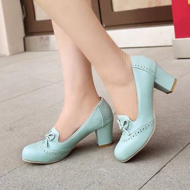 2024 새로운 한국식 둥근 발가락 활은 플러스 사이즈 대외 무역을위한 두꺼운 중간 굽 여성용 신발 싱글 레이어 신발