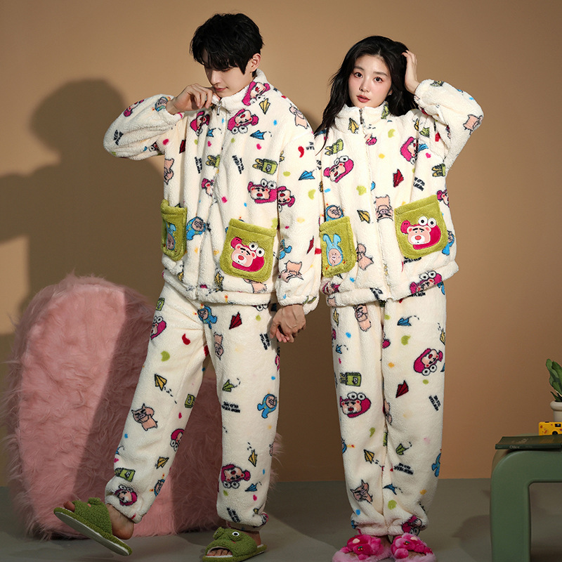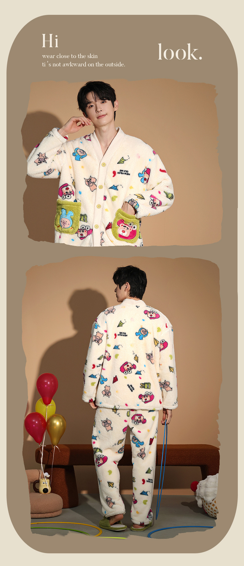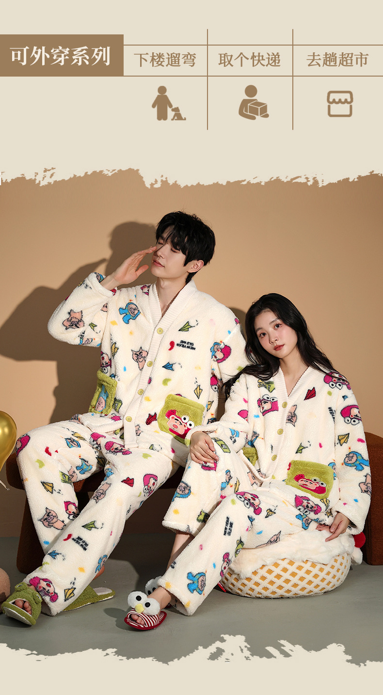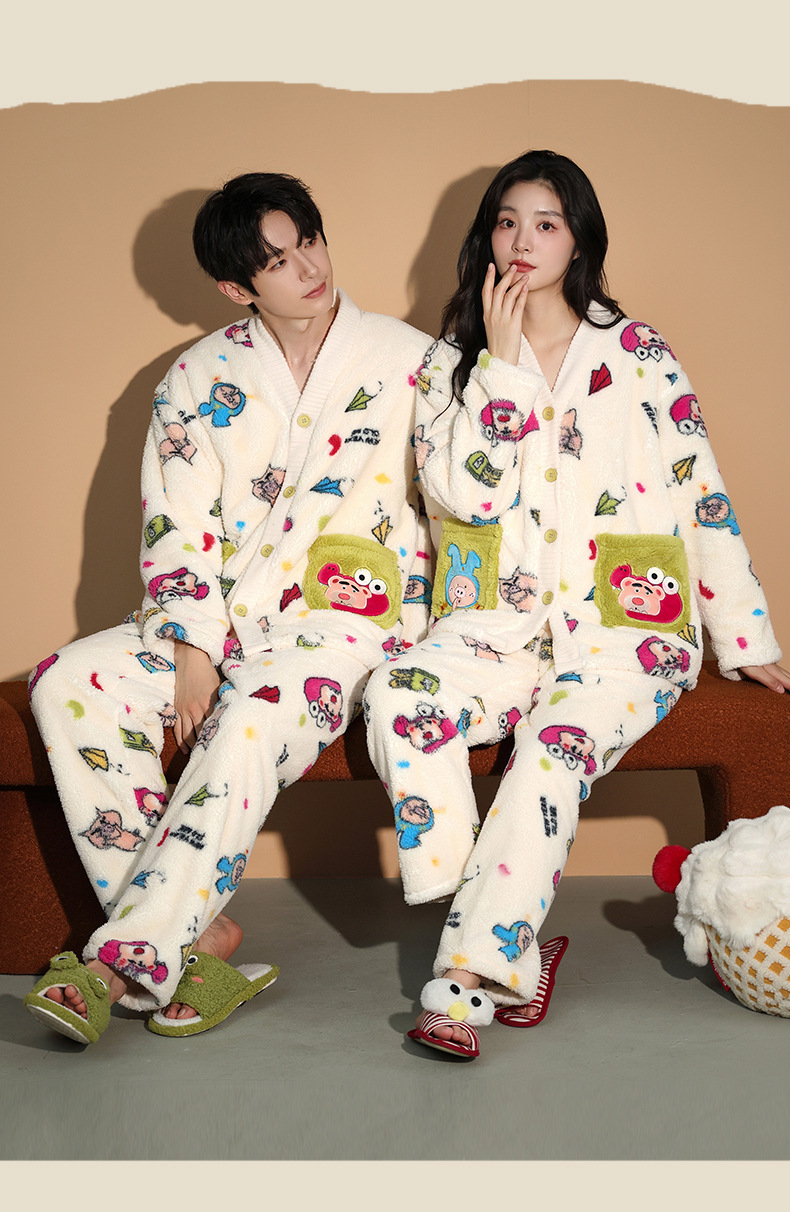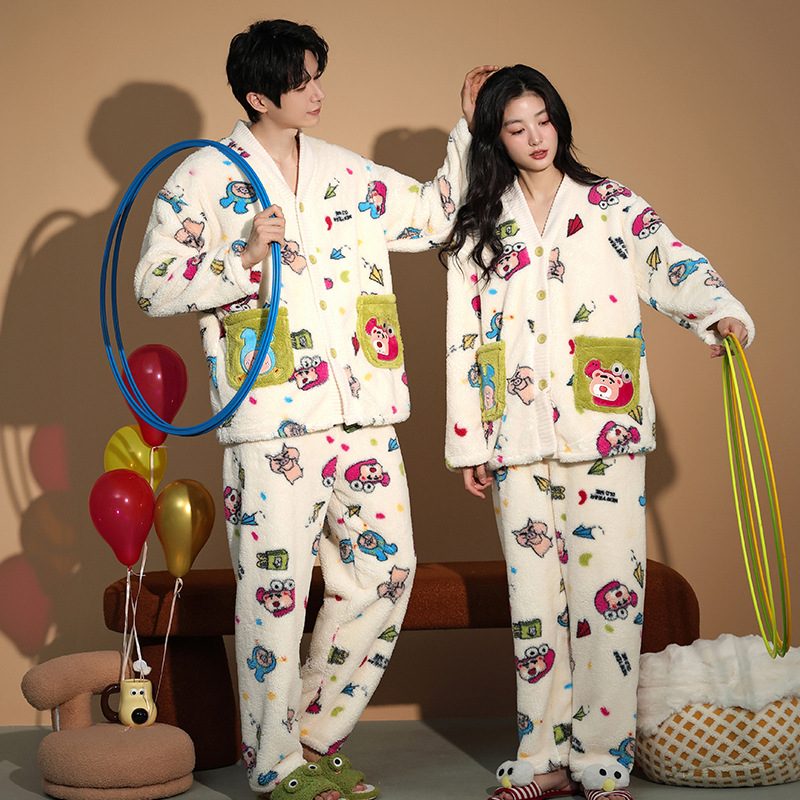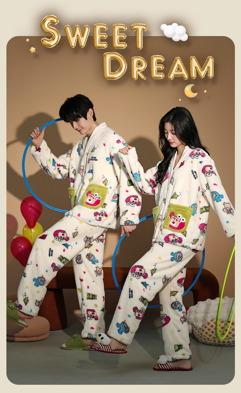 겨울 만화 커플 잠옷 여성 캐주얼 카디건 두꺼운 따뜻한 산호 양털 남성 홈 의류 세트