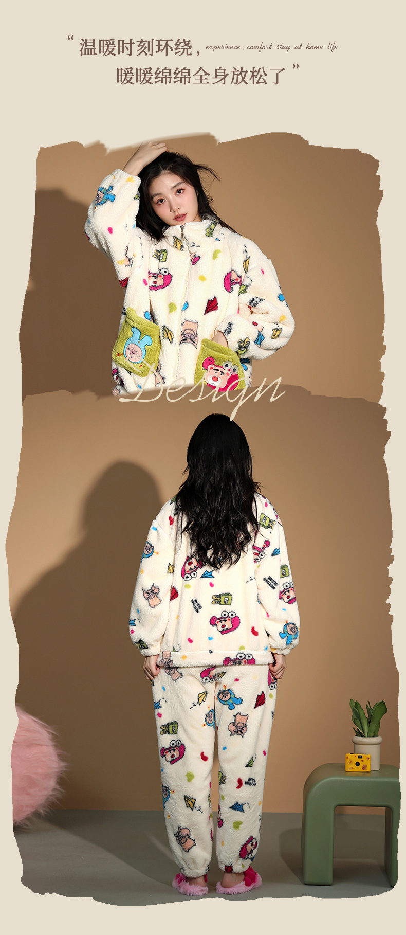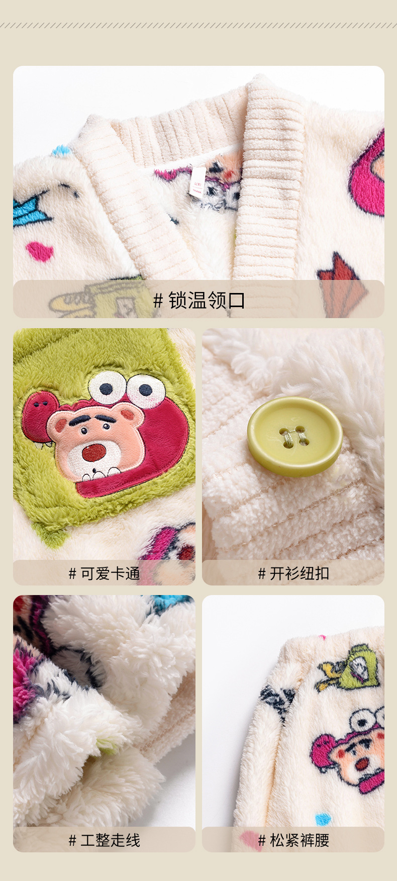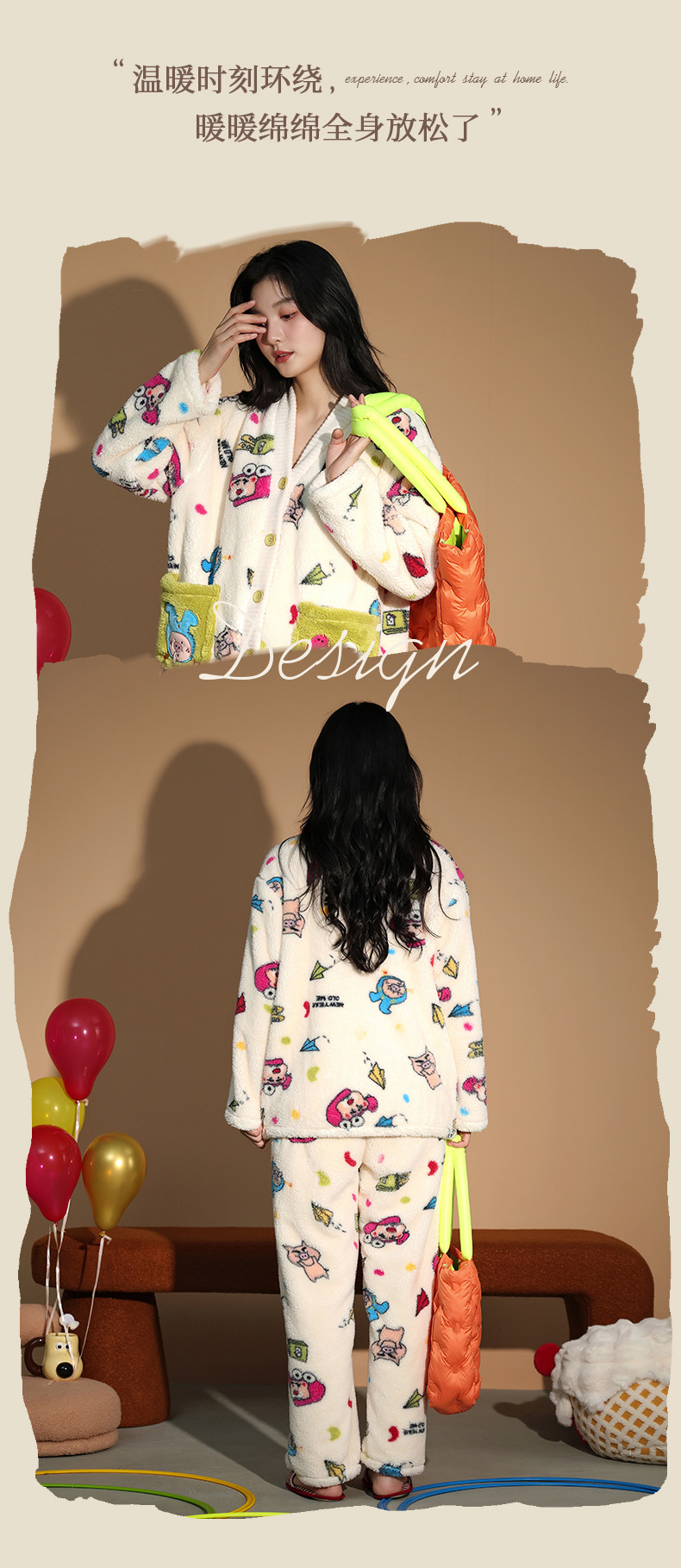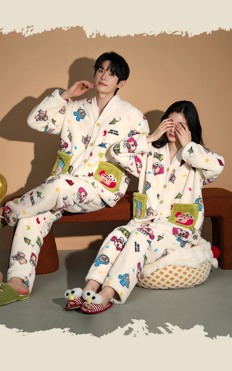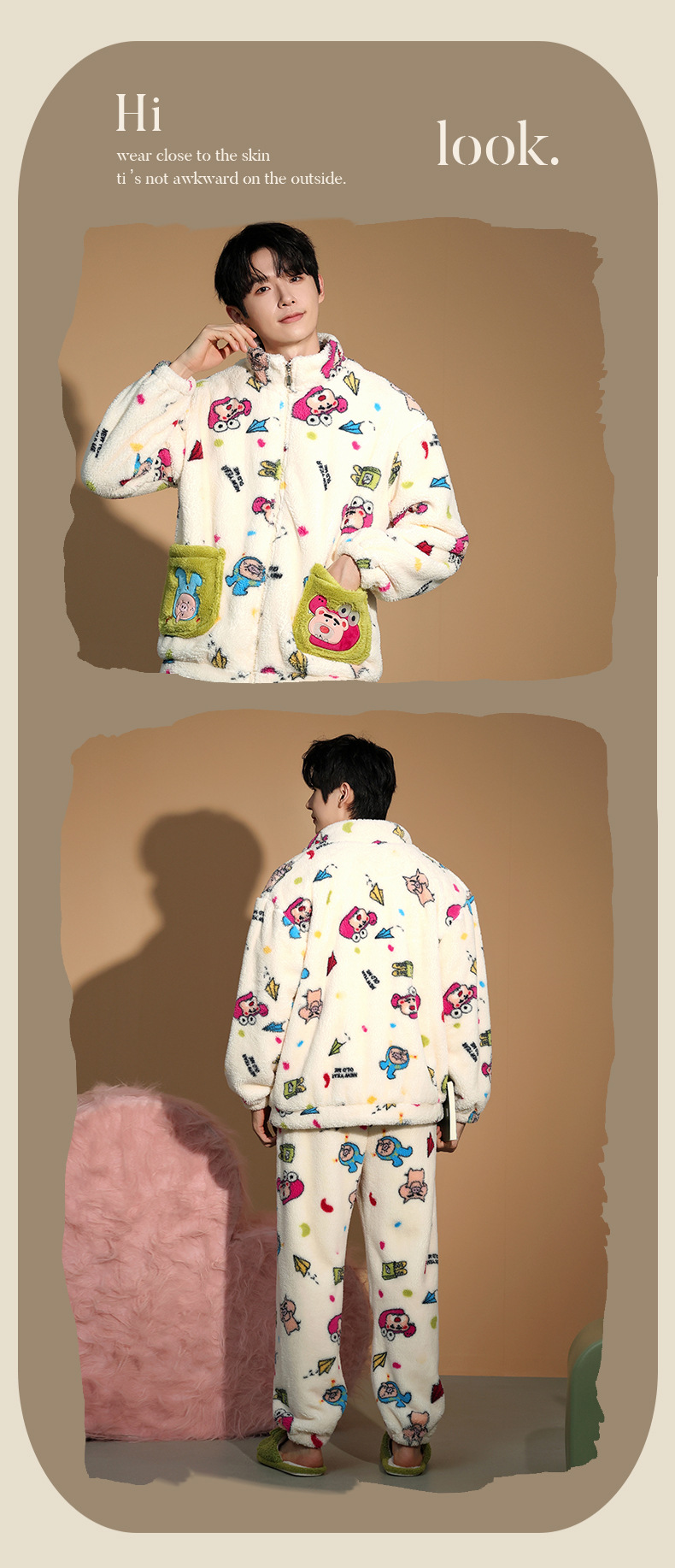 겨울 만화 커플 잠옷 여성 캐주얼 카디건 두꺼운 따뜻한 산호 양털 남성 홈 의류 세트