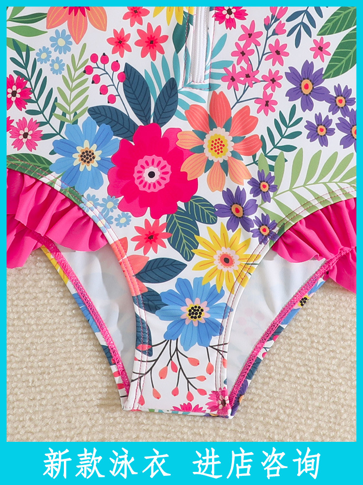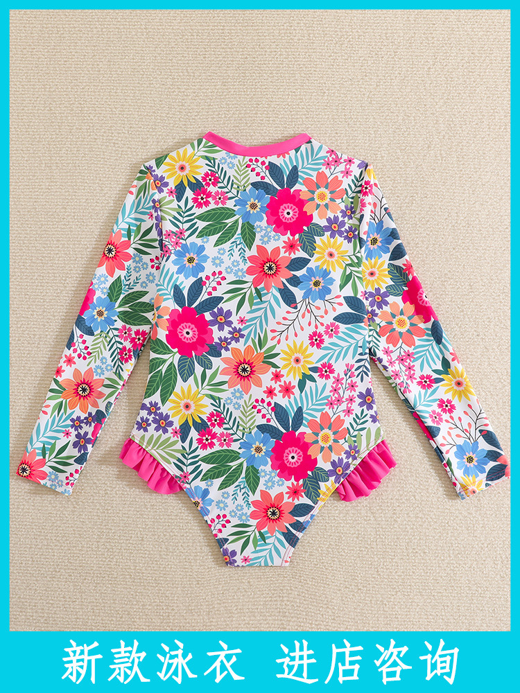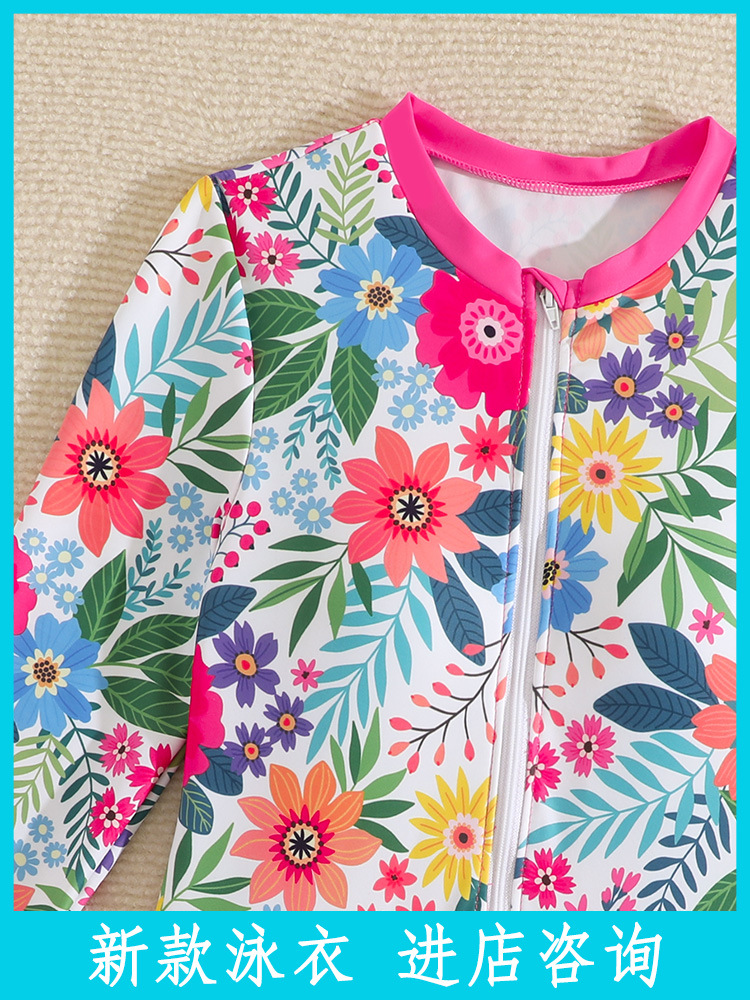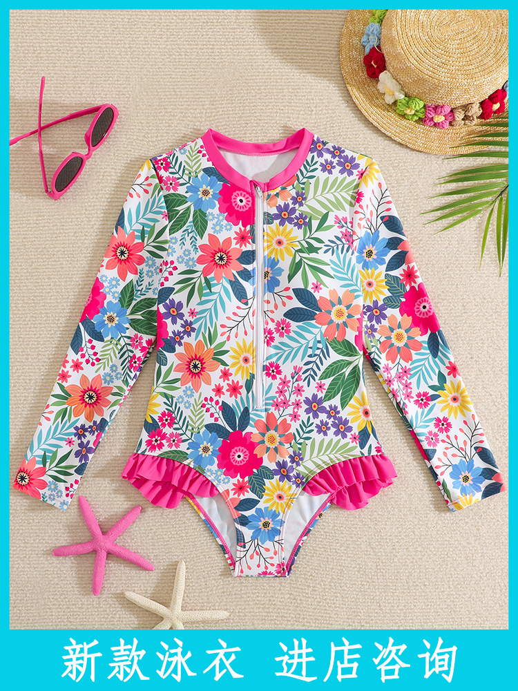 대외 무역 어린이 수영복 도매 대형 어린이 소녀 긴팔 선 스크린 인쇄 해변 온천 휴가 수영복스토어 가기