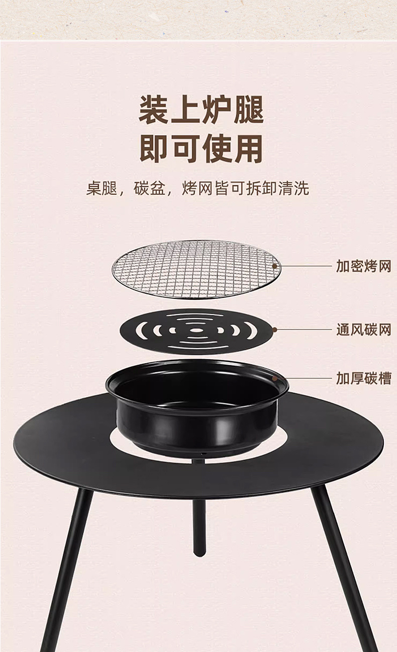 • 두꺼운 바베큐 테이블 + 대나무 숯 2.5kg개 + 연소 보조 알코올 4개 + 1.8L 주철 주전자 + 보관 가방