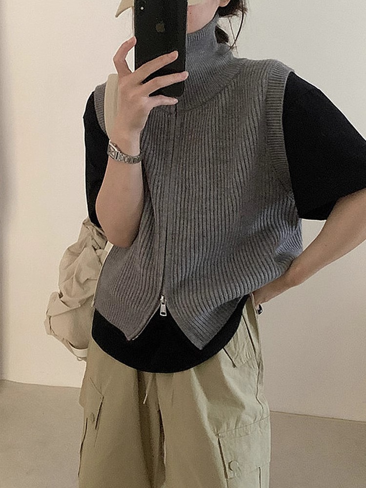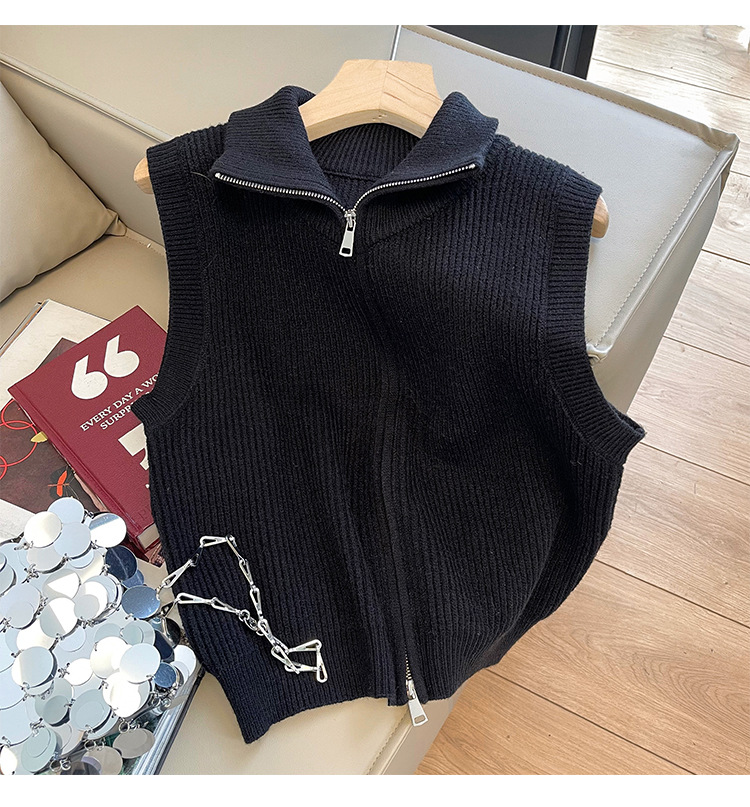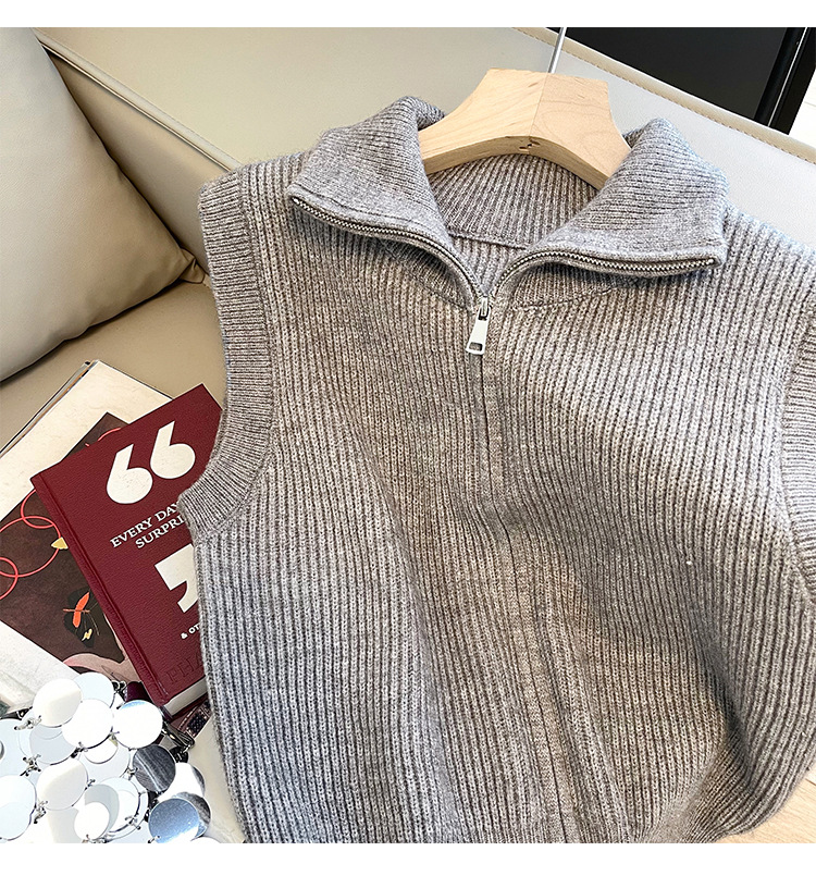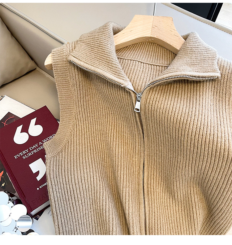 레트로 스타일 스탠드 칼라 니트 조끼 여성용 2025 가을 신상 디자인 심플한 지퍼 스웨터 조끼 트렌디