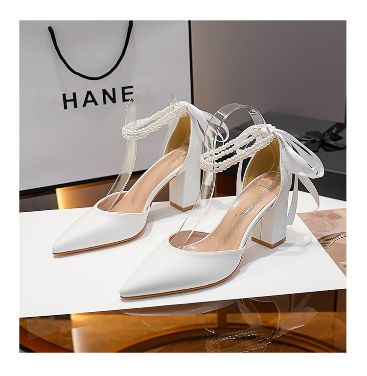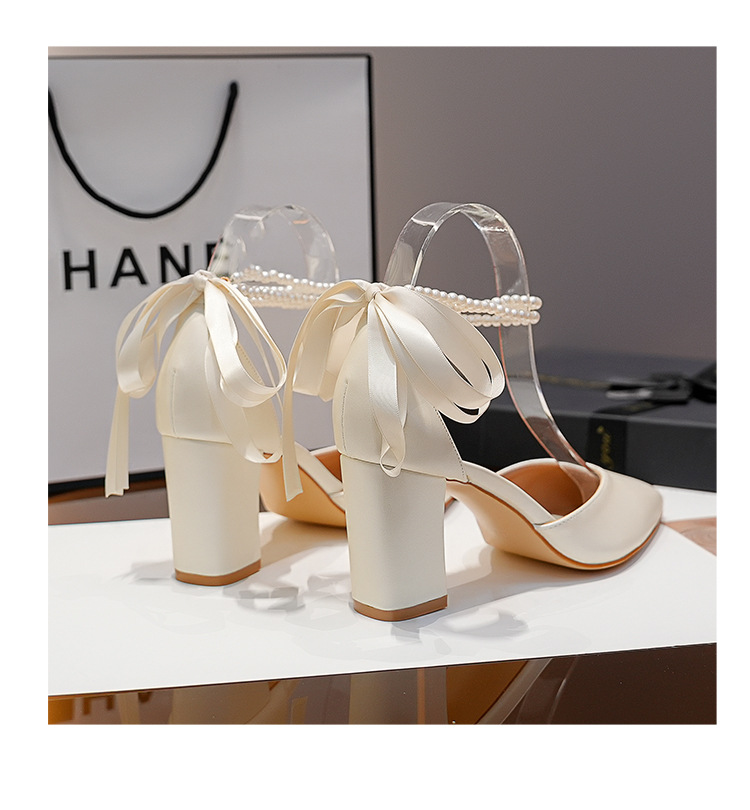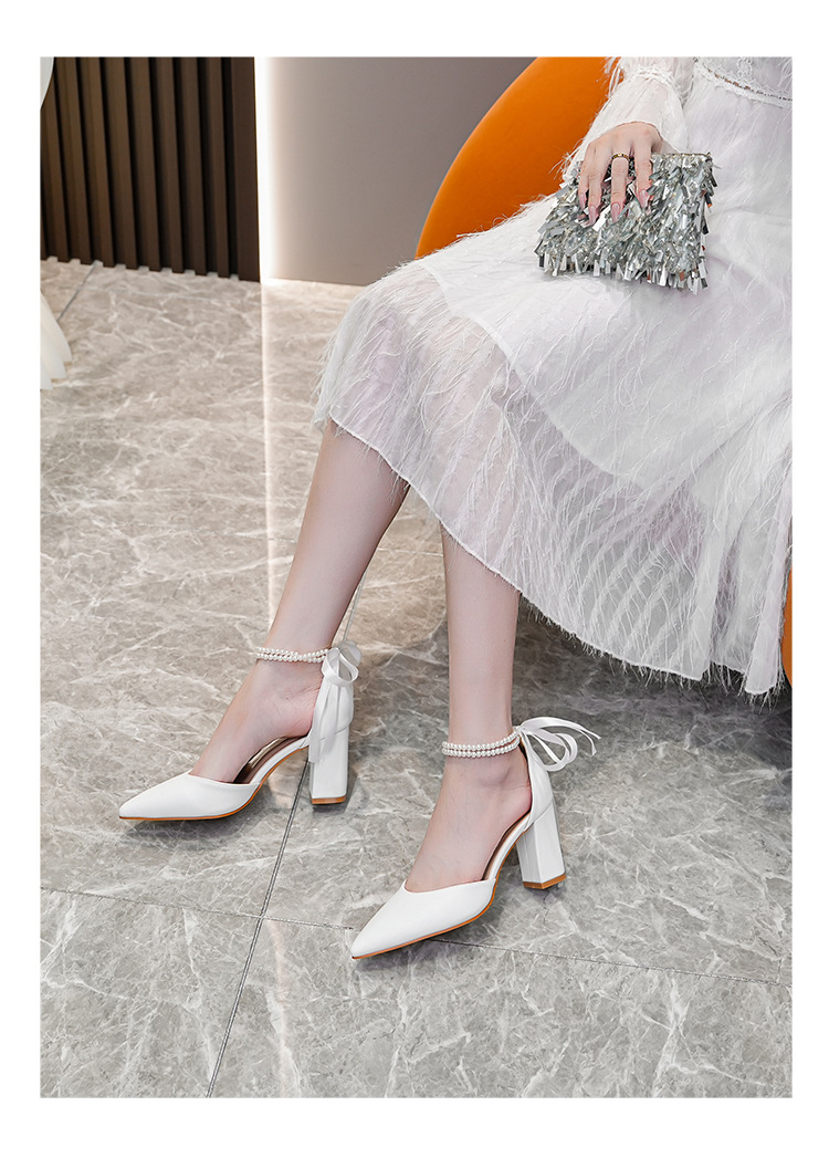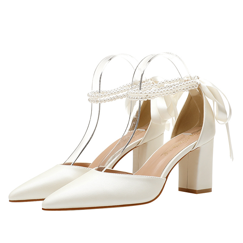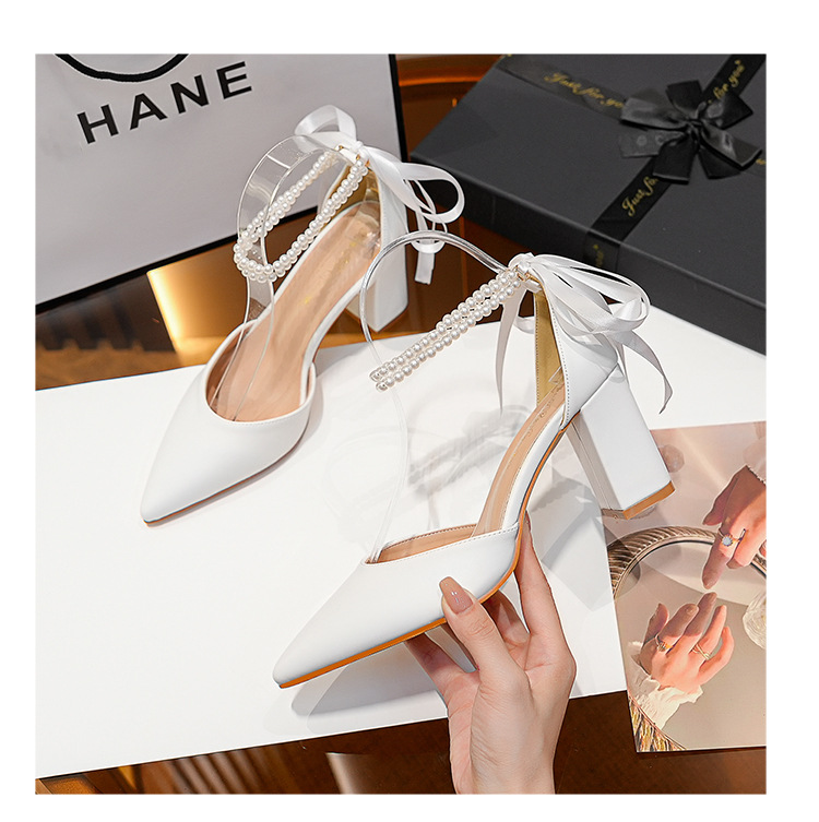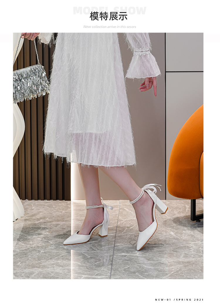 새로운 봄과 가을 결혼식 포인팅 여성 두꺼운 힐 펄 리본 유럽과 미국의 대외 무역 플러스 사이즈 화이트 여성 올 매치 여성 신발스토어 가기