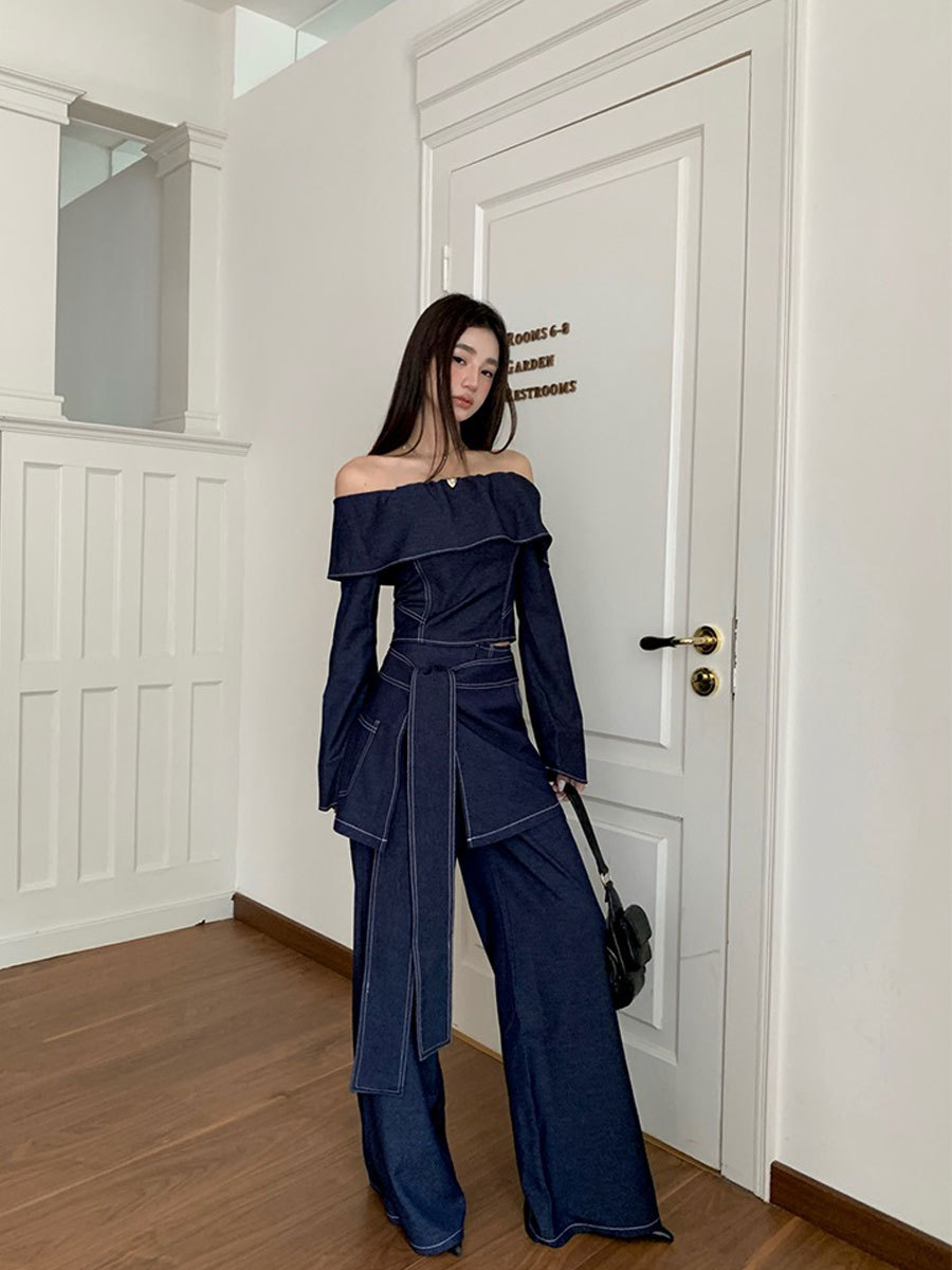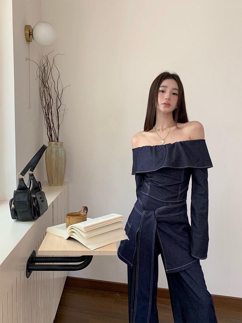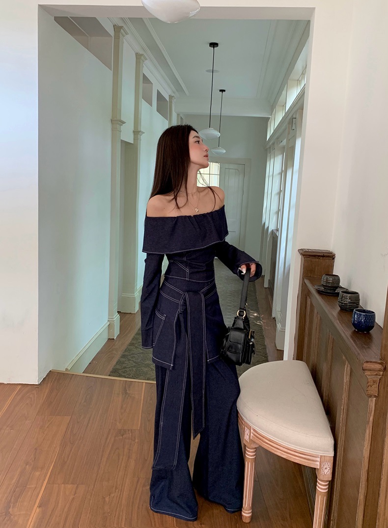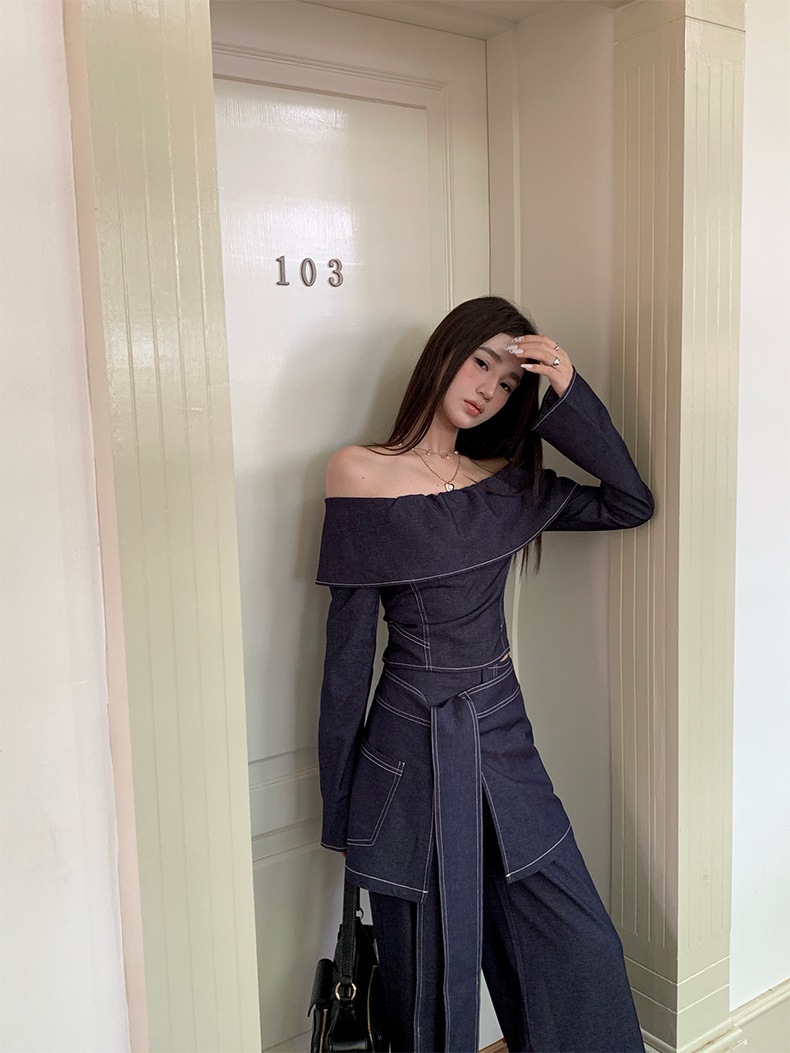 세트 여성 디자인 센스 틈새 한 캐릭터 칼라 긴팔 탑 하이 허리 와이드 레그 팬츠 아트 커튼 스파이스 소녀 캐주얼 3 피스 세트