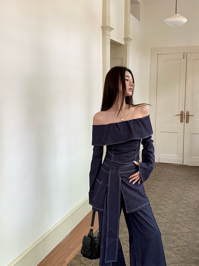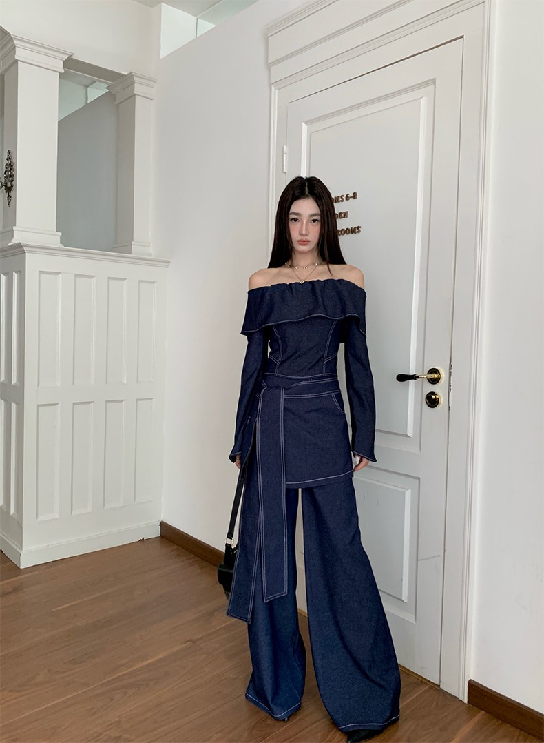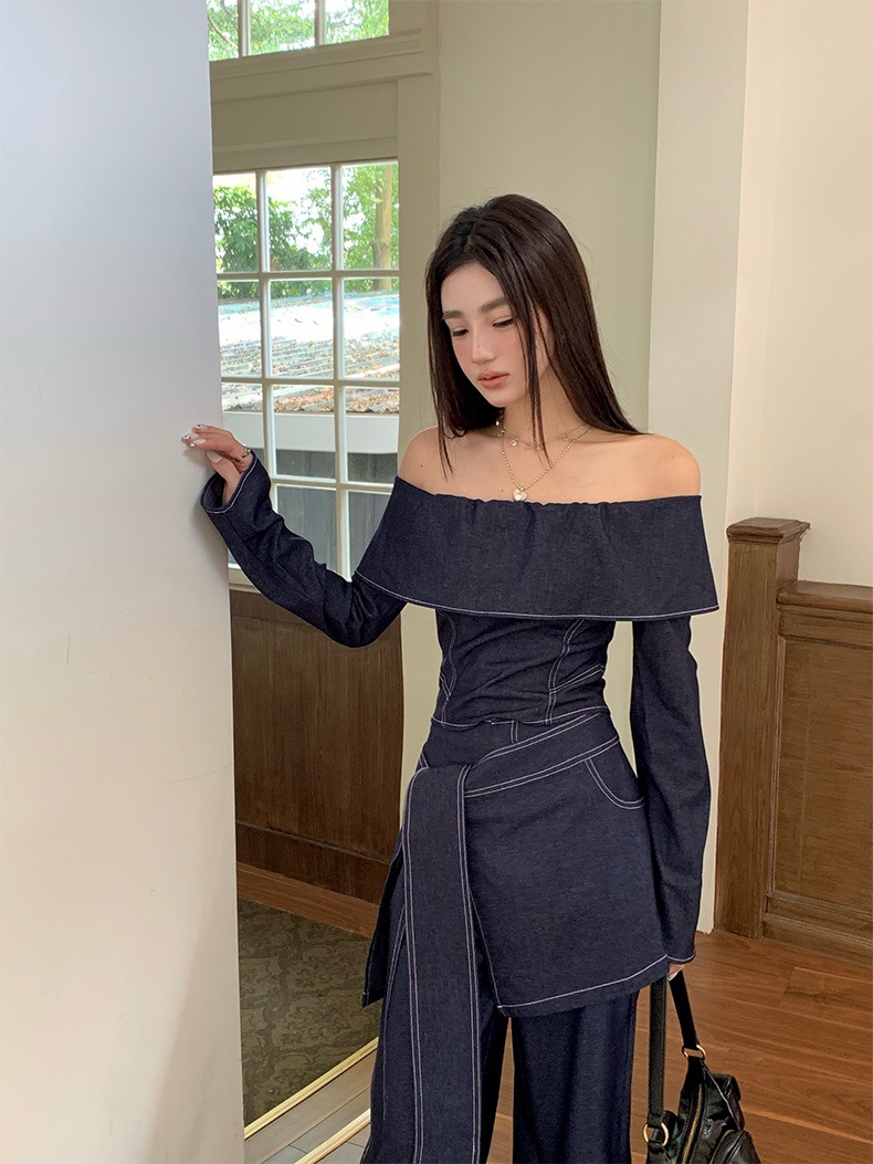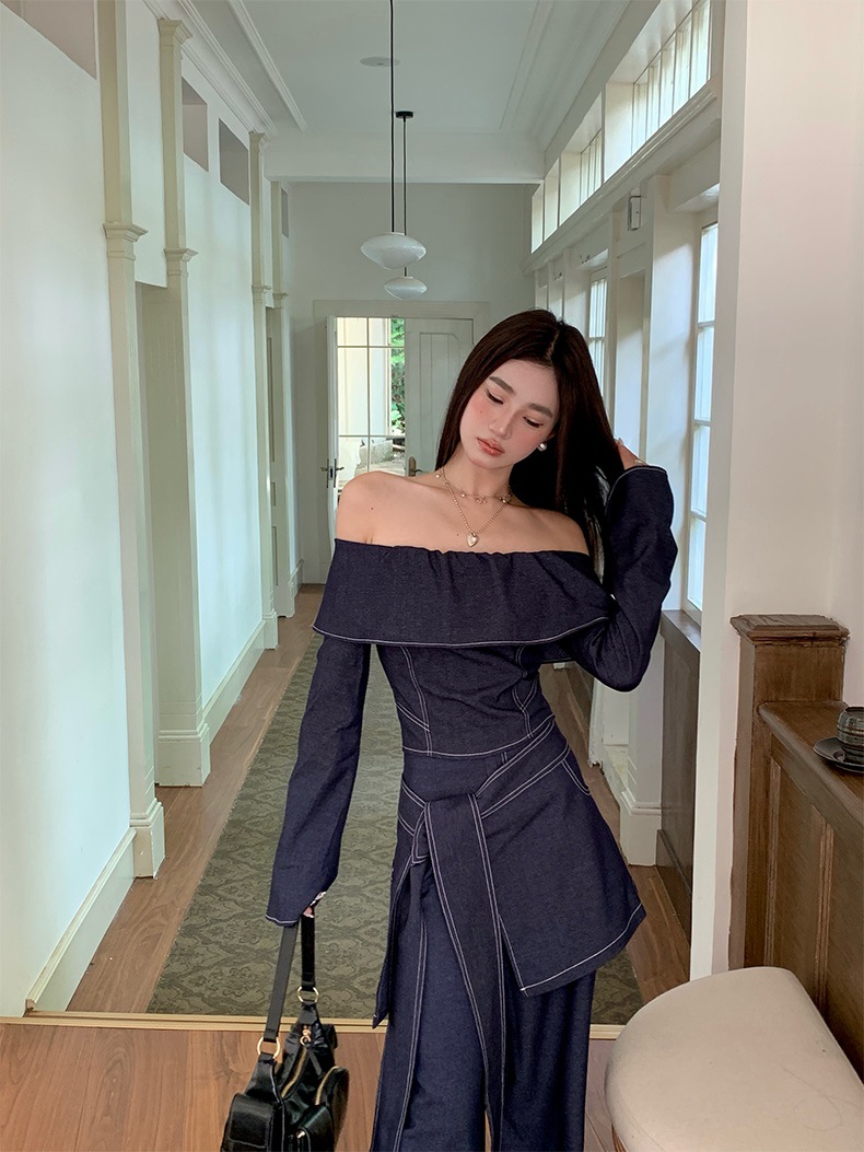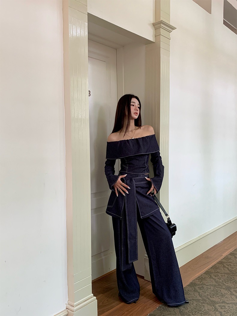 세트 여성 디자인 센스 틈새 한 캐릭터 칼라 긴팔 탑 하이 허리 와이드 레그 팬츠 아트 커튼 스파이스 소녀 캐주얼 3 피스 세트