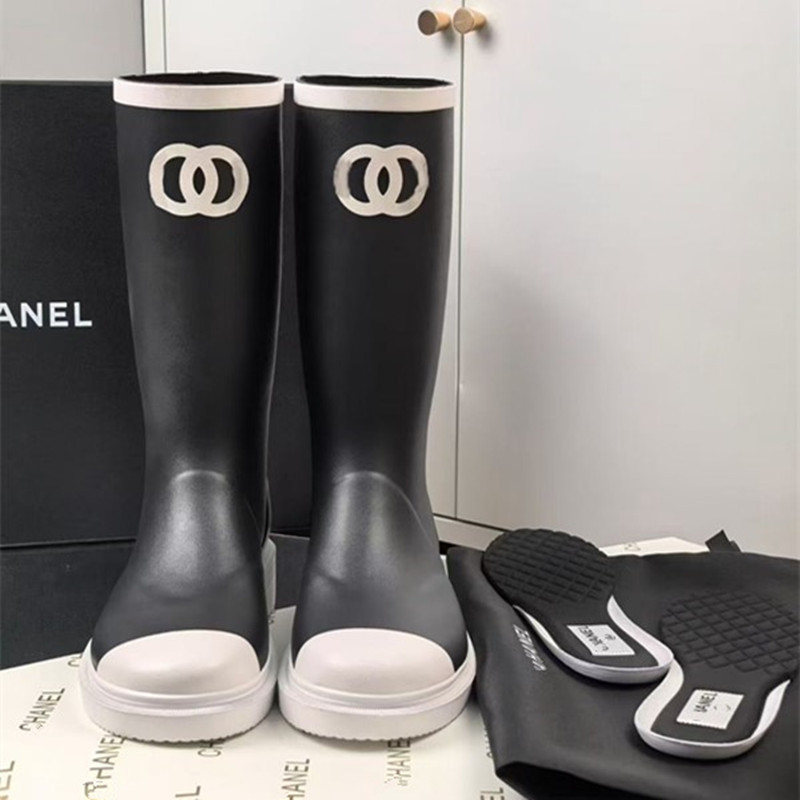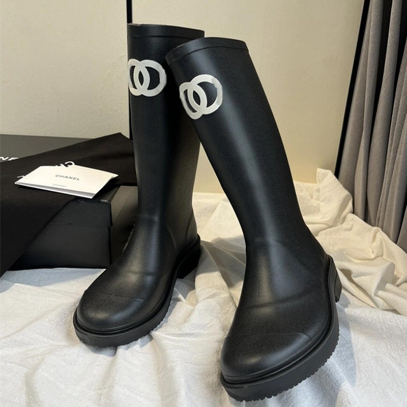 샤넬 스타일 라운드 헤드 두꺼운 하단 중간 높이 방수 장화 여성용 라이더 부츠 사이버 인기 유행 유행 블랙 그러나 무릎 롱 부츠스토어 가기
