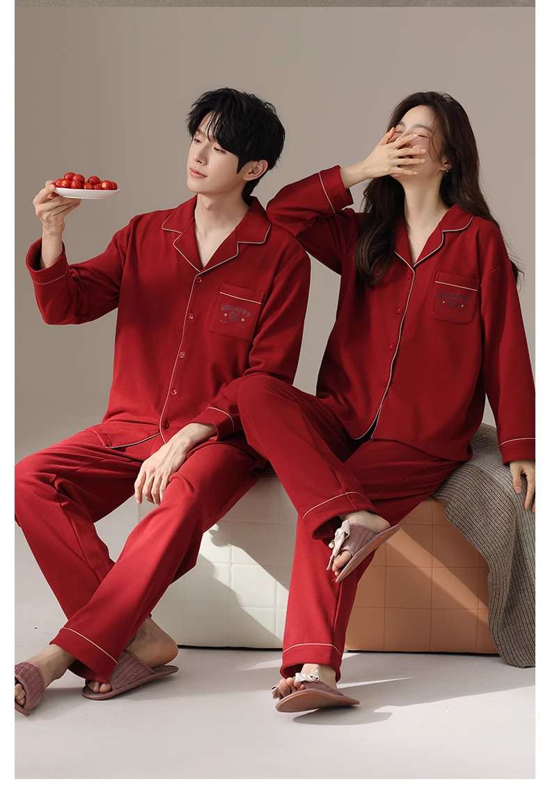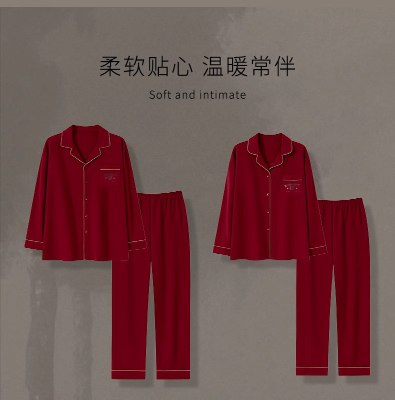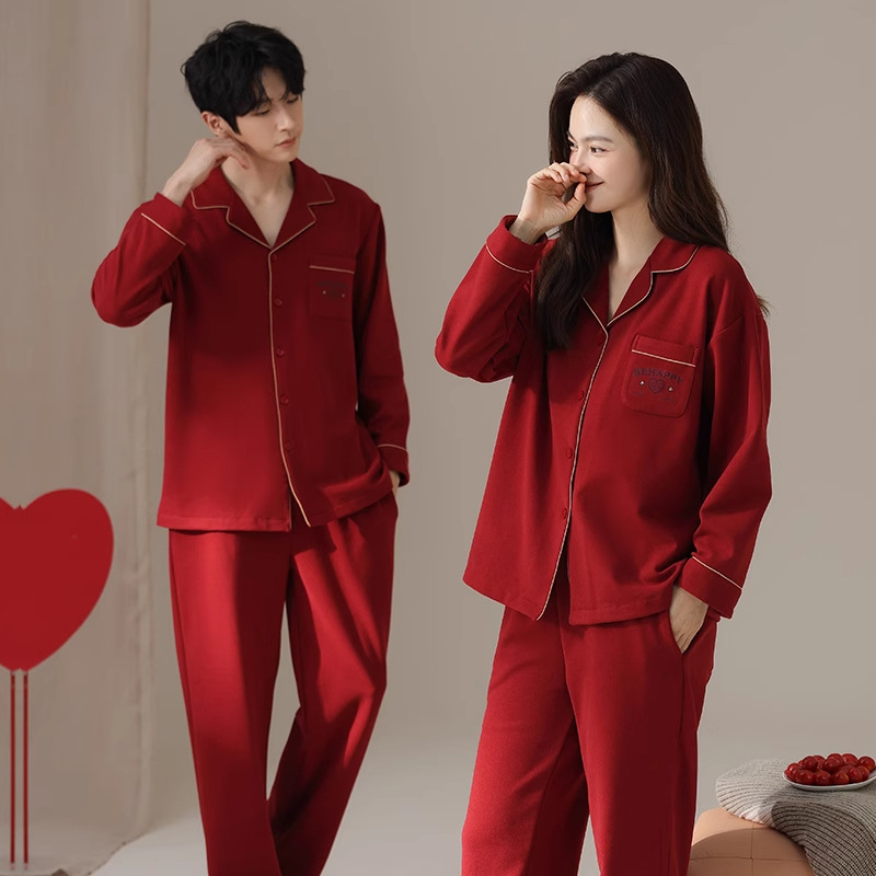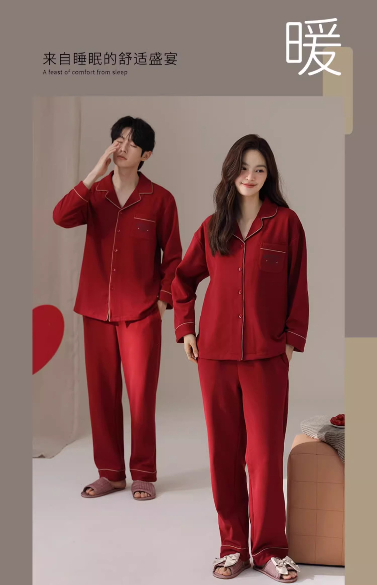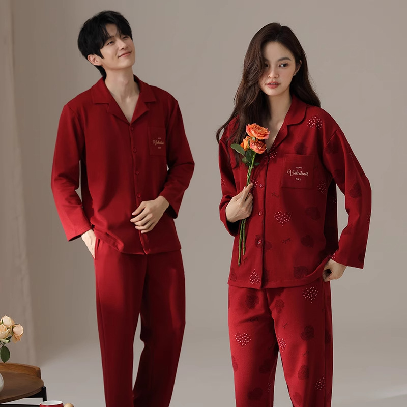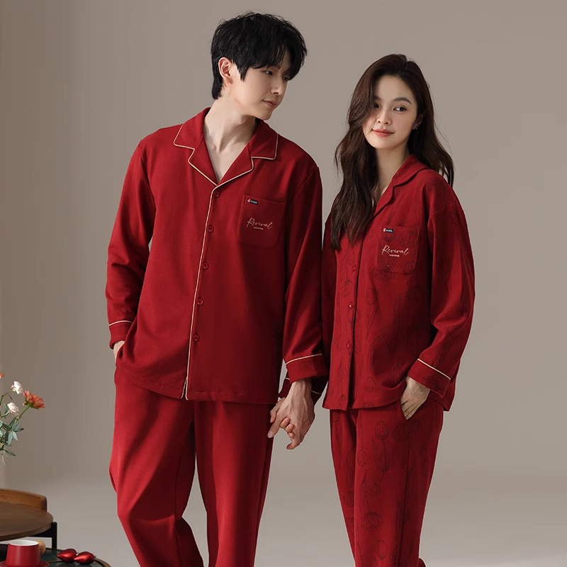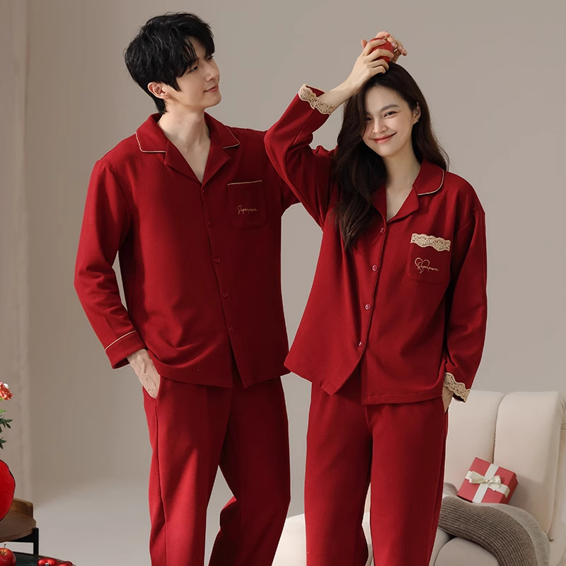 여성과 남성을위한 Longsha Red Pajamas 결혼식 신혼 부부 세트 벨벳 긴팔 기모 두꺼운 가을과 겨울 홈 옷스토어 가기