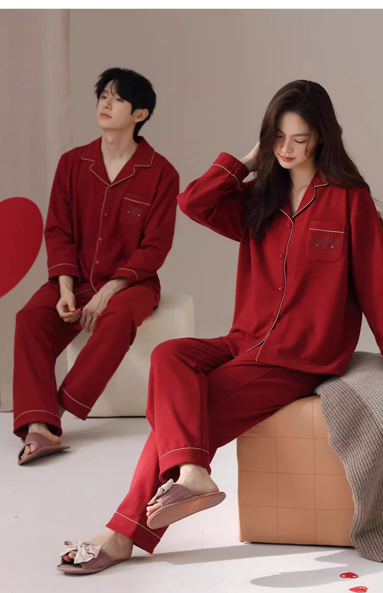 여성과 남성을위한 Longsha Red Pajamas 결혼식 신혼 부부 세트 벨벳 긴팔 기모 두꺼운 가을과 겨울 홈 옷