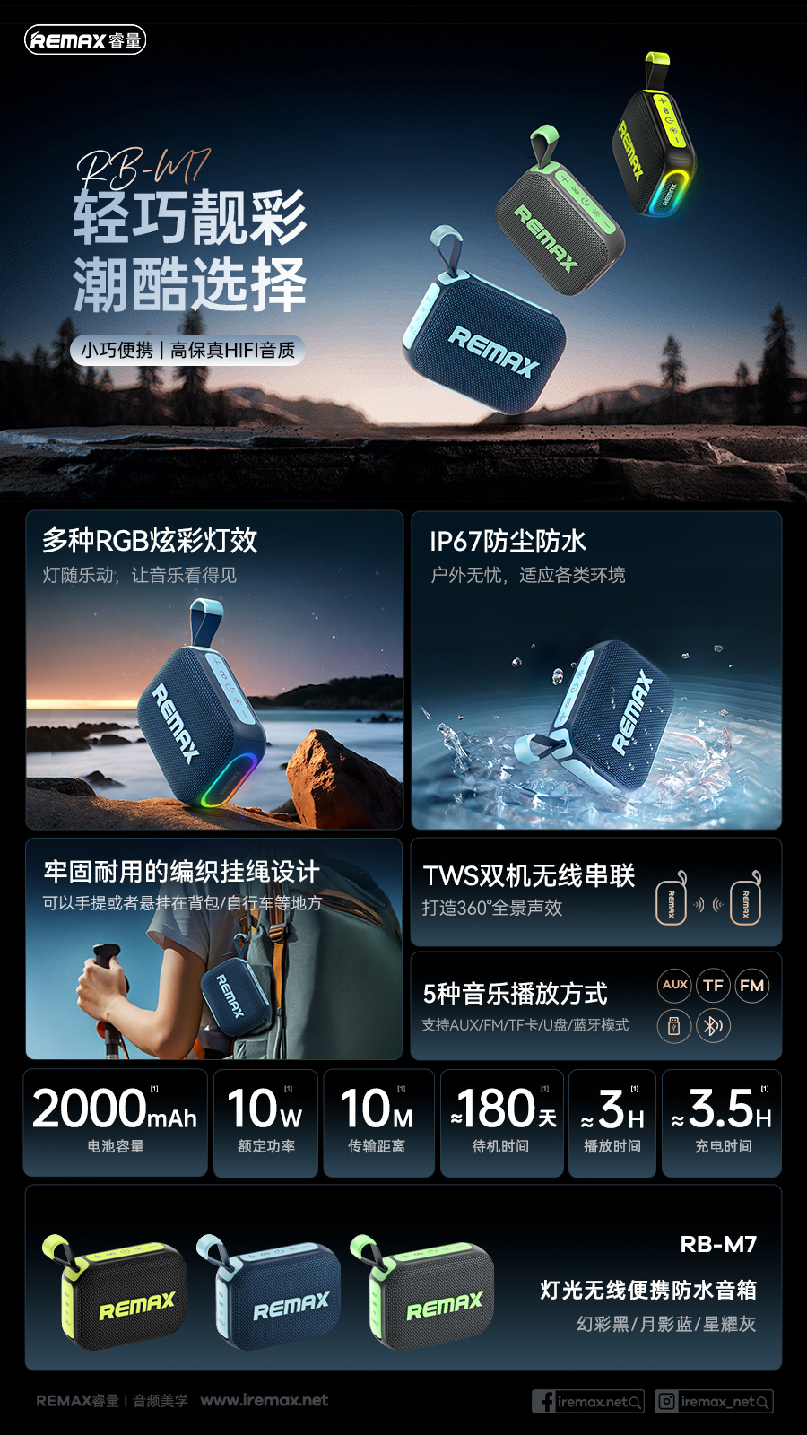 리맥스 아웃도어 스포츠 무선 블루투스 소형 스피커 휴대용 미니 IP67 방수 스피커 RGB 분위기 조명 포함
